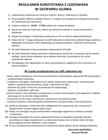 REGULAMIN KORZYSTANIA Z LODOWISKA W GEOPARKU GLINKA 1. Lodowiskiem administruje Centrum Kultury, Sportu i Rekreacji w Ujsołach 2. W przypadku obfitych opadów deszczu i śniegu oraz temperatury powietrza powyżej 6°C lodowisko jest nieczynne. 3. Godziny otwarcia: 10:00 – 17:00 codziennie, wstęp bezpłatny 4. Sprzęt we własnym zakresie, zaleca się założenie kasków w czasie korzystania z lodowiska 5. Każdy korzystający z lodowiska przebywa na nim na własną odpowiedzialność. 6. Dzieci do lat 7 mogą przebywać na tafli lodowiska w obecności pełnoletniego opiekuna będącego na łyżwach, który odpowiada za bezpieczeństwo i właściwe zachowanie dziecka. 7. Na tafli lodowiska może przebywać maksymalnie 10 osób. 8. Na tafli lodowiska należy zachować maksymalną ostrożność i stosować się do zaleceń obsługi. Jazda winna odbywać się w jednym kierunku ( przeciwnym do ruchu wskazówek zegara). 9. Zarządzający nie odpowiada za rzeczy pozostawione, zagubione lub zniszczone na terenie obiektu. W czasie przebywania na tafli zabrania się: - jazdy z kijem hokejowym lub innym przedmiotem stanowiącym zagrożenie dla pozostałych użytkowników lodowiska, - urządzania wyścigów, niebezpiecznych zabaw, potrącania, podcinania, wykonywania skoków i gwałtownych hamowań, jazdy z dzieckiem na ręku, - zabrania się jazdy w kierunku przeciwnym do nakazanego, - siadania na bandach, tafli lodu, - palenia tytoniu, picia alkoholu, przebywania w stanie nietrzeźwym, pod wpływem środków odurzających na terenie całego obiektu, - wnoszenia na lód napoi, pożywienia i spożywania ich podczas jazdy, - rzucania śnieżkami i jakimikolwiek przedmiotami, skuwania lodu i niszczenia band, 11. Każdy korzystający z lodowiska jest zobligowany do zapoznania się z powyższym regulaminem i przestrzegania jego zasad. 12. Osoby nie stosujące się do postanowień niniejszego regulaminu zostaną usunięte z lodowiska. 13. Zarządca lodowiska nie ponosi odpowiedzialności za wypadki zaistniałe wskutek czynników od niego niezależnych, za zdarzenia losowe oraz za braki, które nie były dostrzegalne pomimo dbałości o stan obiektu. 14. W celu uzyskania pierwszej pomocy medycznej należy zgłosić się do obsługi lodowiska. Kierownik GEOPARKU Ryszard Śleziak