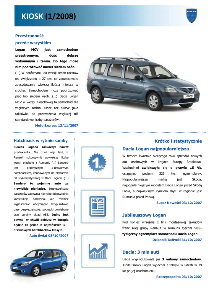 KIOSK (1/2008) Przestronność przede wszystkim Logan MCV jest przestronnym, samochodem dość dobrze wykonanym i tanim. Do tego moŜe nim podróŜować nawet siedem osób. (…) W porównaniu do wersji sedan rozstaw osi zwiększono o 27 cm, co zaowocowało zdecydowanie większą ilością miejsca w środku. Samochodem moŜe podróŜować pięć lub siedem osób. (…) Dacia Logan MCV w wersji 7-osobowej to samochód dla większych rodzin. MoŜe teŜ słuŜyć jako taksówka do przewoŜenia większej niŜ standardowo liczby pasaŜerów. Moto Express 13/11/2007 Hatchback w rytmie samby Sukces Logana zaskoczył nawet producenta. Nie dziwi więc fakt, iŜ Renault sukcesywnie powiększa liczbę Krótko i statystycznie Dacia Logan najpopularniejsza W trzecim kwartale bieŜącego roku sprzedaŜ nowych wersji przeboju z Rumunii. (…) Sandero aut jest Wschodniej zwiększyła się o prawie 15 %, praktycznym 5-drzwiowym osobowych hatchbackiem, zbudowanym na platformie osiągając B0 wykorzystywanej w Dacii Loganie (…) Najpopularniejszą Sandero to pojemne auto za niewielkie pieniądze. Bezpieczeństwo pasaŜerów zapewnia nie tylko odpowiednia konstrukcja nadwozia, wyposaŜenie obejmujące ale równieŜ w krajach poziom 325 marką Europy tys. Środkowo- egzemplarzy. jest Skoda, najpopularniejszym modelem Dacia Logan przed Skodą Fabia, a największym rynkiem zbytu w regionie jest Rumunia przed Polską. Super Nowości 03/12/2007 trzypunktowe pasy bezpieczeństwa, poduszki powietrzne oraz seryjny układ ABS. Jedno jest pewne: w chwili debiutu w Europie będzie to jeden z najtańszych 5 drzwiowych hatchbacków klasy B. Auto Świat 08/10/2007 Jubileuszowy Logan Pod koniec września z linii montaŜowej zakładów francuskiej grupy Renault w Rumunii zjechał 500tysięczny egzemplarz samochodu Dacia Logan. Dziennik Bałtycki 31/10/2007 Dacia: 3 mln aut! Dacia wyprodukowała juŜ 3 miliony samochodów. Jubileuszowy Logan wyjechał z fabryki w Pitesti w 39 lat po jej uruchomieniu. Rzeczpospolita 03/10/2007 KIOSK (1/2008) Jak feniks z popiołów Obszerny samochód w atrakcyjnej cenie nie potrzebuje specjalnej reklamy. A na dodatek nie jest brzydki. W przeciwieństwie do wielu rywali był od podstaw projektowany jako sedan, stąd do proporcji nadwozia nie moŜna mieć zastrzeŜeń. Samochód zadebiutował w roku 2004, dlatego podaŜ egzemplarzy uŜywanych jest jak na razie ograniczona. Najtańsze egzemplarze kosztują 17-19 tys. zł. (…) WysokopręŜne Logany trafiają do nas takŜe w ramach prywatnego importu. Na podaŜ części mechanicznych do Logana nie moŜna narzekać samochód bazuje w końcu na gotowych rozwiązaniach Renault. Motor 19/11/2007 Sto tysięcy km bez zadyszki! SłuŜba „na taksówce" stawia przed samochodem szczególne wymagania. Przede wszystkim musi być bezawaryjny - kaŜdy postój w warsztacie to przerwa w pracy i podwójna strata pieniędzy. Pan Paweł, taksówkarz z Warszawy, dwa lata temu postanowił zaufać debiutującej wówczas Dacii Logan „Potrzebowałem przede wszystkim dobrego i taniego w eksploatacji narzędzia pracy. Wybrałem Logana, bo miał przystępną cenę i prostą konstrukcję opartą na technice Renault". Z podobnego powodu postanowiło zaufać nowej Dacii wiele innych osób. Większość z nich kupiła Logana, bo był po prostu tani. Z pewnością, gdyby za produkcją współczesnej Dacii nie stał francuski koncern, sama niska cena nie zapewniłaby dobrej sprzedaŜy. Renault po przejęciu rumuńskiej fabryki postanowił rozpocząć tam produkcję prostego i taniego auta, przeznaczonego głównie na rynki środkowej i wschodniej Europy. Dla odróŜnienia od nowoczesnych modeli Renault pozostawiono nazwę. (…) Nie Ŝałuję wyboru Dacii Logan, spełniła bowiem wszystkie moje oczekiwania. Nie jest kosztowna w utrzymaniu, a prosta konstrukcja pozwala wykonać większość czynności obsługowych samemu. Myślę, Ŝe przy mniej intensywnej eksploatacji niŜ u mnie moŜe być to pewne auto na długie lata. (…) Wiele osób jadących Loganem pierwszy raz jest zaskoczonych ilością miejsca w środku - mówi pan Paweł. Sporo przestrzeni oferuje teŜ 510 - litrowy bagaŜnik. (…) Auto nie ulega powaŜnym awariom, a jeśli juŜ coś się stanie, to naprawy moŜe podjąć się kaŜdy mechanik - nie będzie ona kosztowna. Zaufanie do tego modelu wzbudza układ napędowy pochodzący z Renault. Zwłaszcza nieskomplikowany silnik 1.4, który udaną konstrukcję zdąŜył juŜ udowodnić, słuŜąc w kilku popularnych modelach. Auto Świat 29/10/2007 KIOSK (1/2008) Dacia Logan więcej czadu! Od września moŜna kupić Logana z mocniejszym wariantem, 85 KM. Moment wzrósł ze 160 Nm do 200 Nm. RóŜnica w osiągach powinna być odczuwalna, 85-konny sedan przyspiesza do setki w 13 s, 68-konny w 15 s. Giełda Samochodowa 19/10/2007 Logan przyjazny środowisku Spalanie zaledwie 2,72 l paliwa na 100 kilometrów to znakomity wynik. Podczas tegorocznego Michelin Challenge Bibendum zaprezentowano Dacię Logan w koncepcyjnej wersji eco2. Dzięki wprowadzonym usprawnieniom silnika i skrzyni biegów, samochód z dieslem 1,5 dCi/85 KM zuŜywa średnio zaledwie 2,72 l paliwa na 100 km. Nie bez znaczenia jest przy tym poprawiona aerodynamika (zmieniony kształt przedniego zderzaka, dodatkowe spojlery, przeprojektowane felgi). Polska – Dziennik Bałtycki 27/12/2007 Dacia Logan pick up Kombivan bez podatku VAT Dacia uzupełni wkrótce gamę modelu Zewnętrznie cięŜarowy Logan wygląda jak wersja osobowa. Gdy wiosną Logan o wersję pick up. Renault wprowadzał na rynek Dacię Logan MCV, zapowiadał, Ŝe Skonstruowane głównie z myślą o małych jesienią firmach auto posiada wszystkie zalety dotrzymał. Od września Logan MCV oferowany jest w pięciu wersjach z Logana, który jest juŜ oferowany w homologacją cięŜarową. odmianach: sedan, kombi i dostawczej. Wersje te są dobrym rozwiązaniem dla klientów, którzy potrzebują Echo Dnia 01/10/2007 będzie teŜ dostępna