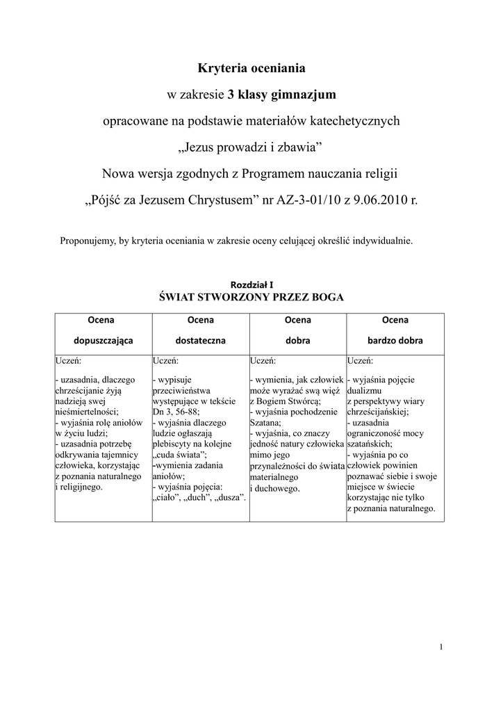 Kryteria oceniania w zakresie 3 klasy gimnazjum opracowane na podstawie materiałów katechetycznych „Jezus prowadzi i zbawia” Nowa wersja zgodnych z Programem nauczania religii „Pójść za Jezusem Chrystusem” nr AZ-3-01/10 z 9.06.2010 r. Proponujemy, by kryteria oceniania w zakresie oceny celującej określić indywidualnie. Rozdział I ŚWIAT STWORZONY PRZEZ BOGA Ocena Ocena Ocena Ocena dopuszczająca dostateczna dobra bardzo dobra Uczeń: Uczeń: Uczeń: Uczeń: - uzasadnia, dlaczego chrześcijanie żyją nadzieją swej nieśmiertelności; - wyjaśnia rolę aniołów w życiu ludzi; - uzasadnia potrzebę odkrywania tajemnicy człowieka, korzystając z poznania naturalnego i religijnego. - wypisuje przeciwieństwa występujące w tekście Dn 3, 56-88; - wyjaśnia dlaczego ludzie ogłaszają plebiscyty na kolejne „cuda świata”; -wymienia zadania aniołów; - wyjaśnia pojęcia: „ciało”, „duch”, „dusza”. - wymienia, jak człowiek - wyjaśnia pojęcie może wyrażać swą więź dualizmu z Bogiem Stwórcą; z perspektywy wiary - wyjaśnia pochodzenie chrześcijańskiej; Szatana; - uzasadnia - wyjaśnia, co znaczy ograniczoność mocy jedność natury człowieka szatańskich; mimo jego - wyjaśnia po co przynależności do świata człowiek powinien poznawać siebie i swoje materialnego miejsce w świecie i duchowego. korzystając nie tylko z poznania naturalnego. 1 Rozdział II ŚWIAT KSZTAŁTOWANY PRZEZ CZŁOWIEKA Ocena Ocena Ocena Ocena dopuszczająca dostateczna dobra bardzo dobra Uczeń: Uczeń: Uczeń: - podaje w jaki sposób można sobie pomóc - interpretuje przypowieść w rozwijaniu talentów; o talentach - dokonuje rozróżnienia (Mt 25,14-30); - wyjaśnia religijne między samowolą znaczenie pojęcia i wolnością; „wolność”; - wyjaśnia dlaczego - definiuje pojęcia: gospodarz z biblijnej przypowieści o talentach „moralność”, „prawo (Mt 25, 14-30) był tak naturalne”, „prawo oburzony na sługę, który objawione”; - charakteryzuje proces zakopał w ziemi powierzony mu talent; stawania się dojrzałym; - charakteryzuje - definiuje pojęcie modlitwę różańcową. dojrzałości; - uzasadnia niewystarczalność wysiłków człowieka w osiąganiu dojrzałości; - wymienia tajemnice różańca. Uczeń: - wyjaśnia związek - uzasadnia, że pomiędzy przypowieścią rozwijanie posiadanych o talentach i poleceniem: talentów jest „Czyńcie sobie ziemię przejmowaniem poddaną”; odpowiedzialności za - uzasadnia, że człowiek siebie, innych i świat; mimo uwikłania - podaje propozycje w grzech posiada pomysłów co robić by zdolność do właściwego w jego najbliższym korzystania środowisku nie z wolności; dochodziło do - wyjaśnia różnicę nadużywania wolności pomiędzy prawem i uprawiania samowoli; Starego i Nowego - uzasadnia konieczność Testamentu; respektowania prawa - interpretuje moralnego; przypowieść - uzasadnia o talentach niewystarczalność (Mt 25, 14-30) wysiłków człowieka w kontekście dojrzałości; w osiąganiu dojrzałości; -interpretuje symbolikę - uzasadnia potrzebę koronki. modlitwy różańcowej. Rozdział III KOŚCIÓŁ W ŚWIECIE Ocena dopuszczająca Ocena Ocena Ocena dostateczna dobra bardzo dobra Uczeń: Uczeń: Uczeń: Uczeń: - wyjaśnia dlaczego ludzie organizują akcje dobroczynne; - wie w czym powinno - interpretuje przypowieść o nieuczciwym rządcy (Łk 16,1-12); - wyjaśnia, w czym - uzasadnia potrzebę wyraża się powszechność kierowania się Kościoła; nauczaniem Kościoła - uzasadnia potrzebę w życiu chrześcijańskim; 2 się wyrażać - rozróżnia uroczystość chrześcijańskie Wszystkich Świętych od świętowanie uroczystości Dnia Zadusznego; Wszystkich Świętych - wyjaśnia, co stanowi i Dnia Zadusznego; podstawę związków - wymienia formy troski Kościoła z kulturą; - uzasadnia konieczność Kościoła o rozwój rozwoju cywilizacji; kultury; - wyjaśnia czym - wyjaśnia charakteryzuje się niebezpieczeństwa czynienie dążenia do związane z rozwojem szczęścia motorem cywilizacji; ludzkiego życia; - kojarzy znaczenie - wyjaśnia potrzebę pojęć: „fanatyzm”, zdobywania wiedzy „nietolerancja”, „obojętność religijna”; religijnej w celu kształtowania drogi do - na podstawie treści szczęścia; słuchowiska wyjaśnia dlaczego ludziom trudno - uzasadnia potrzebę religijnego obchodzenia uwierzyć, że Pan Bóg Świąt Bożego chce ich szczęścia; Narodzenia; - uzasadnia potrzebę - interpretuje zdanie: współpracy z Bogiem w realizacji życiowych „Pozyskujcie sobie przyjaciół niegodziwą zadań. mamoną, aby gdy [wszystko] się skończy, przyjęto was do wiecznych przybytków” (Łk 16, 9) wykonując w grupie kolaż. obchodzenia uroczystości - charakteryzuje więź Wszystkich Świętych łączącą Kościół i Dnia Zadusznego; pielgrzymujący - uzasadnia potrzebę z Kościołem istnienia kultury uwielbionym i będącym materialnej i duchowej; w oczyszczeniu; - określa stosunek - wyjaśnia związek Kościoła do rozwoju pomiędzy treścią cywilizacji; Objawienia i kulturą - uzasadnia, że wyrażaną w różnych chrześcijanin nie może formach; przyjmować postawy - proponuje co możemy fanatyzmu, nietolerancji zrobić, by określenie i obojętności religijnej; „cywilizacja miłości” nie - wyjaśnia, w jaki sposób było tylko hasłem Kościół pomaga reklamowym; wierzącym odkrywać - uzasadnia, że religijne prawdę, że Bóg pragnie przeżywanie Adwentu szczęścia wszystkich pomaga człowiekowi ludzi; ustrzec się przed - wyjaśnia rolę Kościoła fanatyzmem, w ukazywaniu nietolerancją możliwości religijnego i obojętnością religijną; przeżywania życia. - uzasadnia aktualność tajemnicy Bożego Narodzenia; - wyjaśnia przesłanie dla chrześcijańskiego życia wykorzystując kolaż. Rozdział IV POZNAJĘ SIEBIE Ocena dopuszczająca Ocena Ocena Ocena dostateczna dobra bardzo dobra Uczeń: Uczeń: Uczeń: U