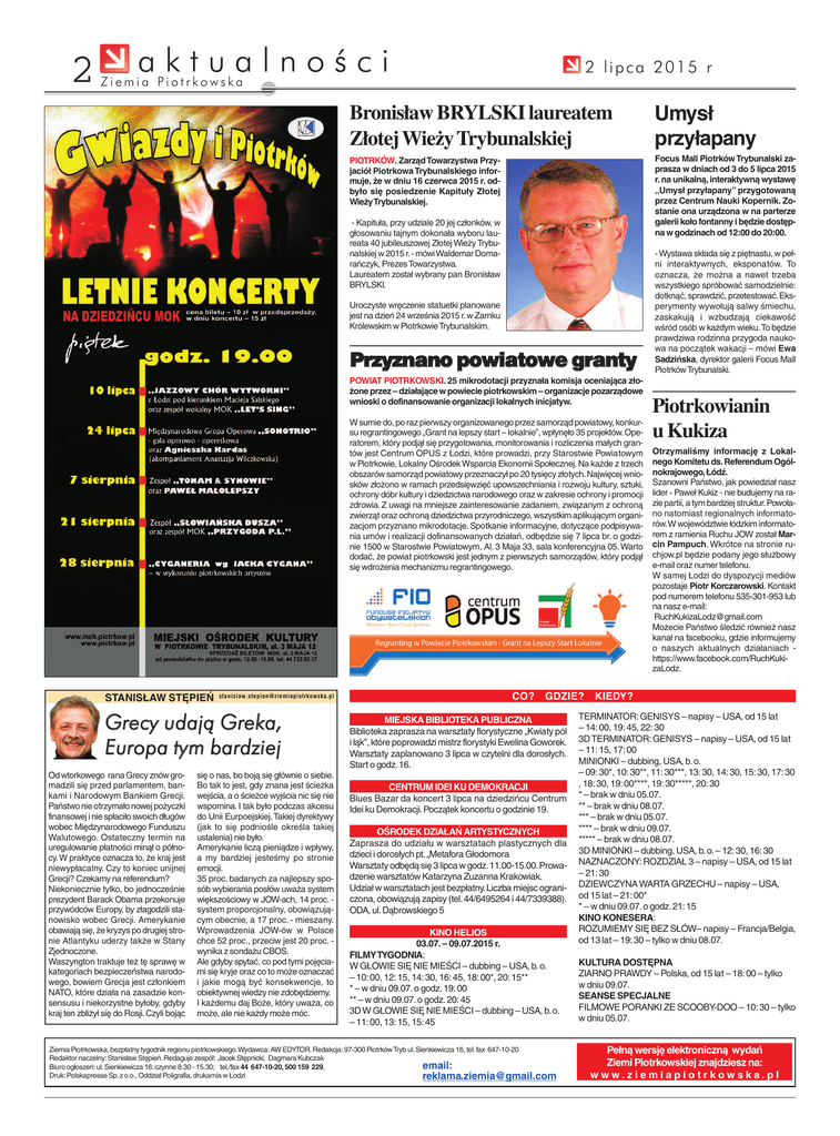 2 aktualności 2 lipca 2015 r Ziemia Piotrkowska Bronisław BRYLSKI laureatem Złotej Wieży Trybunalskiej Umysł przyłapany PIOTRKÓW. Zarząd Towarzystwa Przyjaciół Piotrkowa Trybunalskiego informuje, że w dniu 16 czerwca 2015 r. odbyło się posiedzenie Kapituły Złotej Wieży Trybunalskiej. Focus Mall Piotrków Trybunalski zaprasza w dniach od 3 do 5 lipca 2015 r. na unikalną, interaktywną wystawę „Umysł przyłapany” przygotowaną przez Centrum Nauki Kopernik. Zostanie ona urządzona w na parterze galerii koło fontanny i będzie dostępna w godzinach od 12:00 do 20:00. - Kapituła, przy udziale 20 jej członków, w głosowaniu tajnym dokonała wyboru laureata 40 jubileuszowej Złotej Wieży Trybunalskiej w 2015 r.- mówi Waldemar Domarańczyk, Prezes Towarzystwa. Laureatem został wybrany pan Bronisław BRYLSKI. Uroczyste wręczenie statuetki planowane jest na dzień 24 września 2015 r. w Zamku Królewskim w Piotrkowie Trybunalskim. Przyznano powiatowe granty POWIAT PIOTRKOWSKI. 25 mikrodotacji przyznała komisja oceniająca złożone przez – działające w powiecie piotrkowskim – organizacje pozarządowe wnioski o dofinansowanie organizacji lokalnych inicjatyw. W sumie do, po raz pierwszy organizowanego przez samorząd powiatowy, konkursu regrantingowego „Grant na lepszy start – lokalnie”, wpłynęło 35 projektów. Operatorem, który podjął się przygotowania, monitorowania i rozliczenia małych grantów jest Centrum OPUS z Łodzi, które prowadzi, przy Starostwie Powiatowym w Piotrkowie, Lokalny Ośrodek Wsparcia Ekonomii Społecznej. Na każde z trzech obszarów samorząd powiatowy przeznaczył po 20 tysięcy złotych.Najwięcej wniosków złożono w ramach przedsięwzięć upowszechniania i rozwoju kultury, sztuki, ochrony dóbr kultury i dziedzictwa narodowego oraz w zakresie ochrony i promocji zdrowia. Z uwagi na mniejsze zainteresowanie zadaniem, związanym z ochroną zwierząt oraz ochroną dziedzictwa przyrodniczego, wszystkim aplikującym organizacjom przyznano mikrodotacje. Spotkanie informacyjne, dotyczące podpisywania umów i realizacji dofinansowanych działań, odbędzie się 7 lipca br. o godzinie 1500 w Starostwie Powiatowym, Al. 3 Maja 33, sala konferencyjna 05. Warto dodać, że powiat piotrkowski jest jednym z pierwszych samorządów, który podjął się wdrożenia mechanizmu regrantingowego. STANISŁA W STĘPIEŃ STANISŁAW [email protected] Gre cy ud ają G re ka , Euro p a tym ba rd ziej Od wtorkowego rana Grecy znów gromadzili się przed parlamentem, bankami i Narodowym Bankiem Grecji. Państwo nie otrzymało nowej pożyczki finansowej i nie spłaciło swoich długów wobec Międzynarodowego Funduszu Walutowego. Ostateczny termin na uregulowanie płatności minął o północy. W praktyce oznacza to, że kraj jest niewypłacalny. Czy to koniec unijnej Grecji? Czekamy na referendum? Niekoniecznie tylko, bo jednocześnie prezydent Barack Obama przekonuje przywódców Europy, by złagodzili stanowisko wobec Grecji. Amerykanie obawiają się, że kryzys po drugiej stronie Atlantyku uderzy także w Stany Zjednoczone. Waszyngton traktuje też tę sprawę w kategoriach bezpieczeństwa narodowego, bowiem Grecja jest członkiem NATO, które działa na zasadzie konsensusu i niekorzystne byłoby, gdyby kraj ten zbliżył się do Rosji. Czyli bojąc się o nas, bo boją się głównie o siebie. Bo tak to jest, gdy znana jest ścieżka wejścia, a o ścieżce wyjścia nic się nie wspomina. I tak było podczas akcesu do Unii Eurpoejskiej. Takiej dyrektywy (jak to się podniośle określa takiej ustalenia) nie było. Amerykanie liczą pieniądze i wpływy, a my bardziej jesteśmy po stronie emocji. 35 proc. badanych za najlepszy sposób wybierania posłów uważa system większościowy w JOW-ach, 14 proc. system proporcjonalny, obowiązującym obecnie, a 17 proc. - mieszany. Wprowadzenia JOW-ów w Polsce chce 52 proc., przeciw jest 20 proc. wynika z sondażu CBOS. Ale gdyby spytać, co pod tymi pojęciami się kryje oraz co to może oznaczać i jakie mogą być konsekwencje, to obiektywnej wiedzy nie zdobędziemy. I każdemu daj Boże, który uważa, co może, ale nie każdy może móc. CO? GDZIE? MIEJSKA BIBLIOTEKA PUBLICZNA Biblioteka zaprasza na warsztaty florystyczne „Kwiaty pól i łąk”, które poprowadzi mistrz florystyki Ewelina Goworek. Warsztaty zaplanowano 3 lipca w czytelni dla dorosłych. Start o godz. 16. CENTRUM IDEI KU DEMOKRACJI Blues Bazar da koncert 3 lipca na dziedzińcu Centrum Idei ku Demokracji. Początek koncertu o godzinie 19. OŚRODEK DZIAŁAŃ ARTYSTYCZNYCH Zaprasza do udziału w warsztatach plastycznych dla dzieci i dorosłych pt. „Metafora Głodomora Warsztaty odbędą się 3 lipca w godz.11.00-15.00.Prowadzenie warsztatów Katarzyna Zuzanna Krakowiak. Udział w warsztatach jest bezpłatny.Liczba miejsc ograniczona, obowiązują zapisy (tel. 44/6495264 i 44/7339388). ODA, ul. Dąbrowskiego 5 KINO HELIOS 03.07. – 09.07.2015 r. FILMY TYGODNIA: W GŁOWIE SIĘ NIE MIEŚCI – dubbing – USA, b. o. – 10: 00, 12: 15, 14: 30, 16: 45, 18: 00*, 20: 15** * – w dniu 09.07. o godz. 19: 00 ** – w dniu 09.07. o godz. 20: 45 3D W GŁOWIE SIĘ NIE MIEŚCI – dubbing – USA, b. o. – 11: 00, 13: 15, 15: 45 Ziemia Piotrkowska, bezpłatny tygodnik regionu piotrkowskiego.Wydawca: AW EDYTOR. Redakcja: 97-300 Piotrków Tryb ul. Sienkiewicza 16, tel. fax 647-10-20 Redaktor naczelny: Stanisław Stępień. Redaguje zespół: Jacek Stępnicki, Dagmara Kubczak email: Biuro ogłoszeń: ul. Sienkiewicza 16: czynne 8.30 - 15.30; tel./fax 44 647-10-20, 500 159 229, Druk: Polskapresse Sp. z o.o., Oddział Poligrafia, drukarnia w Łodzi [email protected] - Wystawa składa się z piętnastu, w pełni interaktywnych, eksponatów. To oznacza, że można a nawet trzeba wszystkiego spróbować samodzielnie: dotknąć, sprawdzić, przetestować.Eksperymenty wywołują salwy śmiechu, zaskakują i wzbudzają ciekawość wśród osób w 