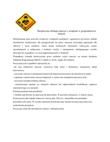 Bezpieczna obsługa maszyn i urządzeń w gospodarstwie rolnym Mechanizacja prac pozwala zwiększyć wydajność produkcji i ograniczyć jej koszty, jednak niewłaściwe użytkowanie lub przygotowane do pracy maszyny powodują zagrożenie dla zdrowia i życia rolników. Duża liczba ruchomych elementów roboczych, często nieosłoniętych w połączeniu z brakiem wiedzy i umiejętności obsługującego, zwykle prowadzi do wypadków i to tych najgroźniejszych w skutkach. Wypadkom wskutek pochwycenia przez ruchome części maszyn, na terenie działania Oddziału Regionalnego KRUS w Opolu w 2014r. uległo 46 rolników. Przyczyną tych wypadków najczęściej są: -zły stan techniczny maszyn, zwłaszcza brak osłon i hamulców, niesprawny układ kierowniczy, - używanie maszyn wyeksploatowanych lub nieprzystosowanych do określonych zadań, - regulacja i smarowanie maszyn będących w ruchu oraz manipulowanie przy nich, - używanie nieodpowiedniej odzieży, - remontowanie sprzętu we własnym zakresie bez odpowiednich kwalifikacji, zaplecza warsztatowego czy narzędzi. Poniżej przedstawiam przykłady: 1. Rolnik ciął drewno na opał oraz do parownika. W pewnym momencie, w trakcie cięcia, kciuk prawej ręki rolnika zahaczył o tarczę piły. Piła tzw. samoróbka nie posiadała prawidłowych osłon. W wyniku zdarzenia poszkodowany doznał otwartej rany palca bez uszkodzenia paznokcia. Przyczyna: brak lub niewłaściwe osłony i zabezpieczenia 2. Rolnik zamierzał skosić trawę na działce za pomocą kosiarki. Po włączeniu kosiarki zauważył dym wydobywający się z okolic jej silnika. Śpiesząc się, nie wyłączył kosiarki, uklęknął obok niej, lewą dłonią złapał za kółko kosiarki, a prawą chwycił za aluminiową obudowę w celu lekkiego przechylenia kosiarki i sprawdzenia miejsca wycieku oleju. Wówczas doszło do pochwycenia przez obracający się nóż kosiarki. Poszkodowany doznał urazu prawej kończyny górnej. Przyczyna: wykonywanie czynności bez usunięcia zagrożenia – nie wyłączenie kosiarki. Przygotowanie maszyn W celu zmniejszenia ryzyka wypadku, maszyny wyposaża się w osłony i obudowy. Maszyny wykorzystywane w gospodarstwie powinny być wyposażone w kompletne i nieuszkodzone osłony. Pozwoli to uchronić osobę obsługującą przed uderzeniem lub pochwyceniem przez ruchome elementy. Osłonięte powinny być wszystkie mechanizmy napędowe, silniki, koła pasowe i zębate, pasy, łańcuchy, wały, przekładnie, przeguby, wały przegubowo-teleskopowe (na całej długości), końcówki wałów wystające poza korpus maszyny i inne ruchome elementy. Osłonięte powinny być także elementy robocze : noże, bijaki (osłonami na stałe), tarcza piły i szlifierki kątowej (osłonami regulowanymi), elementy tnące maszyn żniwnych (osłonami zdejmowanymi wyłącznie na czas pracy). Przed rozpoczęciem pracy kosiarką rotacyjną, glebogryzarką, różnego typu rozdrabniaczami, rozrzutnikami obornika oraz rozsiewaczami nawozów mineralnych, należy uprzedzić osoby znajdujące się na polu, aby nie zbliżały się do nich. Nie należy przebywać w odległości mniejszej niż 50 m od pracującej maszyny. Do pracy rozrzutnikiem obornika nie należy przystępować bez zainstalowanej siatki na przedniej burcie. Przy zrywce drewna w lesie należy używać wyłącznie ciągnika z kabiną, której tylna szyba zabezpieczona jest siatką chroniącą przed uderzeniem zerwanej liny. Ciągniki, przyczepy, maszyny wyposaża się w schodki lub drabinki i uchwyty ułatwiające wchodzenie i schodzenie; podesty robocze – w barierki. Należy zadbać, aby były one solidnie przymocowane i na bieżąco oczyszczane (np. ze smarów, błota). Jeżeli konieczne jest wchodzenie na maszyny lub środki transportu należy wykorzystywać drabinę. Nie wolno zeskakiwać z przyczepy, schodzić lub wchodzić po dyszlach i kołach. W celu ułatwienia agregowania maszyn lub przyczep z ciągnikiem i wyeliminowania udziału drugiej osoby (narażonej w czasie sprzęgania na przygniecenia), montuje się zaczepy podwieszane na sprężynach lub wyposażone w podpórki, a ciągniki wyposaża się w automatyczne zaczepy i haki. Znacznie zwiększają one bezpieczeństwo. Przed uruchomieniem ciągnika lub maszyny samobieżnej należy sprawdzić układ kierowniczy, hamulcowy, ogumienie, światła, sygnał dźwiękowy. Jeżeli z ciągnikiem zagregowana jest maszyna należy sprawdzić czy podłączone jest jej zasilanie, stan osłon, zabezpieczeń, mechanizmów napędowych i układów przekazu mocy ora połączenie maszyny z ciągnikiem. Ciągnik i maszyny samobieżne należy wyposażyć w apteczkę oraz w gaśnicę proszkową, a kombajn – dodatkowo w gaśnicę pianową. Maszyn należy używać zgodnie z ich przeznaczeniem, dlatego nie powinno się : - używać ciągników nieprzystosowanych konstrukcyjnie do danej pracy, - przewozić ludzi w skrzyni rozsiewacza nawozów mineralnych, w skrzyni rozrzutnika obornika, na przyczepach i innych środkach transportowanych lub maszynach do tego nieprzystosowanych, - zezwalać na jazdę na ładunku, błotnikach, zaczepach, burtach; na wsiadanie w czasie jazdy; na przebywanie na ciągniku i maszynach, - zezwalać na przebywanie między ciągnikiem a maszyną współpracującą oraz na wchodzenie na dyszle, zaczepy, ramy i inne części ciągnika lub maszyny w czasie pracy, - dopuszczać do długotrwałej pracy ciągnika i maszyn samobieżnych w pomieszczeniach o słabej wentylacji, ze względu na możliwość zatrucia spalinami, - uruchamianie ciągnika i maszyn samobieżnych w pomieszczeniach drewnianych i w magazynach materiałów łatwopalnych, z uwagi na zagrożenie pożarowe, - wykorzystywać kombajnów i ciągników kołowych bez kabiny lub ramy ochronnej do pracy na znacznych pochyłościach. Co pewien czas powinno się robić przerwy w pracy. Kiedy jest się wypoczętym można lepiej skupić się na wykonywanym zadaniu, można pracować bardziej efektyw
