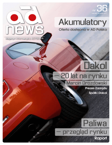 nr 36 czerwiec–wrzesień 2011 Akumulatory Oferta dostępna w AD Polska Dakol – 20 lat na rynku Marcin Drozdowski Prezes Zarządu Spółki Dakol Paliwa – przegląd rynku Raport Spis treści Do Czytelnika 04 D akol - 20 lat na rynku - o dorobku i planach spółki AD Dakol opowiada Marcin Drozdowski, Prezes AD Dakol 08 AD na III Targach Motoryzacyjnych 10 Targi AD w Radomiu 11 Nowe filie AD Polska 18 Paliwa - przegląd rynku 24 Żyję tym sportem! - sport 34 Seat Leon I, Toledo II, z nami naprawia się łatwiej - auti-tip 46 Starcie z imperium - sport 54 Jeśli w Skarżysku, to Camaro! - prezentacja serwisu Auto-Primo 58 Maszyny do zadań specjalnych (quady) - hobby 62 Wszechstronnie i przyjemnie - prezentacja Serwisu AD Auto-Rem 68 Pomocne urządzenia - branża (blacharstwo-lakiernictwo) 76 Piekło w górach - hobby 84 Co kraj, to rejestracja - hobby 88 Przegląd oferty akumulatorów Produkty 12 Linie produktów AD 15 Linie produktów Optima 20 Lepkość oleju to nie wszystko / Nowy Mobil 1 ESP 0W-40 22 Program tarcz i klocków hamulcowych - Bosch 28 Silniki benzynowe: Renault 1.4/1.6 16V - Gates 30 VKN 350 / VKN 351 - SKF 32 P rzełom w woskowaniu samochodu / Permatex niezastąpiony w warsztacie 42 Diagnostyka samochodowa na 125-lecie - Bosch 44 INA Wolne koło pasowe alternatora (OAP/OAD) 45 F IA Mistrzostwa Europy w wyścigach pojazdów ciężarowych (ETRC ) - LuK 52 Uszczelnienie pokrywy głowicy - Elring 56 Dobra jakość za rozsądną cenę - Statim 64 Szerszy asortyment, innowacyjne katalogi - Dayco 66 Test amortyzatorów - KYB 70 Wodny lakier bezbarwny D8186 / Optymalna wydajność 72 Nowości w ofercie EMM Polska 74 Rewolucja w ochronie kabin lakierniczych 80 Autopielęgnacja - Plak Witamy w wakacyjnym 36. wydaniu „AD News”. Specjalnie dla Państwa przygotowaliśmy zestaw atrakcyjnych tematów. Mamy nadzieję, że dostarczymy ciekawych informacji i zajmującej lektury. Polecamy tekst Marcina Drozdowskiego. Prezes AD Dakol opowiada o 20-letnim dorobku firmy i planach rozwoju na najbliższe lata, a także o dramatycznych doświadczeniach z czasu ubiegłorocznej powodzi, kiedy to woda zabrała część majątku firmy oraz o procesie odrabiania strat. Zapraszamy również do lektury raportu dotyczącego obecnej sytuacji na rynku paliw. Dynamiczne zmiany, jakie obserwowaliśmy w tym roku, oddziałują na całą gospodarkę. Co przyniesie druga połowa roku? Czy można się pokusić o wskazanie kierunku zmian w obliczu kryzysu w Europie i niestabilnej sytuacji na Bliskim Wschodzie? Polecamy lekturę analizy. Zachęcamy także do zapoznania się z przeglądem oferty akumulatorów do samochodów osobowych dostępnej w hurtowniach AD Polska. Szeroka gama pozwala na dowolny wybór zarówno pod względem jakości, jak i ceny. W dziale „sport” przestawiamy sylwetkę Jana Chmielewskiego – czołowego polskiego kierowcy rajdowego, startującego w kategorii aut z napędem przedniej osi. Polecamy także artykuł o pojazdach, które szczególnie w ostatnich latach podbijają serca zarówno dorosłych, jak i młodzieży, amatorów i zawodowców. Quady, bo o nich mowa, to być może doskonały pomysł na spędzenie urlopu… Wakacyjny temat odnajdziemy także w tekście o systemach rejestracji pojazdów – po jego lekturze żadne oznaczenie rejestracji współużytkowników dróg nie zaskoczy nas w drodze na wakacje. Z kolei miłośników starych aut z pewnością zainteresuje materiał o muzeum przy niemieckim torze wyścigowym Nuerburgring – jednego z najsłynniejszych w świecie obiektów tego typu z kolekcją imponujących maszyn wyczynowych. Może warto zmienić trasę wakacyjnej podróży, by zobaczyć muzeum i jego zbiory? Wierzymy także, że wszystkich czytelników „AD News” zainteresuje obszerny materiał o dwóch gwiazdach boksu: Tomaszu Adamku i Witaliju Kliczce. Na starcie zawodników czekają zarówno fani boksu, jak i widzowie, którzy sporadycznie oglądają tego typu wydarzenia sportowe. Widowisko, które odbędzie się 10 września na stadionie we Wrocławiu, obejrzy chyba każdy. Zachęcamy do lektury tekstu „Starcie z imperium”, w którym próbujemy „zmierzyć” atuty obu zawodników. Jak zwykle zachęcamy ponadto do zapoznania się z aktualnymi informacjami na temat nowych produktów na rynku. Warto być na bieżąco. Życzymy miłej lektury! Redaktor naczelny Dominik Kolbusz AD Polska Sp. z o.o. ul. Makuszyńskiego 24, 31-752 Kraków Wydawca Feniks Media Group W. Ślaga, D. Wajs spółka jawna ul. Na Wierzchowinach 1D, 30-222 Kraków tel.: 012 257 01 51, fax: 012 263 06 22 Sekretarz redakcji Aneta Szymczyk-Miraś Korekta Patrycja Kita, Aneta Szymczyk-Miraś Współpraca Jan Bielecki, Grzegorz Chmielewski, Grażyna Jancik, Piotr Kołaczek, Łukasz Pieńkowski Skład i łamanie Studio DTP Feniks Media Group Jerzy Gorczyca (kierownik studia), Wojciech Kleszcz, Krzysztof Kusiak Druk ALNUS Sp. z o.o. ul. Wróblowicka 63, 30-698 Kraków Zastrzegamy sobie prawo skracania i adiustacji tekstów oraz zmiany tytułów. Materiałów niezamówionych nie zwracamy. Przedruki z magazynu dozwolone są wyłącznie za uprzednią pisemną zgodą wydawcy. Redakcja nie odpowiada za treść reklam i ogłoszeń. Zdjęcie na okładce: Shutterstock.com wywiad AD Polska Marcin Drozdowski ma 34 lata. Ze spółką Dakol jest związany od 2002 r. Od 1 kwietnia 2009 r. jest jej Prezesem. Interesuje się sportem (uprawia narciarstwo), dużo czyta. 4 Fot. Jan Bielecki Dakol AD Polska 20 lat na rynku Jedną ze spółek należących do Grupy AD Polska jest firma Dakol w Dębicy. O jej dorobku, planach, ale także o dramatycznych chwilach sprzed roku pisze Prezes Marcin Drozdowski. Z awsze od tamtej pory nerwowo i z niepokojem spoglądam w stronę Wisłoki, kiedy pada ulewny deszcz. Te emocje wyzwala wspomnienie katastrofy, która rok temu przyszła od wezbranej rzeki. S to metrów od rzeki Obiekty spółki w Dębicy znajdują się w odległości stu metrów od obwałowań Wisłoki. W
