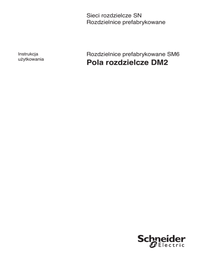 Sieci rozdzielcze SN Rozdzielnice prefabrykowane Instrukcja użytkowania Rozdzielnice prefabrykowane SM6 Pola rozdzielcze DM2 Spis treści Opis ogólny DM2: pole z wyłącznikiem po lewej stronie DM2: pole z wyłącznikiem po prawej stronie 2 2 2 Instrukcja transportu Identyfikacja pola Spis wyposażenia Ciężar pola Wymiary Transport przy użyciu dźwigu Transport przy użyciu podnośnika widłowego Składowanie 3 3 3 4 4 4 5 5 Zalecenia dotyczące instalacji oraz użytkowania 7 Instrukcje instalowania Przygotowanie pól do montażu rozdzielnicy Montaż rozdzielnicy Mocowanie do podłogi Rozmieszczenie w rozdzielni Montaż szyn zbiorczych po zainstalowaniu pól Montaż szyn uziomowych Wejście kabli obwodów pomocniczych 8 8 9 9 0 0 Instrukcja rozruchu i obsługi Sprawdzenia przed podaniem napięcia Położenie dźwigni napędowej odłącznika Przestawienie wyłącznika w stanie beznapięciowym Podanie napięcia na szyny zbiorcze na odpływie Zdejmowanie napięcia z szyn zbiorczych na odpływie Bezpieczeństwo obsługi Blokada kłódkami Blokowanie za pomocą zamków 13 3 3 3 4 5 6 6 7 Instrukcja konserwacji Konserwacja zapobiegawcza Schemat usuwania niesprawności Wyposażenie dodatkowe 18 8 8 8 1 Opis ogólny DM2: Pole z wyłącznikiem po lewej stronie 1. Przedział szyn zbiorczych 2. Przedział niskonapięciowy 3. Komora łączników: odłącznik liniowy 4. Przedział mechanizmu napędowego A: Końcówka przyłączowa uziemienia B: Podstawy przyłączowe szyn zbiorczych C: Płyta czołowa D: Przekładniki prądowe E: Przekładniki napięciowe F: Okienka inspekcyjne G: Płyta czołowa mechanizmu napędowego wyłącznika DM2: Pole z wyłącznikiem po prawej stronie 1. Przedział szyn zbiorczych 2. Przedział niskonapięciowy 3. Komora łączników: odłącznik liniowy 4. Przedział mechanizmu napędowego A: Końcówka przyłączowa uziemienia B: Podstawy przyłączowe szyn zbiorczych C: Płyta czołowa D: Przekładniki prądowe E: Przekładniki napięciowe F: Okienka inspekcyjne G: Płyta czołowa mechanizmu napędowego wyłącznika 2 2 Instrukcja transportu Opis pola A: Tabliczka identyfikacyjna (dla użytkownika). B: Charakterystyka i przeznaczenie. C: Emblemat producenta. Uwaga: Charakterystyka wyłącznika podawana jest na tabliczce znamionowej wytwórcy Numery fabryczne D1: Przynitowany do płyty czołowej przedziału mechanizmu napędowego. D2: Przyklejony na wewnętrznej stronie płyty czołowej przedziału. niskonapięciowego. D3: Przyklejony na górnej części ramy pola. Spis wyposażenia Wyposażenie rozdzielnicy (może być różny, zależnie od przeznaczenia pola w rozdzielnicy) dźwignia napędowa, 2 płyty krańcowe, torba ze śrubami i nakrętkami do płyt krańcowych (torba S4: 3729744). Wyposażenie pola torba z ekranami wyrównawczymi pola dla szyn zbiorczych > 2 kV (torba S2: 3729742), lub torba z elementami mocującymi szyn zbiorczych ≤ 2 kV (torba S6: 3729746), torba z wyposażeniem do połączenia sąsiednich pól (torba S: 3729745), 2 szyny uziomowe, 3 szyny zbiorcze. Ciężar Średni ciężar pola z wyposażeniem: 400 kg Pod żadnym pozorem nie przesuwać pola przez naciskanie na panel sterowania. 3 3 Wymiary pola (w mm) Transport przy użyciu dźwigu L = 750 mm (min.) Z przedziałem niskiego napięcia i rynną Transport przy użyciu podnośnika widłowego 4 4 L = 30 mm(min) Bez przedziału niskiego napięcia i rynny Składowanie 5 5 6 6 Zalecenia dotyczące instalacji oraz użytkowania Odporność rozdzielnic SN na efekt starzenia się, uzależniona jest od 3 głównych czynników Rodzaju zastosowanych połączeń. Najnowsze technologie umożliwiają łatwość instalowania elementów, przy jednoczesnym zapewnieniu niezawodności połączeń mimo upływu czasu. Pozwalają one również na niezawodną pracę w surowych warunkach atmosferycznych o dużym stężeniu zanieczyszczeń. Wpływu wilgotności. Instalowanie rezystorów grzejnych jest konieczne dla klimatów o wysokiej wilgotności względnej oraz dużych wahaniach temperatur. Odpowiedniej wentylacji. Rozmiar siatki wentylacyjnej powinien być dobrany do wielkości strat mocy w stacji rozdzielczej. Powinny być one rozmieszczone w pobliżu transformatora, aby zapobiegać cyrkulacji powietrza wewnątrz rozdzielnicy SN. Warunki eksploatacyjne Zalecane jest regularne przeprowadzanie (przynajmniej raz na 2 lata) kilku cykli przełączeń na aparaturze rozdzielczej. W przypadku trudnych warunków eksploatacyjnych (temperatura otoczenia spoza zakresu -5°C do 40°C, obecność kurzu, gazów korozyjnych, itp.) należy skonsultować się z działem serwisu firmy Schneider. Dział serwisowy pomoże państwu w: n przeprowadzeniu diagnoz instalacyjnych n doborze odpowiednich działań konserwacyjnych n pracach adaptacyjnych. 7 7 Instrukcja instalowania Przygotowanie pól do montażu rozdzielnicy Stan pola po dostarczeniu: wyłącznik w położeniu otwarcia odłącznik liniowy w położeniu uziemienia : śruba + podkładka : śruba + podkładka + nakrętka nylstop Zdjąć płytę czołową A unosząc ją i pociągając do przodu. Usunąć paletę B (śruby nie mogą być użyte ponownie). 8 8 Zdjąć osłonę przedziału sterowniczego C. Zdjąć dwie „półtrawersy” D przedziału sterowniczego (pole bez dodatkowej obudowy niskiego napięcia). Usunąć dwie górne płyty tylne E. Usunąć dwie górne płyty przednie F. (pole bez dodatkowej obudowy niskiego napięcia). Usunąć 2 lub cztery elementy G lub H podnoszenia pola Montaż płyt krańcowych (tylko dla pola na końcu rozdzielnicy). Nakrętki w torbie S4: 3729745 (tylko śruby HM6x12). P Założyć 0 wewnętrznych nakrętek Kierunek osadzania śrub: zatrzaskowych do otworów w płycie K: lewe pole krańcowej. L: prawe pole M: łączenie pól Śruby HM6x60 dokręcane z momentem 6 Nm. Połączyć sąsiednie pola (pozostałe nakrętki i śruby przeznaczone są do szyn uziomowych). Usunąć metalową osłonę N oraz zamocować śrubę P (uważając na przewo