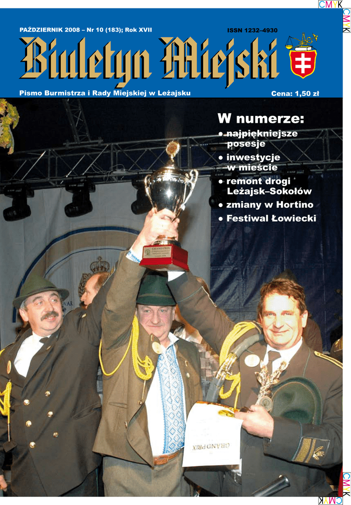 PAŹDZIERNIK 2008 – Nr 10 (183); Rok XVII ISSN 1232–4930 Pismo Burmistrza i Rady Miejskiej w Leżajsku Cena: 1,50 zł W numerze: ● ● ● ● ● najpiękniejsze posesje inwestycje w mieście remont drogi Leżajsk–Sokołów zmiany w Hortino Festiwal Łowiecki spotkania Pielgrzymka służb mundurowych i rolników W święto Siewnej 8 września w kościele katolickim obchodzone jest święto Narodzenia Najświętszej Maryi Panny nazywane też świętem Matki Boskiej Siewnej. Tego dnia, jak każe tradycja, rolnicy przynosili zawsze do kościołów dożynkowe wieńce, dziękowali za zebrane plony i przynosili z sobą ziarno do poświęcenia przed zasiewem. Czynili tak od lat w nadziei, że w następnym roku da ono obfitszy plon. Od wielu lat do Bazyliki w Leżajsku 8 września przybywają nie tylko rolnicy z Ziemi Leżajskiej na Dożynki Powiatowe, ale też pielgrzymka służb mundurowych Województwa Podkarpackiego. W tym toku w uroczystości uczestniczyły kompanie honorowe: 21 Brygady Strzelców Podhalańskich, Bieszczadzkiego Oddziału Straży Granicznej, Służby Więziennej, Państwowej Straży Pożarnej, Policji, Ochotniczych Straży Pożarnych, Jednostka Strzelecka z Leżajska. Po raz pierwszy udział wzięła także kompania Straży Marszałkowskiej Sejmu RP z komendantem Mieczysławem Kurasem na czele. Uroczystość rozpoczęła się przemarszem służb mundurowych i delegacji z wieńcami dożynkowymi z gmin i wiosek powiatu leżajskiego na plac przed Bazyliką, gdzie przy ołtarzu polowym odprawiona została koncelebrowana Msza św. Dożynkowa. Przewodniczył jej Metropolita Krakowski ks. kardynał Stanisław Dziwisz. Uczestniczyli w niej również ks. bp Adam Szal z Przemyśla i ks. bp Piotr Herkulan Marczuk z Odessy oraz księża okolicznych parafii. Obecni byli parlamentarzyści z posłem na Sejm RP Zbigniewem Rynasiewiczem, wojewoda Podkarpacki Mirosław Karapyta, Marszałek Województwa Podkarpackiego Zbigniew Cholewiński, przedstawiciele samorządów powiatu leżajskiego. Oprawę muzyczną zapewniła Wojskowa Orkiestra Garnizonowa z Lublina. Podczas Mszy św. odbyło się uroczyste zawierzenie służb mundurowych Matce Bożej Leżajskiej. Ks. kardynał Stanisław Dziwisz w swej homilii zwrócił się szczególnie do rolników, którzy nas żywią oraz do służb mundurowych, które nas bronią. Podziękował też ojcom bernardynom za ich czterechsetletnią obecność w Leżajsku. (bwl) dzień za dniem Nagrodzeni w konkursie „NAJPIĘKNIEJSZA POSESJA” w latach 2003–2007 ROK 2003 1.ul. Armii Krajowej nr 17 (p. Stopyra) ul. Ks. Czesława Brody nr 25 (p. Golik) 2.ul. Rzeszowska nr 64 (p. Wojtera) 3.ul. Św. Jadwigi Królowej nr 20 Wyróżnienie – ul. Sandomierska nr 87– –103 (nowa zabudowa szeregowa). Odrębne wyróżnienie – „ogród botaniczny” przy ul. Mickiewicza nr 20 (p. Konieczna). ROK 2004 Najpiękniejsze posesje 2008 29 sierpnia 2008 r. rozstrzygnięty został – ogłoszony wiosną przez Burmistrza Leżajska – „Konkurs na najpiękniejszą posesję” w naszym mieście (zob. strona 23). Komisja – powołana przez Burmistrza Leżajska do oceny nieruchomości – w składzie: Ewa Jagusiak (architekt miejski) – przewodnicząca komisji, Jan Dec (radny, przewodniczący Komisji Porządku Publicznego i Ochrony Środowiska) – członek komisji, Stanisław Brzuzan (właściciel firmy „Karol”, zajmującej się utrzymaniem zieleni miejskiej) – członek komisji; Beata Jodkowska (inspektor ds. ochrony środowiska) – członek komisji, dokonała w miesiącach letnich bieżącego roku przeglądu posesji mieszkalnych indywidualnych położonych na terenie miasta Leżajska, zwracając uwagę na zagospodarowanie poszczególnych nieruchomości, a w szczególności na: • stan techniczny i wygląd budynków, w tym elewacji frontowych, • wygląd i stan ogrodzeń, • stan zieleni wokół budynków: trawniki, rabaty, ogródki, balkony, • ogólny widok posesji z ulicy. Na podstawie przeprowadzonego przeglądu, komisja postanowiła zakwalifikować do finału konkursu nieruchomości wyszczególnione w zestawieniu z dnia 25 sierpnia 2008 r. Po przeglądzie tych nieruchomości oraz dokonaniu ich oceny, komisja postanowiła ostatecznie przyznać następujące nagrody: I miejsce – posesji Państwa Marty Grudzińskiej-Kosakowskiej i Stanisława Kosakowskiego przy ul. Podleśnej nr 11A, II miejsce – posesji Państwa Elżbiety i Bogdana Stępniowskich przy ul. Kwiatowej nr 7, III miejsce – posesji Państwa Krystyny i Michała Ćwieków przy ul. K.K. Baczyńskiego nr 6. Specjalne wyróżnienie – rezydencji Państwa Doroty i Janusza Lorfingów przy ul. Bocznej Moniuszki nr 8. Komisja uważa, że na uznanie zasługują wszyscy właściciele posesji zakwalifikowanych do finału, w tym właściciele nieruchomości, które w latach ubiegłych zostały nagrodzone oraz wyróżnione w konkursie i obecnie także znalazły się w ścisłej czołówce, lecz zgodnie z regulaminem konkursu nie mogą otrzymać ponownie nagród. W podsumowaniu niniejszego konkursu członkowie komisji wspólnie stwierdzają, że z każdym rokiem przybywa na terenie miasta posesji, które mogą konkurować o miano „najpiękniejszej”. 1.ul. Zielona nr 4 (p. Knap) 2.ul. Boczna Moniuszki nr 3 (p. Dziuba) 3.ul. Sandomierska nr 29 (p. Grabarz). Odrębne wyróżnienie – p. Stanisław Brzuzan (właściciel firmy „KAROL”) za utrzymanie zieleni miejskiej. ROK 2005 1.ul. Lipy nr 8 (p. Żurawscy) 2.ul. Podolszyny nr 10 (p. Hozer) ul. Sandomierska nr 22A (p. Klimczak) 3.ul. Leśników nr 1 (p. Pytko). Szczególne wyróżnienie – ul. Sandomierska nr 87–103 (nowa zabudowa szeregowa – zagospodarowanie ogrodów). ROK 2006 ul. Armii Krajowej nr 39 (p. Drożdżak) ul. Lipy nr 26 (p. Wilk) ul. Podolszyny nr 19 (p. Zygmunt) ROK 2007 1.ul. Ogrodowa nr 11A (p. Samborscy) 2.ul. Opalińskiego nr 53G (p. Sroka) ul. Orzeszkowej nr 2C (p. Lasota) 3.ul. Opalińskiego nr 114F (p. Kulka). (ej) Wi