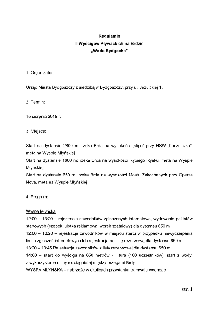 Regulamin II Wyścigów Pływackich na Brdzie „Woda Bydgoska” 1. Organizator: Urząd Miasta Bydgoszczy z siedzibą w Bydgoszczy, przy ul. Jezuickiej 1. 2. Termin: 15 sierpnia 2015 r. 3. Miejsce: Start na dystansie 2800 m: rzeka Brda na wysokości „slipu” przy HSW „Łuczniczka”, meta na Wyspie Młyńskiej Start na dystansie 1600 m: rzeka Brda na wysokości Rybiego Rynku, meta na Wyspie Młyńskiej Start na dystansie 650 m: rzeka Brda na wysokości Mostu Zakochanych przy Operze Nova, meta na Wyspie Młyńskiej 4. Program: Wyspa Młyńska 12:00 – 13:20 – rejestracja zawodników zgłoszonych internetowo, wydawanie pakietów startowych (czepek, ulotka reklamowa, worek szatniowy) dla dystansu 650 m 12:00 – 13:20 – rejestracja zawodników w miejscu startu w przypadku niewyczerpania limitu zgłoszeń internetowych lub rejestracja na listę rezerwową dla dystansu 650 m 13:20 – 13:45 Rejestracja zawodników z listy rezerwowej dla dystansu 650 m 14:00 – start do wyścigu na 650 metrów - I tura (100 uczestników), start z wody, z wykorzystaniem liny rozciągniętej między brzegami Brdy WYSPA MŁYŃSKA – nabrzeże w okolicach przystanku tramwaju wodnego str. 1 14:45 – start do wyścigu na 650 metrów II tura (100 uczestników), start z wody z wykorzystaniem liny rozciągniętej między brzegami Brdy WYSPA MŁYŃSKA – nabrzeże w okolicach przystanku tramwaju wodnego 15:15 - Ukończenie wyścigu przez ostatnich Uczestników na dystansie 650 m Rybi Rynek 14:30 – 15:45 rejestracja zawodników zgłoszonych internetowo, wydawanie pakietów startowych dla dystansu 1600 m 14:30 – 15:45 – rejestracja zawodników w miejscu startu w przypadku niewyczerpania limitu zgłoszeń internetowych lub rejestracja na listę rezerwową dla dystansu 1600 m 15:45 – 16:00 – Rejestracja zawodników z listy rezerwowej dla dystansu 1600 m 16:15 – Start do wyścigu na 1600 metrów, start z wody, z wykorzystaniem liny rozciągniętej między brzegami Brdy na wysokości Mostu Zakochanych 17:05 – Ukończenie wyścigu przez ostatnich Uczestników na dystansie 1600 m HSW „Łuczniczka” 13:40 – 14:20 – rejestracja zawodników zgłoszonych internetowo, wydawanie pakietów startowych (czepek, ulotka reklamowa, worek szatniowy) dla dystansu 2800 m 13:40 – 14:20 – rejestracja zawodników w miejscu startu w przypadku niewyczerpania limitu zgłoszeń internetowych lub rejestracja na listę rezerwową dla dystansu 2800 m 14:20 – 14:30 Rejestracja zawodników z listy rezerwowej dla dystansu 2800 m 14:45 – start do wyścigu na 2800 metrów start z wody z wykorzystaniem liny rozciągniętej między brzegami HSW „Łuczniczka” – nabrzeże w okolicach „slipu” 15:45 - Ukończenie wyścigu przez ostatnich Uczestników na dystansie 2800m 17:25– Wręczenie nagród w kategoriach M i K, amfiteatr na Wyspie Młyńskiej 17:45 – Zakończenie imprezy str. 2 5. Charakterystyka przedsięwzięcia: II Wyścigi Pływackie na Brdzie „Woda Bydgoska” są imprezą rekreacyjną, przeznaczoną dla osób które mają doświadczenie w pływaniu w otwartych zbiornikach wodnych. Wyścigi mają charakter rywalizacji sportowej. Prowadzony będzie profesjonalny pomiar czasu. Wyłonieni i nagrodzeni zostaną zwycięzcy w kategorii „Mężczyźni” i w kategorii „Kobiety”. Udział w imprezie jest bezpłatny. Uczestnicy zawodów nie są zobowiązani do uiszczania jakichkolwiek opłat czy darowizn. Przewidziano wyścigi na trzech dystansach: 2800 metrów 1600 metrów i 650 metrów. W trzech przypadkach starty odbędą się z wody, zawodnicy przed startem będą mogli przytrzymywać się specjalnie przygotowanych lin. O bezpieczeństwo podczas zawodów dbać będzie Wodne Ochotnicze Pogotowie Ratunkowe. Dopuszczalny jest udział zawodników w piankach lub bez pianek pływackich. W zawodach dopuszczalny jest wyłącznie start osób, które ukończyły 18 rok życia lub osób które ukończyły 16 rok życia i posiadają pisemną zgodę rodzica lub opiekuna prawnego na udział w zawodach. 6. Warunki udziału: a) Rejestracja do zawodów prowadzona jest poprzez Internet. Na stronie: www.aktywna.bydgoszcz.pl W dniach 15 lipca - 14 sierpnia dostępny będzie formularz zgłoszeniowy. Należy go wypełnić. Po wypełnieniu należy wybrać opcję WYŚLIJ lub SUBMIT. Uczestnikami zawodów będą osoby, które wysłały formularz elektroniczny. Zapisy przyjmowane są do 14 sierpnia 2015 r. do godziny 10.00. Organizator wprowadza limity uczestnictwa w imprezie. Na dystansie 2800m możliwy jest start 50 osób, 1600 metrów możliwy jest start 100 osób 650 metrów możliwy jest start 200 osób. O ostatecznym zakwalifikowaniu do wyścigu będzie świadczył mail potwierdzający wysłany przez Organizatora na adres Zawodnika wskazany w formularzu zgłoszeniowym. Fakt wypełnienia i wysłania formularza nie oznacza zakwalifikowania do imprezy. str. 3 a) W przypadku, gdy w ramach zgłoszeń internetowych nie zostanie wyczerpany przewidziany limit ilości zawodników odpowiedni dla każdego z dystansów, możliwe będzie zapisanie się do zawodów w miejscu startu, tj. na Rybim Rynku od godziny 14.30, Wyspie Młyńskiej od godziny 13.30 i HSW „Łuczniczka” od godziny 13:40 b) W przypadku dodatkowych pytań prosimy kontaktować się za pośrednictwem adresu: [email protected]. w tytule wiadomości wpisując „Woda Bydgoska”. c) Biorąc udział w zawodach Uczestnik zobowiązuje się do płynięcia po wyznaczonej trasie oraz do dostosowania się do bieżących uwag patroli wodnych d) Łamanie postanowień regulaminu może skutkować wykluczeniem z zawodów, o czym decyduje Organizator. e) Uczestnik zobowiązany jest do startu w czepku przekazanym przez Organizatora w pakiecie startowym. f) Uczestnik zobowiązany jest do podpisania w momencie odbioru pakietu startowego „Oświadczenia Zawodnika” stanowiącego załącznik do niniejszego regulaminu. g) Jeden zawodnik może wystąpić tylko na jednym dystansi