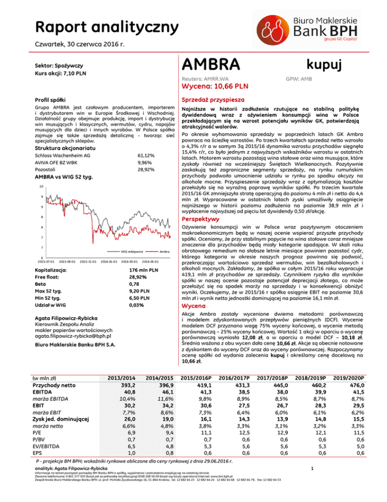 Raport analityczny Czwartek, 30 czerwca 2016 r. AMBRA Sektor: Spożywczy Kurs akcji: 7,10 PLN kupuj Reuters: AMRR.WA GPW: AMB Wycena: 10,66 PLN Profil spółki Sprzedaż przyspiesza Grupa AMBRA jest czołowym producentem, importerem i dystrybutorem win w Europie Środkowej i Wschodniej. Działalność grupy obejmuje: produkcję, import i dystrybucję win musujących i klasycznych, wermutów, cydru, napojów musujących dla dzieci i innych wyrobów. W Polsce spółka zajmuje się także sprzedażą detaliczną - tworząc sieć specjalistycznych sklepów. Najniższe w historii zadłużenie rzutujące na stabilną politykę dywidendową wraz z ożywieniem konsumpcji wina w Polsce przekładającym się na wzrost potencjału wyników GK, potwierdzają atrakcyjność walorów. Struktura akcjonariatu Schloss Wachenheim AG AVIVA OFE BZ WBK Pozostali 61,12% 9,96% 28,92% AMBRA vs WIG 52 tyg. 10 9 9 Po okresie wyhamowania sprzedaży w poprzednich latach GK Ambra powraca na ścieżkę wzrostów. Po trzech kwartałach sprzedaż netto wzrosła o 4,3% r/r a w samym 3q 2015/16 dynamika wzrostu przychodów sięgnęła 15,4% r/r, co było jednym z najwyższych wskaźników wzrostu w ostatnich latach. Motorem wzrostu pozostają wina stołowe oraz wina musujące, które zyskały również na wcześniejszy Świętach Wielkanocnych. Pozytywnie zaskakują też zagraniczne segmenty sprzedaży, na rynku rumuńskim przychody podwoiło umocnienie udziału w rynku po spadku akcyzy na alkohole mocne. Przyspieszenie sprzedaży wraz z optymalizacją kosztów przełożyło się na wyraźną poprawę wyników spółki. Po trzecim kwartale 2015/16 GK zmniejszyła stratę operacyjną do poziomu 4 mln zł i netto do 4,4 mln zł. Wypracowane w ostatnich latach zyski umożliwiły osiągnięcie najniższego w historii poziomu zadłużenia na poziomie 38,9 mln zł i wypłacenie najwyższej od pięciu lat dywidendy 0,50 zł/akcję. 8 Perspektywy 8 Ożywienie konsumpcji win w Polsce wraz pozytywnym otoczeniem makroekonomicznym będą w naszej ocenie wspierać przyszłe przychody spółki. Oceniamy, że przy stabilnym popycie na wina stołowe coraz mniejsze znaczenie dla przychodów będą miały kategorie spadające. W skali roku obrotowego remedium na słabsze letnie miesiące powinien pozostać cydr, którego kategoria w okresie naszych prognoz powinna się podwoić, przekraczając wartościowo sprzedaż wermutów, win bezalkoholowych i alkoholi mocnych. Zakładamy, że spółka w całym 2015/16 roku wypracuje 419,1 mln zł przychodów ze sprzedaży. Czynnikiem ryzyka dla wyników spółki w naszej ocenie pozostaje potencjał deprecjacji złotego, co może przełożyć się na spadek marży na sprzedaży i w konsekwencji obniżyć wyniki. Oczekujemy, że w 2015/16 r spółka osiągnie EBIT na poziomie 30,6 mln zł i wynik netto jednostki dominującej na poziomie 16,1 mln zł. 7 7 WIG relatywnie 6 2015-07-01 2015-09-01 2015-11-01 2016-01-01 Kapitalizacja: Free float: Beta Max 52 tyg. Min 52 tyg. Udział w WIG 2016-03-01 Ambra 2016-05-01 176 mln PLN 28,92% 0,78 9,20 PLN 6,50 PLN 0,03% Akcje Ambra zostały wycenione dwiema metodami: porównawczą i modelem zdyskontowanych przepływów pieniężnych (DCF). Wycenie modelem DCF przyznano wagę 75% wyceny końcowej, a wycenie metodą porównawczą – 25% wyceny końcowej. Wartość 1 akcji w oparciu o wycenę porównawczą wyniosła 12,08 zł, a w oparciu o model DCF – 10,18 zł. Średnia ważona z obu wycen dała cenę 10,66 zł. Akcje są obecnie notowane z dyskontem do wyceny DCF oraz do wyceny porównawczej. Rozpoczynamy ocenę spółki od wydania zalecenia kupuj i określamy cenę docelową na 10,66 zł. Agata Filipowicz-Rybicka Kierownik Zespołu Analiz makler papierów wartościowych [email protected] Biuro Maklerskie Banku BPH S.A. (w mln zł) Przychody netto EBITDA marża EBITDA EBIT marża EBIT Zysk jed. dominującej marża netto P/E P/BV EV/EBITDA EPS 2013/2014 393,2 40,8 10,4% 30,2 7,7% 26,0 6,6% 6,9 0,7 6,5 1,0 Wycena 2014/2015 396,9 46,1 11,6% 34,2 8,6% 19,0 4,8% 9,4 0,7 4,8 0,8 2015/2016P 419,1 41,3 9,8% 30,6 7,3% 16,1 3,8% 11,1 0,7 5,3 0,6 2016/2017P 431,3 38,5 8,9% 27,5 6,4% 14,3 3,3% 12,5 0,6 5,6 0,6 2017/2018P 445,0 38,0 8,5% 26,7 6,0% 13,9 3,1% 12,9 0,6 5,6 0,6 2018/2019P 460,2 39,9 8,7% 28,3 6,1% 14,8 3,2% 12,1 0,6 5,3 0,6 P - projekcje BM BPH; wskaźniki rynkowe obliczone dla ceny rynkowej z dnia 29.06.2016 r. analityk: Agata Filipowicz-Rybicka Informacje na temat powiązań pomiędzy BM Banku BPH a spółką, wyjaśnienia i zastrzeżenia znajdują się na ostatniej stronie Zlecenia telefoniczne: 0 801 377 933 (koszt jak za jednostkę taryfikacyjną) (058) 308 56 09 (koszt wg taryfy operatora) Internet: www.bm.bph.pl Zespół Analiz Biura Maklerskiego Banku BPH: ul. prof. Michała Życzkowskiego 16, 31-864 Kraków, tel. 12 682 64 23 12 682 64 24 12 682 64 68 12 682 64 79, fax: 12 682 64 53 1 2019/2020P 476,0 41,5 8,7% 29,5 6,2% 15,5 3,3% 11,5 0,6 5,0 0,6 Raport analityczny Czwartek, 30 czerwca 2016 r. Profil spółki Grupa Ambra jest czołowym w Europie Środkowej i Wschodniej przedsiębiorstwem branży winiarskiej. Obok Ambry S.A. Grupę tworzą spółki zależne należące do czołowych graczy na rynkach winiarskich w Polsce, Czechach, na Słowacji oraz w Rumunii. Głównym rynkiem działalności pozostaje Polska, gdzie Grupa Ambra jest liderem rynku wina oraz rynku cydru. Podstawowa działalność Grupy obejmuje produkcję, import i dystrybucję win musujących, win spokojnych, wermutów, napojów musujących dla dzieci oraz win aromatyzowanych i innych wyrobów spirytusowych. Spółka zarówno produkuje, jak i dystrybuuje marki własne win. Grupa posiada własny zakład produkcyjny w Woli Dużej k. Biłgoraja, gdzie produkuje rocznie ponad 30 mln butelek wina oraz innych produktów. Drugi zakład produkcyjny produkujący około 6 mln butelek znajduje się w Bukareszcie. Ambra opiera proces produkcyjny na zewnętrznych źródłach zaopatrzenia w surowce po