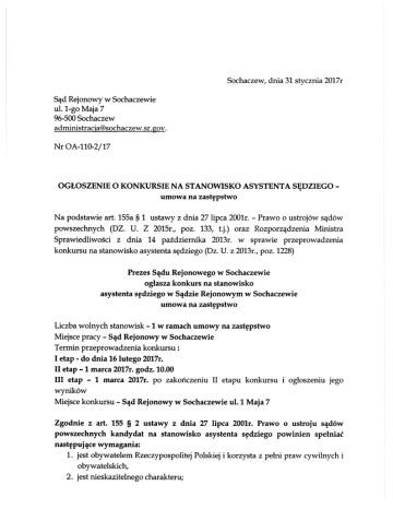 Sochaczew, dnia 31 stycznia 2017r Sąd Rejonowy w Sochaczewie ul. 1-go Maja 7 96-500 Sochaczew [email protected]. Nr OA-110-2/17 OGŁOSZENIE O KONKURSIE NA STANOWISKO ASYSTENTA SĘDZIEGO umowa na zastępstwo Na podstawie art. 155a § 1 ustawy z dnia 27 lipca 2001r. - Prawo o ustrojów sądów powszechnych (DZ. U. Z 2015r., poz. 133, t.j.) oraz Rozporządzenia Ministra Sprawiedliwości z dnia 14 października 2013r. w sprawie przeprowadzenia konkursu na stanowisko asystenta sędziego (Dz. U. z 2013r., poz. 1228) Prezes Sądu Rejonowego w Sochaczewie ogłasza konkurs na stanowisko asystenta sędziego w Sądzie Rejonowym w Sochaczewie umowa na zastępstwo Liczba wolnych stanowisk - 1 w ramach umowy na zastępstwo Miejsce pracy - Sąd Rejonowy w Sochaczewie Termin przeprowadzenia konkursu: I etap - do dnia 16 lutego 2017r. II etap - 1 marca 2017r. godz. 10.00 III etap - 1 marca 2017r. po zakończeniu II etapu konkursu i ogłoszeniu jego wyników Miejsce konkursu - Sąd Rejonowy w Sochaczewie ul. 1 Maja 7 Zgodnie z art. 155 § 2 ustawy z dnia 27 lipca 2001r. Prawo o ustroju sądów powszechnych kandydat na stanowisko asystenta sędziego powinien spełniać następujące wymagania: 1. jest obywatelem Rzeczypospolitej Polskiej i korzysta z pełni praw cywilnych i obywatelskich, 2. jest nieskazitelnego charakteru; 3. ukończył wyższe studia prawnicze w Polsce i uzyskał tytuł magistra lub zagraniczne uznane w Polsce; 4. ukończył 24 lata. W związku ze stanowiskiem Krajowej Rady Sadownictwa z dnia 5 marca 2014r. w przedmiocie dopuszczalności zatrudnienia na stanowisku asystenta sędziego osób odbywających aplikacje adwokacka lub radcowska uprzejmie informuje, iż osoba która ma zostać zatrudniona na stanowisku asystenta sędziego w Sadzie Rejonowym w Sochaczewie nie może odbywać ww, aplikacji. Wobec powyższego od kandydata, któremu po zakończeniu postępowania konkursowego zostanie złożona propozycja zatrudnienia oczekiwać będziemy złożenia rezygnacji z odbywania aplikacji z uwagi na nawiązanie stosunku pracy w Sadzie Rejonowym w Sochaczewie. W miesiącu poprzedzającym datę upublicznienia ogłoszenia wskaźnik zatrudnienia osób niepełnosprawnych w sądzie, w rozumieniu przepisów o rehabilitacji zawodowej i społecznej oraz zatrudnianiu osób niepełnosprawnych jest niższy niż 6% . Zachęcamy osoby posiadające orzeczenie o niepełnosprawności, które spełniają wymagania określone w ogłoszeniu do udziału w naborze na powyższe stanowisko. Dokumenty wymagane od kandydata: 1. wniosek o zatrudnienie na stanowisku asystenta sędziego; 2. własnoręcznie sporządzony życiorys i informacja o przebiegu kariery zawodowej; 3 . oryginał lub urzędowo poświadczony odpis dokumentu potwierdzającego ukończenie studiów wyższych na kierunku prawo w Rzeczypospolitej Polskiej i uzyskanie tytułu zawodowego magistra albo zaświadczenie o zdanym egzaminie magisterskim, albo oryginał lub urzędowo poświadczony odpis dokumentu potwierdzającego ukończenie zagranicznych studiów wyższych na kierunku prawo uznanych w Rzeczypospolitej Polskiej na podstawie odrębnych przepisów; 4 . oświadczenie o nie prowadzeniu wobec kandydata postępowania 0 przestępstwo ścigane z oskarżenia publicznego lub przestępstwo skarbowe; 5 . oświadczenie, że kandydat jest obywatelem Rzeczypospolitej Polskiej 1korzysta z pełni praw cywilnych i obywatelskich; 6 . aktualna fotografia zgodna z wymaganiami stosowanymi przy wydawaniu dowodów osobistych. Do zgłoszenia kandydat może dołączyć dokumenty potwierdzające dodatkowe kwalifikacje i osiągnięcia. Składane dokumenty powinny zawierać informacje o wyrażeniu przez kandydata zgody na przetwarzanie danych osobowych dla potrzeb rekrutacji zgodnie z ustawą z dnia 29 sierpnia 1997r o ochronie danych osobowych (Dz. U. 2014.1182 t.j.). Termin składania ofert: Kandydat na stanowisko asystenta sędziego - umowa na zastępstwo składa zgłoszenie o przystąpieniu do konkursu wraz z dokumentami, o których mowa poniżej, w nieprzekraczalnym terminie do dnia 16 lutego 2017r. osobiście w Sekretariacie Prezesa Sądu Rejonowego w Sochaczewie pok. 23 (I piętro) albo przesyła je za pośrednictwem operatora pocztowego z podaniem oznaczenia konkursu (konkurs na stanowisko asystenta sędziego Nr OA-110-2/17) na adres Sąd Rejonowy w Sochaczewie, ul. 1-go Maja 7,96-500 Sochaczew. Za datę złożenia zgłoszenia drogą pocztową uważa się za datę stempla pocztowego. Dokumenty składane osobiście przyjmowane są wyłącznie w zamkniętych kopertach a pracownik przyjmujący dokumenty aplikacyjne kandydatów nie sprawdza w chwili składania aplikacji ich kompletności. Oferty otrzymane po terminie, niekompletne lub nieopatrzone stosownymi podpisami nie będą rozpatrywane. Dodatkowe informacje można uzyskać w Oddziale Administracyjnym pod numerem telefonu 46 862-22-50. Konkurs składa się z trzech etapów: 1. etapu pierwszego - wstępnej weryfikacji zgłoszeń kandydatów pod kątem spełnienia wymogów formalnych przystąpienia do konkursu; 2. etapu drugiego - testu obejmującego 36 pytań z zakresu prawa cywilnego i karnego oraz postępowania cywilnego i karnego oraz z pracy pisemnej na jeden z dwóch tematów z zakresu prawa cywilnego i karnego, wybrany przez kandydata; 3. etapu trzeciego - rozmowy kwalifikacyjnej. Lista kandydatów dopuszczonych do II etapu konkursu zostanie wywieszona w siedzibie Sądu Rejonowego w Sochaczewie oraz opublikowana w Biuletynie Informacji Publicznej (tj. na stronie internetowej Sądu Rejonowego w Sochaczewie) nie później niż do dnia 20 lutego 2017r. Osoby zakwalifikowane do II etapu konkursu mogą posiadać ze sobą w celu wykorzystania przy pisaniu pracy pisemnej niezbędne akty prawne z zakresu prawa cywilnego i karnego oraz postępowania cywilnego i karnego bez naniesionych jakichkolwiek adnotacji lub notatek. Zasady postępowania z danymi osobowymi Dokumenty kandydatów wciągniętych na listę rezerwową
