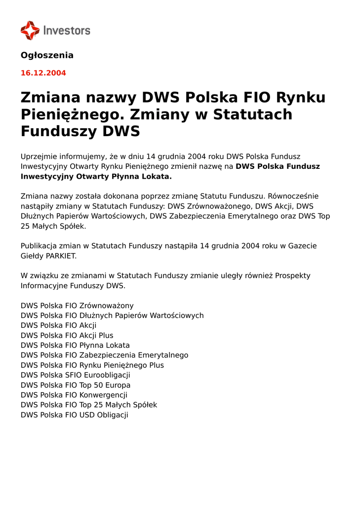 Ogłoszenia 16.12.2004 Zmiana nazwy DWS Polska FIO Rynku Pieniężnego. Zmiany w Statutach Funduszy DWS Uprzejmie informujemy, że w dniu 14 grudnia 2004 roku DWS Polska Fundusz Inwestycyjny Otwarty Rynku Pieniężnego zmienił nazwę na DWS Polska Fundusz Inwestycyjny Otwarty Płynna Lokata. Zmiana nazwy została dokonana poprzez zmianę Statutu Funduszu. Równocześnie nastąpiły zmiany w Statutach Funduszy: DWS Zrównoważonego, DWS Akcji, DWS Dłużnych Papierów Wartościowych, DWS Zabezpieczenia Emerytalnego oraz DWS Top 25 Małych Spółek. Publikacja zmian w Statutach Funduszy nastąpiła 14 grudnia 2004 roku w Gazecie Giełdy PARKIET. W związku ze zmianami w Statutach Funduszy zmianie uległy również Prospekty Informacyjne Funduszy DWS. DWS DWS DWS DWS DWS DWS DWS DWS DWS DWS DWS DWS Polska Polska Polska Polska Polska Polska Polska Polska Polska Polska Polska Polska FIO Zrównoważony FIO Dłużnych Papierów Wartościowych FIO Akcji FIO Akcji Plus FIO Płynna Lokata FIO Zabezpieczenia Emerytalnego FIO Rynku Pieniężnego Plus SFIO Euroobligacji FIO Top 50 Europa FIO Konwergencji FIO Top 25 Małych Spółek FIO USD Obligacji