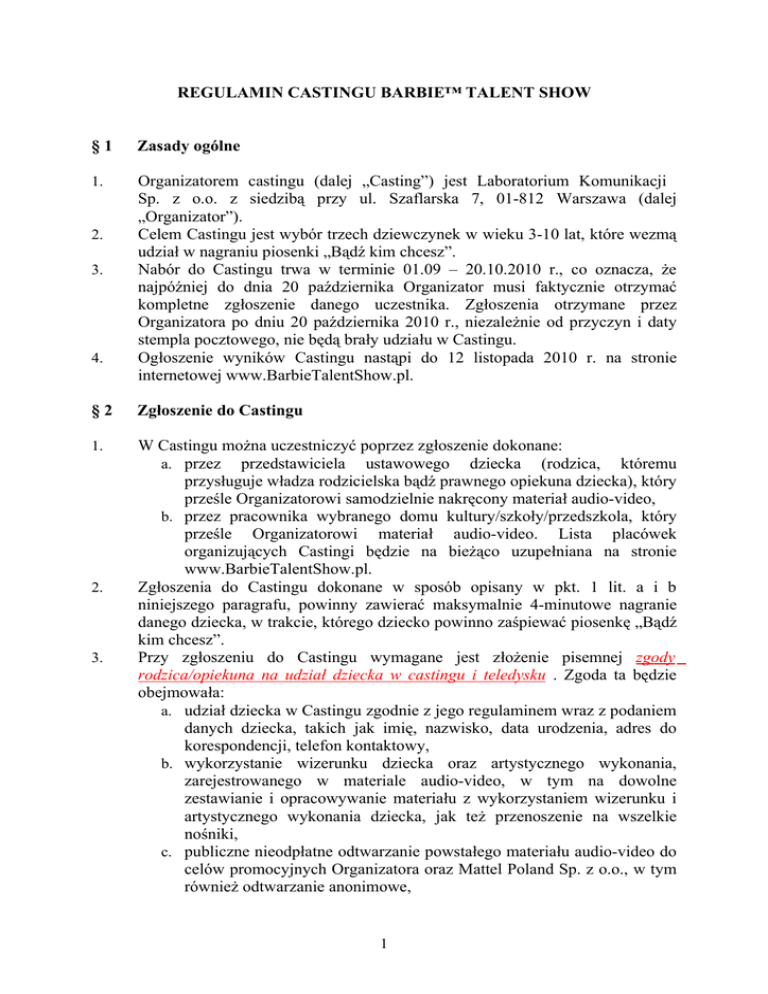 REGULAMIN CASTINGU BARBIE™ TALENT SHOW §1 Zasady ogólne 1. Organizatorem castingu (dalej „Casting”) jest Laboratorium Komunikacji Sp. z o.o. z siedzibą przy ul. Szaflarska 7, 01-812 Warszawa (dalej „Organizator”). Celem Castingu jest wybór trzech dziewczynek w wieku 3-10 lat, które wezmą udział w nagraniu piosenki „Bądź kim chcesz”. Nabór do Castingu trwa w terminie 01.09 – 20.10.2010 r., co oznacza, że najpóźniej do dnia 20 października Organizator musi faktycznie otrzymać kompletne zgłoszenie danego uczestnika. Zgłoszenia otrzymane przez Organizatora po dniu 20 października 2010 r., niezależnie od przyczyn i daty stempla pocztowego, nie będą brały udziału w Castingu. Ogłoszenie wyników Castingu nastąpi do 12 listopada 2010 r. na stronie internetowej www.BarbieTalentShow.pl. 2. 3. 4. §2 Zgłoszenie do Castingu 1. W Castingu można uczestniczyć poprzez zgłoszenie dokonane: a. przez przedstawiciela ustawowego dziecka (rodzica, któremu przysługuje władza rodzicielska bądź prawnego opiekuna dziecka), który prześle Organizatorowi samodzielnie nakręcony materiał audio-video, b. przez pracownika wybranego domu kultury/szkoły/przedszkola, który prześle Organizatorowi materiał audio-video. Lista placówek organizujących Castingi będzie na bieżąco uzupełniana na stronie www.BarbieTalentShow.pl. Zgłoszenia do Castingu dokonane w sposób opisany w pkt. 1 lit. a i b niniejszego paragrafu, powinny zawierać maksymalnie 4-minutowe nagranie danego dziecka, w trakcie, którego dziecko powinno zaśpiewać piosenkę „Bądź kim chcesz”. Przy zgłoszeniu do Castingu wymagane jest złożenie pisemnej zgody rodzica/opiekuna na udział dziecka w castingu i teledysku . Zgoda ta będzie obejmowała: a. udział dziecka w Castingu zgodnie z jego regulaminem wraz z podaniem danych dziecka, takich jak imię, nazwisko, data urodzenia, adres do korespondencji, telefon kontaktowy, b. wykorzystanie wizerunku dziecka oraz artystycznego wykonania, zarejestrowanego w materiale audio-video, w tym na dowolne zestawianie i opracowywanie materiału z wykorzystaniem wizerunku i artystycznego wykonania dziecka, jak też przenoszenie na wszelkie nośniki, c. publiczne nieodpłatne odtwarzanie powstałego materiału audio-video do celów promocyjnych Organizatora oraz Mattel Poland Sp. z o.o., w tym również odtwarzanie anonimowe, 2. 3. 1 d. przetwarzanie danych osobowych dziecka przez Organizatora w celu 4. 5. 6. 7. 8. §3 1. 2. 2. Wybór zwycięzców Wybór zwycięzców Castingu będzie dwuetapowy. W pierwszym etapie zostanie wyłonionych 50 najlepszych zgłoszeń. W drugim etapie wyboru trzech najlepiej śpiewających Uczestników dokona jury, w skład którego wejdą: a. Przedstawiciel firmy Mattel Poland Sp. z o.o. b. Przedstawicie firmy Laboratorium Komunikacji Sp. z o.o. (3 osoby) Uczestnicy będą oceniani przez jury wg kryteriów: słuchu, dykcji, poczucia rytmu, zdolności aktorskich (interpretacja) i charyzmy. 3. Organizator ani jury nie ma obowiązku uzasadniać dokonanych wyborów. §4 1. przeprowadzenia Castingu, ogłoszenia jego wyników i wydania nagród. Zgłoszenia dokonane w sposób opisany w pkt. 1 lit. a i b winny być przekazywane pocztą lub kurierem na adres Organizatora, Laboratorium Komunikacji Sp. z o.o., ul. Szaflarska 7, 01-812 Warszawa, z dopiskiem na kopercie „Casting”, na wyłączny koszt nadawcy. Organizator nie ponosi odpowiedzialności za funkcjonowanie podmiotów, za pośrednictwem których przesyłane będą zgłoszenia. Zgłoszenia nadesłane po 20 października 2010 r. nie będą brały udziału w Castingu. Organizator nie zwraca nadesłanych materiałów ani nie udostępnia materiałów nagranych przez Organizatora w związku z przeprowadzaniem Castingu. Organizator zastrzega sobie prawo do weryfikacji podanych danych dziecka, w szczególności poprzez żądanie okazania dokumentu, potwierdzającego tożsamość i wiek dziecka. Stwierdzenie niezgodności podanych danych oznacza wykluczenie z udziału w Castingu. Nagrody dla zwycięzców Każdy spośród trzech zwycięzców Castingu uzyska możliwość wzięcia udziału w teledysku dziecięcym do piosenki „Bądź kim chcesz” produkowanego przez Organizatora oraz przejdzie szkolenie wokalne w Warsztatowej Akademii Musicalowej, odpowiednio do postanowień § 1 pkt 2 regulaminu. Organizator opłaca przejazd i pobyt zwycięzcy oraz jego opiekuna. Każdy ze zwycięzców otrzyma nagrodę dodatkową w postaci pokrycia kosztów rocznych zajęć pozalekcyjnych, wspierających talent muzyczny, do kwoty 2.000 zł brutto (wraz z podatkiem od nagród), wg wyboru uczestnika. Organizator zobowiązuje się do zapłaty faktury (rachunku) za wybrane zajęcia w terminie w niej wskazanym, po jej przedstawieniu przez rodziców lub opiekunów prawnych zwycięzcy, z tym że faktura (rachunek) winna być przekazana Organizatorowi najpóźniej na tydzień przed terminem płatności i nie później niż do 31 stycznia 2011 r. §5 Domy kultury, szkoły, przedszkola 2 1. 2. W przypadku, gdyby któryś ze zwycięzców został wyłoniony spośród zgłoszeń nadesłanych przez dom kultury/szkołę/przedszkole, wówczas niezależnie od postanowień § 4 regulaminu, Organizator przekaże nagrodę specjalną koordynatorowi Castingu z domu kultury/szkoły/przedszkola, w którym zwycięzca brał udział. Nagrodą specjalną będzie netbook Asus Eee PC 1201HA. Jeden koordynator może otrzymać tylko jedną nagrodę, niezależnie od ilości wyłonionych zwycięzców będących pod jego opieką. W przypadku wyłonienia więcej niż jednego zwycięzcy z jednego domu kultury/szkoły/przedszkola nagrody specjalne zostaną przekazane tylko raz. Nagrody specjalne trafią do koordynatorów nie później niż do 31 stycznia 2011 r. Organizator zastrzega sobie prawo do zastąpienia nagrody wskazanej w Regulaminie nagrodą zastępczą podobnego typu i wartości do nagrody przewidzianej w Regulaminie W przypadku,