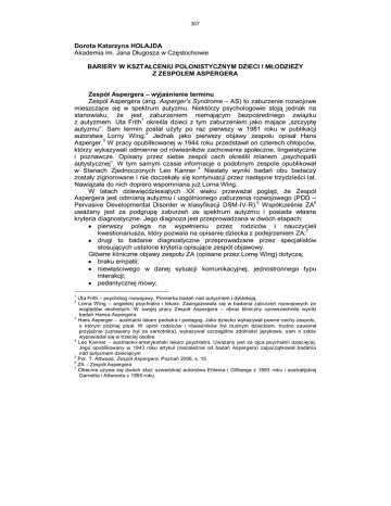 307 Dorota Katarzyna HOLAJDA Akademia im. Jana Długosza w Częstochowie BARIERY W KSZTAŁCENIU POLONISTYCZNYM DZIECI I MŁODZIEŻY Z ZESPOŁEM ASPERGERA Zespół Aspergera – wyjaśnienie terminu Zespół Aspergera (ang. Asperger's Syndrome – AS) to zaburzenie rozwojowe mieszczące się w spektrum autyzmu. Niektórzy psychologowie stoją jednak na stanowisku, że jest zaburzeniem niemającym bezpośredniego związku z autyzmem. Uta Frith1 określa dzieci z tym zaburzeniem jako mające „szczyptę autyzmu”. Sam termin został użyty po raz pierwszy w 1981 roku w publikacji autorstwa Lorny Wing.2 Jednak jako pierwszy objawy zespołu opisał Hans Asperger. 3 W pracy opublikowanej w 1944 roku przedstawił on czterech chłopców, którzy wykazywali odmienne od rówieśników zachowania społeczne, lingwistyczne i poznawcze. Opisany przez siebie zespół cech określił mianem „psychopatii autystycznej”. W tym samym czasie informacje o podobnym zespole opublikował w Stanach Zjednoczonych Leo Kanner.4 Niestety wyniki badań obu badaczy zostały zignorowane i nie doczekały się kontynuacji przez następne trzydzieści lat. Nawiązała do nich dopiero wspomniana już Lorna Wing. W latach dziewięćdziesiątych XX wieku przeważał pogląd, że Zespół Aspergera jest odmianą autyzmu i uogólnionego zaburzenia rozwojowego (PDD – Pervasive Developmental Disorder w klasyfikacji DSM-IV-R).5 Współcześnie ZA6 uważany jest za podgrupę zaburzeń ze spektrum autyzmu i posiada własne kryteria diagnostyczne. Jego diagnoza jest przeprowadzana w dwóch etapach: pierwszy polega na wypełnieniu przez rodziców i nauczycieli kwestionariusza, który pozwala na opisanie dziecka z podejrzeniem ZA;7 drugi to badanie diagnostyczne przeprowadzane przez specjalistów stosujących ustalone kryteria opisujące zespół objawowy. Główne kliniczne objawy zespołu ZA (opisane przez Lornę Wing) dotyczą: braku empatii; niewłaściwego w danej sytuacji komunikacyjnej, jednostronnego typu interakcji; pedantycznej mowy; 1 Uta Frith – psycholog rozwojowy. Pionierka badań nad autyzmem i dysleksją. Lorna Wing – angielski psychiatra i lekarz. Zaangażowała się w badania zaburzeń rozwojowych ze względów osobistych. W swojej pracy Zespół Aspergera – obraz kliniczny upowszechniła wyniki badań Hansa Aspergera. 3 Hans Asperger – austriacki lekarz pediatra i pedagog. Jako dziecko wykazywał pewne cechy zespołu, o którym później pisał. W opinii rodziców i rówieśników był trudnym dzieckiem, trudno zawierał przyjaźnie (uznawany był za samotnika), wykazywał szczególne zdolności językowe, sam o sobie wypowiadał się w trzeciej osobie. 4 Leo Kanner – austriacko-amerykański lekarz psychiatra. Uważany jest za ojca psychiatrii dziecięcej. Jego opublikowany w 1943 roku artykuł (niezależnie od badań Aspergera) zapoczątkował badania nad autyzmem dziecięcym 5 Por. T. Attwood, Zespół Aspergera. Poznań 2006, s. 15 6 ZA – Zespół Aspergera 7 Obecnie używa się dwóch skal: szwedzkiej autorstwa Ehlersa i Gillberga z 1993 roku i australijskiej Garnetta i Attwooda z 1995 roku. 2 308 zubożonej komunikacji niewerbalnej; obsesyjnego zainteresowania wybranymi zagadnieniami; zaburzeniami rozwoju motorycznego; 8 charakterystycznej postury. Na potrzeby tego artykułu zostanie przyjęta następująca definicja omawianego zaburzenia: Zespół Aspergera jest jednym z kręgu autyzmu całościowych zaburzeń rozwoju, które łączą objawy w kilku podstawowych sferach: kontaktów społecznych, komunikacji, zachowań i zainteresowań, jak również nadwrażliwości sensorycznej na różnego rodzaju bodźce.9 Objawy Zespołu Aspergera ZA jest zaburzeniem trudnym do zdiagnozowania. Pierwsze objawy mogą wystąpić już we wczesnym okresie życia, ale najczęściej są one bagatelizowane. Niektóre dzieci mogą początkowo nie wykazywać żadnych zaburzeń z wyjątkiem opóźnionego rozwoju sprawności ruchowej. Trudności ujawniają się z chwilą pójścia dziecka do przedszkola. Dostrzec wtedy można: unikanie spontanicznych kontaktów, schematyczne zachowania, nieumiejętność czekania na swoją kolej, nieumiejętność przystosowania się do grupy rówieśniczej, powtarzanie wypowiedzi, wyraźnie widoczne zainteresowanie jednym tematem. Dzieci te stają ekspertami w interesujących je dziedzinach. Dzieci z ZA wyróżniają się ponadto wczesną umiejętnością rozpoznawania liter i czytania, doskonałą, wręcz fotograficzną pamięcią. Z chwilą rozpoczęcia nauki w szkole symptomy nasilają się. Dzieci te wyróżniają się w grupie. Wykazują niedojrzałość w kontaktach z rówieśnikami i nawiązywaniem kontaktów społecznych. Są one często nierozumiane przez nauczycieli i pozostałych uczniów. Kłopoty sprawiają im zarówno komunikacja werbalna jak i pozawerbalna. Niewłaściwie interpretują sygnały wysyłane przez inne osoby. Zespołowi Aspergera towarzyszą często inne zaburzenia. Wśród nich najpowszechniejsze są: Attention Deficit Hyperactivity Disorder (ADHD/ADD), czyli zaburzenia koncentracji i/lub uwagi; Zespół Tourette’a – zaburzenie to może przybierać charakter motoryczny (np. machanie rękami) lub głosowe (wydawanie różnych dźwięków, zgrzytanie, mimowolne wypowiadanie słów, w tym także niecenzuralnych); dysgrafia – mało lub wcale nieczytelne pismo; dysleksja – kłopoty z opanowaniem umiejętności czytania; niezgrabność ruchowa – zaburzenia w sferze integracji sensorycznej; dyspraksja – zaburzenie powodujące upośledzenie nabywania umiejętności ubierania się, jazdy na rowerze, grania w piłkę, podnoszenia małych przedmiotów; 8 9 Por. T. Attwood, op. cit., s. 15 J. Święcicka, Uczeń z zespołem Aspergera. Praktyczne wskazówki dla nauczyciela. Kraków 2010, s. 10 309 echolalia – zaburzenie objawiające się, jako niepotrzebne powtarzanie słów i zwrotów wypowiedzianych wcześniej przez inne osoby (echolalia może mieć