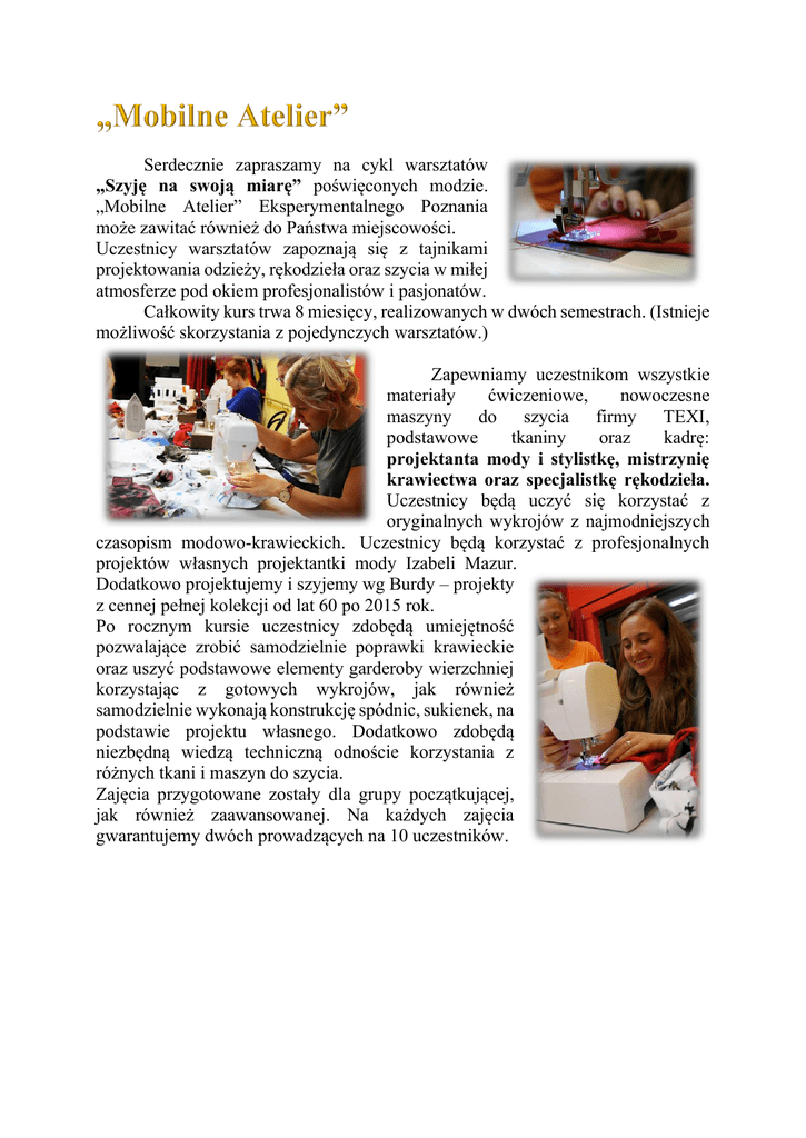 Serdecznie zapraszamy na cykl warsztatów „Szyję na swoją miarę” poświęconych modzie. „Mobilne Atelier” Eksperymentalnego Poznania może zawitać również do Państwa miejscowości. Uczestnicy warsztatów zapoznają się z tajnikami projektowania odzieży, rękodzieła oraz szycia w miłej atmosferze pod okiem profesjonalistów i pasjonatów. Całkowity kurs trwa 8 miesięcy, realizowanych w dwóch semestrach. (Istnieje możliwość skorzystania z pojedynczych warsztatów.) Zapewniamy uczestnikom wszystkie materiały ćwiczeniowe, nowoczesne maszyny do szycia firmy TEXI, podstawowe tkaniny oraz kadrę: projektanta mody i stylistkę, mistrzynię krawiectwa oraz specjalistkę rękodzieła. Uczestnicy będą uczyć się korzystać z oryginalnych wykrojów z najmodniejszych czasopism modowo-krawieckich. Uczestnicy będą korzystać z profesjonalnych projektów własnych projektantki mody Izabeli Mazur. Dodatkowo projektujemy i szyjemy wg Burdy – projekty z cennej pełnej kolekcji od lat 60 po 2015 rok. Po rocznym kursie uczestnicy zdobędą umiejętność pozwalające zrobić samodzielnie poprawki krawieckie oraz uszyć podstawowe elementy garderoby wierzchniej korzystając z gotowych wykrojów, jak również samodzielnie wykonają konstrukcję spódnic, sukienek, na podstawie projektu własnego. Dodatkowo zdobędą niezbędną wiedzą techniczną odnoście korzystania z różnych tkani i maszyn do szycia. Zajęcia przygotowane zostały dla grupy początkującej, jak również zaawansowanej. Na każdych zajęcia gwarantujemy dwóch prowadzących na 10 uczestników. Warsztat trwający 2 miesiące od 27października do 29 lutego 2015. Przewidziano zajęcia dotyczące tkanin jesiennych, funkcji odzieży oraz projektowanie na swoją miarę, konstrukcję i szycie: spódnicy oraz kreacji sylwestrowej. Uczestników zapraszam w kolorowy świat tiuli, błyskotek, ozdóbek i cudownych puzderek. Razem zaprojektujemy kostium karnawałowy, biżuterię oraz kapelusze. 60 godzin warsztatowych zrealizowanych w 15 spotkaniach. Warsztaty trwają 4 miesiące od 1 marca do 30 czerwca. Wiosenne przebudzenie oraz burza kolorów stanowić będą inspirację dla uczestników kolejnego warsztatu. Wspaniała przygoda z rękodziełem: patchworkowa zastawa stołu wielkanocnego, malowanie na tkaninie oraz szycie na zaprojektowanej tkaninie. 60 godzin warsztatowych zrealizowanych w 15 spotkaniach. Gratis: tkaniny, nici włóczki, materiały artystyczne, Książka „Szycie na swoją miarę”, Koszt 30 zł / godzina przeliczeniowa zajęć za osobę, 120 zł /4x30 zł/ jeden dzień warsztatowy. Koszt dla osób zapisujących się na cały kurs: 18% obniżka. Przewidziano 8 rat po 390 zł miesięcznie za 120 godz. !!!Maszyna do szycia gratis firmy TEXI (dla osób z 95% frekwencją) Data TEMAT 27.10.2015 "Ciepło jesienno zimowej kolekcji - Stylizacja na swoją miarę" 10.11.2015 Niezbędniki domowej krawcowej, czyli igielniki i inne skarby ukryte w "Przyborniku Krawieckim"; Techniki szycia maszyną komputerową. Szyjemy pierwsze "Fartuszki". 17.11.2015 Konstrukcja i wymiarowanie spódnicy podstawowej 24.11.2015 wykonanie spódnicy podstawowej 1.12.2015 wykonanie spódnicy podstawowej 8.12.2015 "Mała czarna" zaprojektowana na Twoją miarę przez profesjonalistów. 15.12.2015 Szyjemy "Małą czarną" zaprojektowaną na swoją miarę. 22.12.2015 Stylizacje i dodatki do "Małej Czarnej" na bal sylwestrowy. 5.01.2016 "Tysiąc barw karnawału" projekty kapeluszy, cylindrów i biżuterii 3.11.2015 12.01.2016 Tysiąc barw w kreacjach karnawałowych dla Ciebie lub Twojej pociech - projektowanie. 2.02.2016 Tysiąc barw w kreacjach karnawałowych dla Ciebie lub Twojej pociech - wykonanie 9.02.2016 "Tysiąc barw karnawału" projekty biżuterii 16.02.2016 "Dzianina na warsztat" - cz. I projektowanie sukienki lub bluzki. 23.02.2016 "Dzianina na warsztat" - cz. II techniki szycia dzianiny. 1.03.2016 "Metamorfozy z zielonej szafy" 8.03.2016 Metamorfozy wiosenne: cz. I Zaprojektuj swoje okno: firanki, rolety rzymskie i zasłony 15.03.2016 Metamorfozy wiosenne: cz. II Stół świąteczny (bieżniki, ręczniczki i serwetki) 29.03.2016 5.04.2016 12.04.2016 Metamorfozy wiosenne: cz. III Poduszkowe rozmaitości. Spodnie cz. I Spodnie cz. II 19.04.2016 "Malowana Spódnica z półkola" cz. I 26.04.2016 10.05.2016 17.05.2016 24.05.2016 31.05.2016 6.06.2016 13.06.2016 20.06.2016 "Malowana Spódnica z półkola" cz. II Design Tkaniny- malowanie… Bluzka podstawowa biała cz. I Bluzka podstawowa biała cz. II Torebka cz. I Torebka cz. II Mój styl-mój nowy look pokaz mody