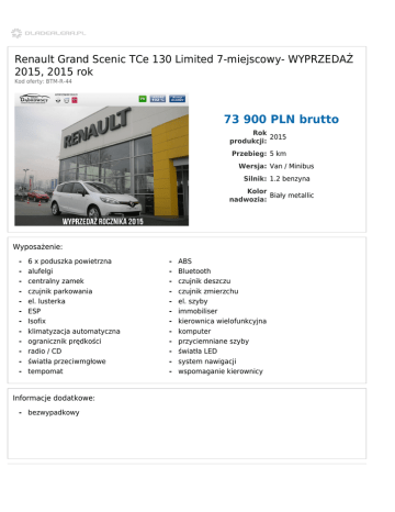 Renault Grand Scenic TCe 130 Limited 7-miejscowy- WYPRZEDAŻ 2015, 2015 rok Kod oferty: BTM-R-44 73 900 PLN brutto Rok 2015 produkcji: Przebieg: 5 km Wersja: Van / Minibus Silnik: 1.2 benzyna Kolor Biały metallic nadwozia: Wyposażenie: - 6 x poduszka powietrzna alufelgi centralny zamek czujnik parkowania el. lusterka ESP Isofix klimatyzacja automatyczna ogranicznik prędkości radio / CD światła przeciwmgłowe tempomat Informacje dodatkowe: - bezwypadkowy - ABS Bluetooth czujnik deszczu czujnik zmierzchu el. szyby immobiliser kierownica wielofunkcyjna komputer przyciemniane szyby światła LED system nawigacji wspomaganie kierownicy Dąbrowscy Sp. z o.o. ul. Strzelców Bytomskich 51 41-902 Bytom Tel.: 32 387 29 39 Fax:
