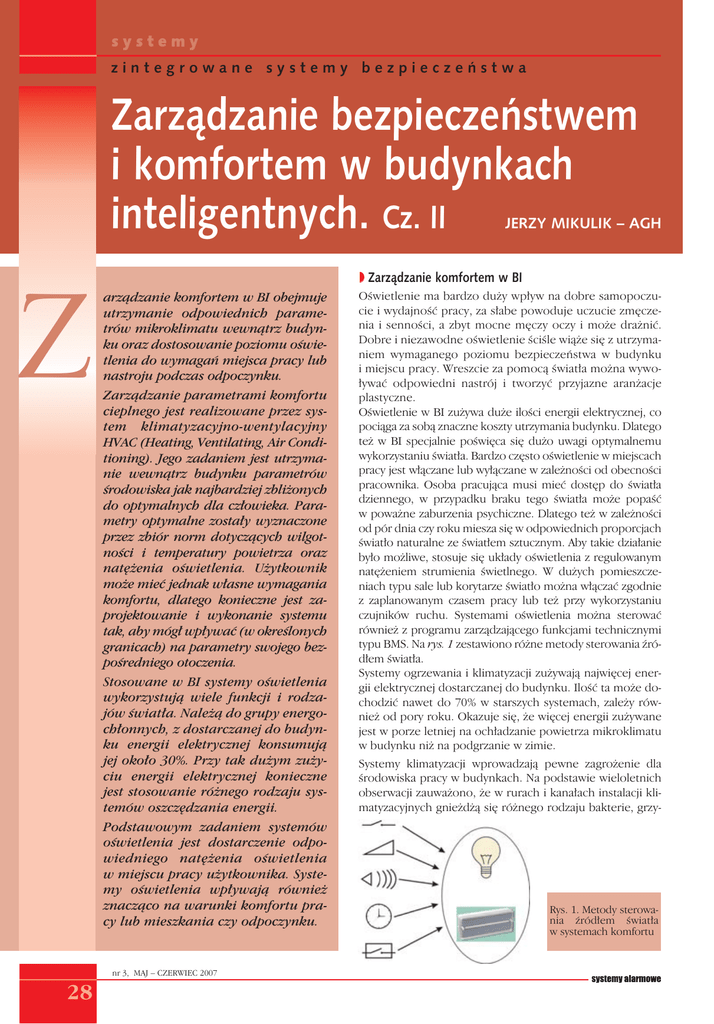 systemy zintegrowane systemy bezpieczeństwa Zarządzanie bezpieczeństwem i komfortem w budynkach inteligentnych. Cz. II JERZY MIKULIK – AGH w Zarządzanie komfortem w BI Z arządzanie komfortem w BI obejmuje utrzymanie odpowiednich parametrów mikroklimatu wewnątrz budynku oraz dostosowanie poziomu oświetlenia do wymagań miejsca pracy lub nastroju podczas odpoczynku. Zarządzanie parametrami komfortu cieplnego jest realizowane przez system klimatyzacyjno-wentylacyjny HVAC (Heating, Ventilating, Air Conditioning). Jego zadaniem jest utrzymanie wewnątrz budynku parametrów środowiska jak najbardziej zbliżonych do optymalnych dla człowieka. Parametry optymalne zostały wyznaczone przez zbiór norm dotyczących wilgotności i temperatury powietrza oraz natężenia oświetlenia. Użytkownik może mieć jednak własne wymagania komfortu, dlatego konieczne jest zaprojektowanie i wykonanie systemu tak, aby mógł wpływać (w określonych granicach) na parametry swojego bezpośredniego otoczenia. Stosowane w BI systemy oświetlenia wykorzystują wiele funkcji i rodzajów światła. Należą do grupy energochłonnych, z dostarczanej do budynku energii elektrycznej konsumują jej około 30%. Przy tak dużym zużyciu energii elektrycznej konieczne jest stosowanie różnego rodzaju systemów oszczędzania energii. Podstawowym zadaniem systemów oświetlenia jest dostarczenie odpowiedniego natężenia oświetlenia w miejscu pracy użytkownika. Systemy oświetlenia wpływają również znacząco na warunki komfortu pracy lub mieszkania czy odpoczynku. nr 3, MAJ – CZERWIEC 2007 28 Oświetlenie ma bardzo duży wpływ na dobre samopoczucie i wydajność pracy, za słabe powoduje uczucie zmęczenia i senności, a zbyt mocne męczy oczy i może drażnić. Dobre i niezawodne oświetlenie ściśle wiąże się z utrzymaniem wymaganego poziomu bezpieczeństwa w budynku i miejscu pracy. Wreszcie za pomocą światła można wywoływać odpowiedni nastrój i tworzyć przyjazne aranżacje plastyczne. Oświetlenie w BI zużywa duże ilości energii elektrycznej, co pociąga za sobą znaczne koszty utrzymania budynku. Dlatego też w BI specjalnie poświęca się dużo uwagi optymalnemu wykorzystaniu światła. Bardzo często oświetlenie w miejscach pracy jest włączane lub wyłączane w zależności od obecności pracownika. Osoba pracująca musi mieć dostęp do światła dziennego, w przypadku braku tego światła może popaść w poważne zaburzenia psychiczne. Dlatego też w zależności od pór dnia czy roku miesza się w odpowiednich proporcjach światło naturalne ze światłem sztucznym. Aby takie działanie było możliwe, stosuje się układy oświetlenia z regulowanym natężeniem strumienia świetlnego. W dużych pomieszczeniach typu sale lub korytarze światło można włączać zgodnie z zaplanowanym czasem pracy lub też przy wykorzystaniu czujników ruchu. Systemami oświetlenia można sterować również z programu zarządzającego funkcjami technicznymi typu BMS. Na rys. 1 zestawiono różne metody sterowania źródłem światła. Systemy ogrzewania i klimatyzacji zużywają najwięcej energii elektrycznej dostarczanej do budynku. Ilość ta może dochodzić nawet do 70% w starszych systemach, zależy również od pory roku. Okazuje się, że więcej energii zużywane jest w porze letniej na ochładzanie powietrza mikroklimatu w budynku niż na podgrzanie w zimie. Systemy klimatyzacji wprowadzają pewne zagrożenie dla środowiska pracy w budynkach. Na podstawie wieloletnich obserwacji zauważono, że w rurach i kanałach instalacji klimatyzacyjnych gnieżdżą się różnego rodzaju bakterie, grzy- Rys. 1. Metody sterowania źródłem światła w systemach komfortu by i inne szkodliwe dla człowieka drobnoustroje. W przewodach tych panują bardzo dobre warunki do rozwoju bakterii, powietrze w rurach ma bowiem stabilizowaną temperaturę i wilgotność. I następnie to zanieczyszczone powietrze jest tłoczone do pomieszczeń, gdzie pracują ludzie, co oczywiście powoduje choroby i dolegliwości. W pierwszych latach stosowania klimatyzacji centralnej z dużymi centralami i długimi przewodami klimatyzacyjnymi powstało określenie chorego budynku SBS (Sick Building Syndrome). Budynek był chory głównie z powodu źle działającej klimatyzacji, co przenosiło się na nieprawidłowe parametry mikroklimatu wewnątrz obiektu. Dopiero później wprowadzono odpowiednie przepisy nakazujące aktywne czyszczenie przewodów klimatyzacyjnych. Szukano też innych bezpieczniejszych rozwiązań, wprowadzając jednostki klimatyzacyjne lokalne, montowane w poszczególnych pokojach. Dominują oczywiście budynki zdrowe, których jest około 65%. Natomiast chore można ogólnie podzielić na dwie grupy: budynki chore o znanej przyczynie choroby (25%) oraz budynki chore o nieznanej przyczynie choroby (5%). Znana przyczyna choroby budynku to przeważnie zła jakość powietrza w wewnętrznym mikroklimacie, za mała wilgotność lub niewłaściwa temperatura powietrza, czyli źle działająca klimatyzacja. Na nieznaną chorobę budynku wpływają przeważnie nowe, o nieznanych jeszcze do końca właściwościach materiały konstrukcyjne lub wykończeniowe, czy też niewłaściwie rozlokowane urządzanie biurowe, np. kserokopiarki. Wszystkie te rozważania dotyczą wielkich budynków biurowych, w których pracujący człowiek może spędzać nawet ponad 40 godzin w tygodniu. Aby poradzić sobie ze złym mikroklimatem wytwarzanym przez wielkie centrale klimatyzacyjne wprowadzono małe jednostki utrzymujące dobry mikroklimat w pokojach. Na rys. 2 zestawiono schemat funkcjonalny dużej centrali klimatyzacyjnej z lokalną jednostką klimatyzacyjną typu fancoil. Różnica w ich działaniu polega na tym, że lokalna jednostka wykorzystuje i usprawnia powietrze znajdujące się w małym, lokalnym pomieszczeniu, duża centrala natomiast przygotowuje powietrze gdzieś daleko, np. na dachu budynku i następnie
