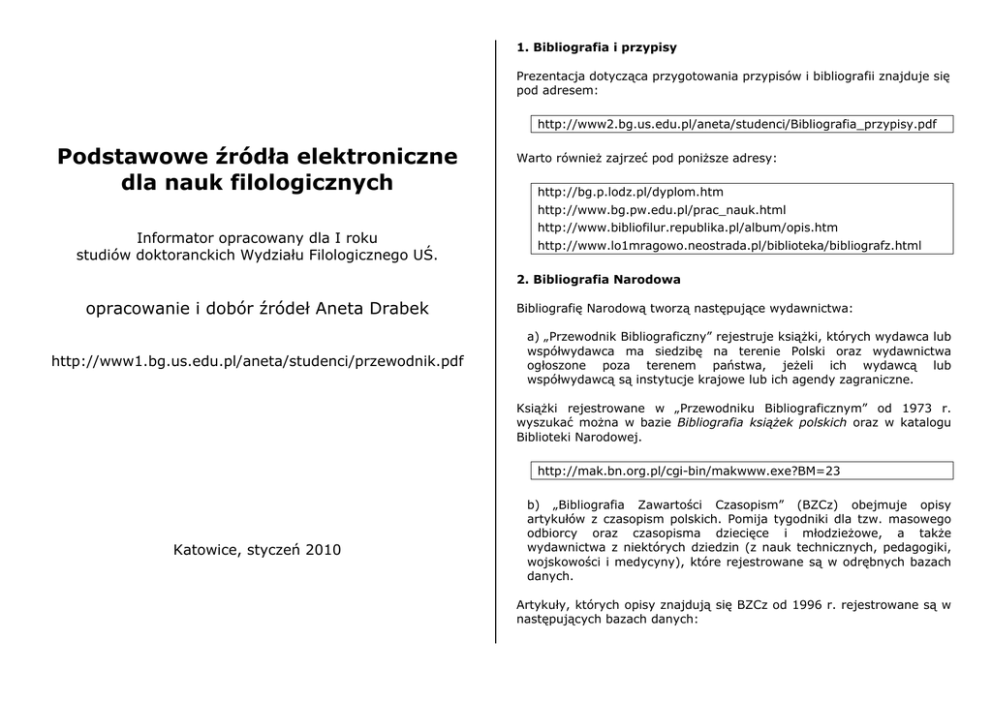 1. Bibliografia i przypisy Prezentacja dotycząca przygotowania przypisów i bibliografii znajduje się pod adresem: http://www2.bg.us.edu.pl/aneta/studenci/Bibliografia_przypisy.pdf Podstawowe źródła elektroniczne dla nauk filologicznych Warto również zajrzeć pod poniższe adresy: http://bg.p.lodz.pl/dyplom.htm http://www.bg.pw.edu.pl/prac_nauk.html Informator opracowany dla I roku studiów doktoranckich Wydziału Filologicznego UŚ. http://www.bibliofilur.republika.pl/album/opis.htm http://www.lo1mragowo.neostrada.pl/biblioteka/bibliografz.html 2. Bibliografia Narodowa opracowanie i dobór źródeł Aneta Drabek http://www1.bg.us.edu.pl/aneta/studenci/przewodnik.pdf Bibliografię Narodową tworzą następujące wydawnictwa: a) „Przewodnik Bibliograficzny” rejestruje książki, których wydawca lub współwydawca ma siedzibę na terenie Polski oraz wydawnictwa ogłoszone poza terenem państwa, jeżeli ich wydawcą lub współwydawcą są instytucje krajowe lub ich agendy zagraniczne. Książki rejestrowane w „Przewodniku Bibliograficznym” od 1973 r. wyszukać można w bazie Bibliografia książek polskich oraz w katalogu Biblioteki Narodowej. http://mak.bn.org.pl/cgi-bin/makwww.exe?BM=23 Katowice, styczeń 2010 b) „Bibliografia Zawartości Czasopism” (BZCz) obejmuje opisy artykułów z czasopism polskich. Pomija tygodniki dla tzw. masowego odbiorcy oraz czasopisma dziecięce i młodzieżowe, a także wydawnictwa z niektórych dziedzin (z nauk technicznych, pedagogiki, wojskowości i medycyny), które rejestrowane są w odrębnych bazach danych. Artykuły, których opisy znajdują się BZCz od 1996 r. rejestrowane są w następujących bazach danych: Artykuły z czasopism polskich (1996-2004) http://mak.bn.org.pl/cgi-bin/makwww.exe?BM=3 Artykuły z czasopism polskich (2005-) http://mak.bn.org.pl/cgi-bin/makwww.exe?BM=25 Artykuły z gazet i tygodników polskich (1996-2004) http://mak.bn.org.pl/cgi-bin/makwww.exe?BM=20 Artykuły z gazet i tygodników polskich (2005-) http://mak.bn.org.pl/cgi-bin/makwww.exe?BM=26 c) Bibliografia wydawnictw ciągłych (BWC) rejestruje wydawnictwa ciągłe ukazujące w Polsce w danym roku, zgodnie z kryterium daty nominalnej, tj. roku, na który lub za który wydawnictwa te zostały opublikowane. Informacje o czasopismach znaleźć można w następujących bazach danych: BWC 1958-1975 http://mak.bn.org.pl/cgi-bin/makwww.exe?BM=34 BWC 1976-1980 http://mak.bn.org.pl/cgi-bin/makwww.exe?BM=35 BWC 1985-1989 http://mak.bn.org.pl/cgi-bin/makwww.exe?BM=36 BWC 1996-1999 http://mak.bn.org.pl/cgi-bin/makwww.exe?BM=37 BWC 2000 http://mak.bn.org.pl/cgi-bin/makwww.exe?BM=38 BWC 2001-2005 http://mak.bn.org.pl/cgi-bin/makwww.exe?BM=42 BWC 2006 http://mak.bn.org.pl/cgi-bin/makwww.exe?BM=43 BWC 2007 http://mak.bn.org.pl/cgi-bin/makwww.exe?BM=46 Bibliografia wydawnictw ciągłych nowych, zawieszonych i zmieniających tytuł: Czasopisma polskie 1985-2000 http://mak.bn.org.pl/cgi-bin/makwww.exe?BM=4 Czasopisma polskie 2001http://mak.bn.org.pl/cgi-bin/makwww.exe?BM=24 Uwaga! Najlepszym źródłem informacji o polskich czasopismach jest Narodowy Katalog Uniwersalny - NUKAT. d) Polonika Zagraniczne rejestrują wydane za granicą publikacje w języku polskim, przygotowane przez Polaków lub tematycznie dotyczące Polski. Polonica zagraniczne (1993-) http://mak.bn.org.pl/cgi-bin/makwww.exe?BM=11 e) Bibliografia dokumentów elektronicznych rejestruje opisy książek i czasopism elektronicznych wydanych na płytach CD lub DVD po 2001 roku. Nie rejestruje dokumentów dostępnych w Internecie. http://mak.bn.org.pl/cgi-bin/makwww.exe?BM=27 f) Bibliografia dokumentów kartograficznych rejestruje od 2002 roku wszystkie typy dokumentów kartograficznych (mapy, atlasy, globusy). http://mak.bn.org.pl/cgi-bin/makwww.exe?BM=45 g) Bibliografia dokumentów dźwiękowych zawiera opisy bibliograficzne dokumentów dźwiękowych opublikowanych w Polsce w latach od 1990 roku. http://mak.bn.org.pl/cgi-bin/makwww.exe?BM=44 h) Bibliografia polska (1901-1939) - zawiera informacje o książkach wydanych w l. 1901-1939. W tej chwili opracowano zakres A-Hoł. http://mak.bn.org.pl/cgi-bin/makwww.exe?BM=32 Wspólna wyszukiwarka większości baz danych Biblioteki Narodowej Fidkar 4. Polskie bazy literackie a) Polska Bibliografia Literacka ukazuje się od 1954 r., kiedy to wydano pierwszy rocznik – 1949. Wersja drukowana obejmuje lata 1944-1988. Wersja online obejmuje lata 1988-1998. Swym zasięgiem obejmuje prace z teorii i historii literatury, krytyki literackiej, teatralnej i filmowej, literatury współczesnej i życia literackiego. Odnotowuje także polskie teksty literackie i paraliterackie, ich przekłady, a także teksty literackie obce w przekładzie na język polski. Bibliografia rejestruje też inne formy recepcji literatury takie, jak: spektakle teatralne, słuchowiska radiowe, przedstawienia teatru telewizji oraz roczną produkcję polskich filmów fabularnych. http://pbl.ibl.poznan.pl/dostep/ b) Arton - Polska Literatura Humanistyczna obejmuje zawartość 24 polskich czasopism zakresu literaturoznawstwa, językoznawstwa i etnografii. W każdym rekordzie (oprócz standardowej informacji bibliograficznej) znajduje się pełna bibliografia załącznikowej. http://arton.bg.us.edu.pl/arton/arton.php http://mak.bn.org.pl/fidkar/ 3. MLA International Bibliography Baza danych opracowywana przez Modern Language Association of America, dotyczy zagadnień językoznawstwa współczesnego, literatury i etnografii. Zawiera dane pochodzące z ponad 3000 światowych czasopism i wydawnictw seryjnych, monografii, materiałów konferencyjnych, bibliografii i in. Szeroki zakres tematyczny bazy obejmuje najważniejsze zagadnienia literackie i lingwistyczne, jak: literatura narodowa, językoznawstwo, lingwistyka porównawcza, psycholingwistyka, socjolingwistyka, leksykologia, stylistyka, translacja, języki świata (naturalne i sztuczne), teoria literatury, krytyka literacka, formy i gatunki literackie