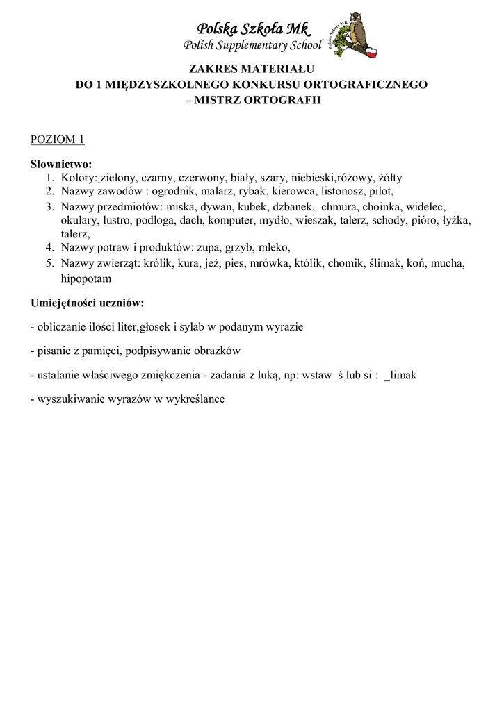 Polska Szkoła Mk Polish Supplementary School ZAKRES MATERIAŁU DO 1 MIĘDZYSZKOLNEGO KONKURSU ORTOGRAFICZNEGO – MISTRZ ORTOGRAFII POZIOM 1 Słownictwo: 1. Kolory: zielony, czarny, czerwony, biały, szary, niebieski,różowy, żółty 2. Nazwy zawodów : ogrodnik, malarz, rybak, kierowca, listonosz, pilot, 3. Nazwy przedmiotów: miska, dywan, kubek, dzbanek, chmura, choinka, widelec, okulary, lustro, podloga, dach, komputer, mydło, wieszak, talerz, schody, pióro, łyżka, talerz, 4. Nazwy potraw i produktów: zupa, grzyb, mleko, 5. Nazwy zwierząt: królik, kura, jeż, pies, mrówka, któlik, chomik, ślimak, koń, mucha, hipopotam Umiejętności uczniów: - obliczanie ilości liter,głosek i sylab w podanym wyrazie - pisanie z pamięci, podpisywanie obrazków - ustalanie właściwego zmiękczenia - zadania z luką, np: wstaw ś lub si : _limak - wyszukiwanie wyrazów w wykreślance Polska Szkoła Mk Polish Supplementary School POZIOM 2 Słownictwo: 1. Kolory: zielony, czarny, czerwony, biały, szary, niebieski, fioletowy, brązowy,różowy, żółty, 2. Nazwy zawodów: górnik, lekarz, aptekarz, tancerz, piekarz, weterynarz, piłkarz, architekt, 3. Nazwy przedmiotów: talerz, łyżka, nóż, stół, kuchenka, długopis, pioro, czajnik, piekarnik, szuflada, pudełko, lodówka, drzwi, obraz, schody, szczotka, suszarka, szampon, świeca, żelazko, husteczka, kubek, łyżka, huśtawka, chmura, żaglówka, taksówka, ołówek, samochód, herb, mech, chryzantemy, róża, góra, król, królowa 4. Nazwy potraw i produktów: zupa, grzyb, mleko, chrupki, pączek, ciasto, chleb, pszenica, burak, ogórek, orzechy 5. Nazwy zwierząt: hipopotam, mrówka, wół, królik, żółw, orzeł, żaba, żuk, chomik, jaskółka, słoń, dzik, ćma, bocian, mucha, ślimak, wąż 6. Czasowniki: czasowniki z końcówką – uje, 7. Imiona: Hania, Halina, Grzegorz, Michał, Łukasz, Henryk, Tadeusz Umiejętności uczniów: - pisanie ze słuchu podyktowanych pojedynczych wyrazów - rozwiązywanie krzyżówki ( hasła w formie obrazków) - ustalanie właściwej litery - wyrazy z luką, np: wstaw ś lub si : _limak, wstaw ó lub u : n_ż - tworzenie i odczytywanie wyrazów z diagramów np: d | w- ó – z | ł Polska Szkoła Mk Polish Supplementary School POZIOM 3 Słownictwo: 1. Kolory: zielony, czarny, czerwony, biały, szary, niebieski, fioletowy, brązowy, różowy, pomarańczowy, błękitny, żółty, 2. Nazwy zawodów: górnik, lekarz, aptekarz, tancerz, nauczyciel, listonosz, pilot, malarz, rybak, hydraulik, kucharz, pielęgniarz, archeolog, chemik, architekt, piekarz, weterynarz, strażak, dziennikarz, 3. Nazwy przedmiotów: nożyczki, łóżko, pokój, łazienka, krzeslo, filiżanka, półka, obrus, biurko, łóżko, grzebień, gąbka, stół, książka, żołędzie, jarzębina, krzak, orzechy, choinka, nóż, talerz, kubek, łyżka, huśtawka, chmura, porządek, księżyc, kałamarz, atrament, piórnik, długopis 4. Nazwy potraw i produktów: zupa, grzyb, mleko, chrupki, pączek, ciasto, kurczak, marchewka, porzeczka 5. Nazwy zwierząt: hipopotam, hiena,mrówka, wół, królik, żółw, orzel, trzmiel, żaba, żuk, chomik, słoń, dzik, wróbel, niedźwiedź, gąska, pszczoła, jaskółka, wiewiórka, gąsiennica, dzięcioł 6. Wyrazy ze zmiekczeniami: słonie, dłonie, czajnik, dynie, koń, słońce, słoń, ciastko, babcia, kapcie, ćma, sieć, dziadek, dziupla, dziecko, zielony, guzik, ziemniak, siodlo, kosiarka, osiol, siedem, ślimak, ślad, miś, źrenica, zima, śnieg, latarnia, 7. Czasowniki: wrzucić, kupić, ćwierkać, być/jest, robić, słychać, 8. Imiona: Hania, Halina, Grzegorz, Michał, Łukasz, Henryk, Tadeusz Umiejętności uczniów: - pisanie ze słuchu podyktowanych zdań. - rozwiązywanie krzyżówki ( hasła w formie obrazków) - ustalanie właściwej litery - wyrazy z luką, np: wstaw ś lub si : _limak, wstaw ó lub u : n_ż - tworzenie i odczytywanie wyrazów z diagramów np: d | w- ó – z | ł