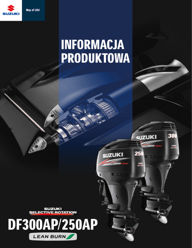 INFORMACJA PRODUKTOWA DF300AP/250AP LEAN BURN INFORMACJA PRODUKTOWA Pierwszy na świecie silnik zaburtowy z układem Selective Rotation, umożliwiającym zmianę kierunku obrotów śruby napędowej Nagrodzona konstrukcja silnika z możliwością zmiany kierunku obrotu śruby napędowej Prezentujący zaawansowane rozwiązania techniczne i konstrukcyjne, flagowy silnik zaburtowy Suzuki DF300 został dwukrotnie uznany za najbardziej innowacyjny silnik zaburtowy przemysłu morskiego. Gdy Suzuki wprowadziło pierwszą generację DF300 był on pierwszym na świecie czterosuwowym silnikiem zaburtowym o mocy 220,7 kW (300 KM), co zostało potwierdzone nagrodą za innowacyjność przyznaną w 2006 roku przez organizację NMMA (National Marine Manufacturers Association). Nowy DF300AP ma wiele nowatorskich rozwiązań, wśród których najbardziej godny uwagi jest układ Selective Rotation umożliwiający zmianę kierunku obrotów śruby napędowej. Wzmacniając koła zębate, inżynierowie Suzuki zaprojektowali przekładnię główną modelu DF300AP, która umożliwia obracanie się śruby w lewo lub w prawo. Ta funkcja, wprowadzona po raz pierwszy na świecie, była powodem ponownego przyznania nagrody za innowacyjność w 2012 roku przez organizację NMMA. Model DF250AP bazuje na modelu DF300AP, wykorzystując te same nagrodzone rozwiązania innowacyjne i konstrukcyjne. Wspaniałe osiągi i duża wygoda zostały osiągnięte dzięki wykorzystaniu mocy potężnego silnika V6 i zastosowaniu m.in. układu Selective Rotation, układu precyzyjnego sterowania Suzuki Precision Control i układu Suzuki Lean Burn Control sterującego spalaniem ubogich mieszanek. * Prosimy skonsultować z dealerem zmianę kierunku obrotów śruby napędowej. Najważniejsze cechy nowych silników DF300AP/250AP | | | | | 24-zaworowy silnik V6 DOHC o pojemności 4,0 litrów zapewnia ogromną moc 220,7 kW (300 KM)/184 kW (250 KM) i wysoki moment obrotowy. Nowa przekładnia główna wyposażona w układ Selective Rotation umożliwiający zmianę kierunku obrotów śruby napędowej - pierwszy na świecie silnik zaburtowy ze zmiennym kierunkiem obrotów śruby napędowej - oraz dwa otwory wlotowe do układu chłodzenia. Układ precyzyjnego sterowania Suzuki Precision Control - elektryczny układ sterowania przepustnicą i zmianą biegów zapewnia płynne i pewne sterowanie wyborem przełożenia. Układ Suzuki Lean Burn Control, który steruje spalaniem ubogich mieszanek i współpracuje z układem precyzyjnego sterowania Suzuki Precision Control zapewnia imponująco niskie zużycie paliwa w szerokim zakresie pracy i płynne przekazywanie mocy. Układ sterowania składem mieszanki paliwowo-powietrznej wykorzystując sygnał z czujnika tlenu, zapewnia niski poziom emisji zanieczyszczeń. Nowa przekładnia główna W porównaniu z pierwszym modelem DF300 największe zmiany dotyczą przekładni głównej, która została zmodyfikowana dla potrzeb układu Selective Rotation umożliwiającego zmianę kierunku obrotów śruby napędowej - jest to pierwszy na świecie silnik, w którym śruba może obracać się w obu kierunkach. Układ składa się z przekładni głównej, w której zespół kół zębatych pozwala na obracanie się śruby w wybranym kierunku oraz elektrycznego przełącznika w komorze silnika, za pomocą którego zmienia się kierunek obrotów. Tak jak w DF300, tak i w nowym DF300AP/250AP zastosowano duże przełożenie przekładni głównej wynoszące 2,08:1, które pozwala na zastosowanie śruby napędowej o średnicy 406 mm (16”). Te śruby występują w wielu wersjach różniących się wartością skoku, dzięki czemu zapewniają optymalne osiągi różnym rodzajom łodzi. Zmiany konstrukcji przekładni głównej oznaczają większą trwałość, a dwa wloty wody do układu chłodzenia zwiększyły skuteczność jego działania. Selective Rotation System - układ umożliwiający zmianę kierunku obrotów śruby napędowej W przypadku konwencjonalnych układów napędowych z dwoma silnikami, ich śruby obracają się w przeciwnych kierunkach. Pozwala to na utrzymanie stałego kursu i ograniczenie przechyłów łodzi. Przekładnia główna DF300AP/250AP ma specjalny zespół kół zębatych, który umożliwia zmianę kierunku obrotów śruby napędowej. Zastosowanie układu Suzuki Selective Rotation oznacza, że nie potrzeba kupować silników, których śruby obracają się w przeciwnych kierunkach. Zamiast tego jest specjalny przełącznik elektryczny w komorze silnika, który zmienia silnik ze śrubą prawoskrętną na silnik ze śrubą lewoskrętną.* Takie rozwiązanie, pierwsze wśród silników, było możliwe dzięki zastosowaniu specjalnej konstrukcji kół zębatych, wałka i łożysk w przekładni głównej, które zostały zaprojektowane tak, aby były trwałe i niezawodne w przypadku obu kierunków obrotów. Układ chłodzenia silnika wykorzystuje wodę pobieraną przez nisko położone otwory znajdujące się w obudowie przekładni głównej. ZastoPrzepływ wody sowanie dwóch otworów wlotowych zwiększa ilość wody płynącej przez przekładnię, zapewniając jej skuteczniejsze chłodzenie. Umieszczenie przedniego wlotu w kopułce obudowy przekładni zapewnia dużą ilość wody, szczególnie przy wysokich prędkościach. Drugi wlot jest również położony nisko, dzięki czemu DF300AP/250AP może być używany na płytkich wodach. Nowy DF300AP/250AP Nowy DF300AP/250APM arka a * Prosimy skonsultować z dealerem zmianę kierunku obrotów śruby napędowej. ** Aby zmienić kierunek obrotów należy oddzielnie kupić specjalny przełącznik i śrubę napędową. Marka a Linia wody Trymowanie Linia dna Nowa obudowa przekładni głównej o małym oporze hydrodynamicznym Suzuki siedmiokrotnie nagrodzone przez NMMA za innowacyjność Suzuki wykorzystuje zaawansowane rozwiązania techniczne, które pozwoliły silnikom zaburtowym Suzuki stanąć na czele stawki zaawansowanych konstrukcji. NMMA uznało DF