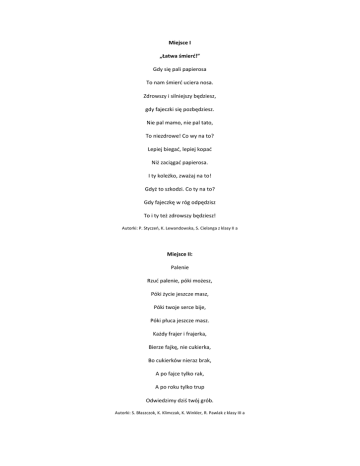 Miejsce I „Łatwa śmierć!” Gdy się pali papierosa To nam śmierd uciera nosa. Zdrowszy i silniejszy będziesz, gdy fajeczki się pozbędziesz. Nie pal mamo, nie pal tato, To niezdrowe! Co wy na to? Lepiej biegad, lepiej kopad Niż zaciągad papierosa. I ty koleżko, zważaj na to! Gdyż to szkodzi. Co ty na to? Gdy fajeczkę w róg odpędzisz To i ty też zdrowszy będziesz! Autorki: P. Styczeo, K. Lewandowska, S. Cielanga z klasy II a Miejsce II: Palenie Rzud palenie, póki możesz, Póki życie jeszcze masz, Póki twoje serce bije, Póki płuca jeszcze masz. Każdy frajer i frajerka, Bierze fajkę, nie cukierka, Bo cukierków nieraz brak, A po fajce tylko rak, A po roku tylko trup Odwiedzimy dziś twój grób. Autorki: S. Błaszczok, K. Klimczak, K. Winkler, R. Pawlak z klasy III a Miejsce III Nikotynka My dziewczynki małe Nie palimy wcale! Papierosy takie złe, więc do kosza wrzudmy je! Chłopcy też nie palą, bo im płuca uszkadzają i zapachy przeszkadzają! Wszyscy wiemy, że to zło, Więc nie bawmy się w to! Nikotyna wszystko psuje aż każdy żałuje, że się w to wpakuje! Autorki: K. Halama, N. Jachnicka. M. Michalik, M. Osadzin, K. Pierchała z klasy III b