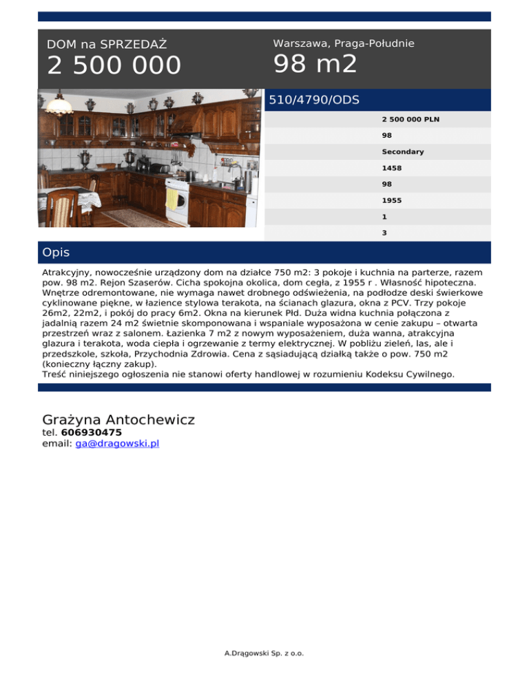 DOM na SPRZEDAŻ 2 500 000 Warszawa, Praga-Południe 98 m2 510/4790/ODS 2 500 000 PLN 98 Secondary 1458 98 1955 1 3 Opis Atrakcyjny, nowocześnie urządzony dom na działce 750 m2: 3 pokoje i kuchnia na parterze, razem pow. 98 m2. Rejon Szaserów. Cicha spokojna okolica, dom cegła, z 1955 r . Własność hipoteczna. Wnętrze odremontowane, nie wymaga nawet drobnego odświeżenia, na podłodze deski świerkowe cyklinowane piękne, w łazience stylowa terakota, na ścianach glazura, okna z PCV. Trzy pokoje 26m2, 22m2, i pokój do pracy 6m2. Okna na kierunek Płd. Duża widna kuchnia połączona z jadalnią razem 24 m2 świetnie skomponowana i wspaniale wyposażona w cenie zakupu – otwarta przestrzeń wraz z salonem. Łazienka 7 m2 z nowym wyposażeniem, duża wanna, atrakcyjna glazura i terakota, woda ciepła i ogrzewanie z termy elektrycznej. W pobliżu zieleń, las, ale i przedszkole, szkoła, Przychodnia Zdrowia. Cena z sąsiadującą działką także o pow. 750 m2 (konieczny łączny zakup). Treść niniejszego ogłoszenia nie stanowi oferty handlowej w rozumieniu Kodeksu Cywilnego. Grażyna Antochewicz tel. 606930475 email: [email protected] A.Drągowski Sp. z o.o. Powered by TCPDF (www.tcpdf.org)