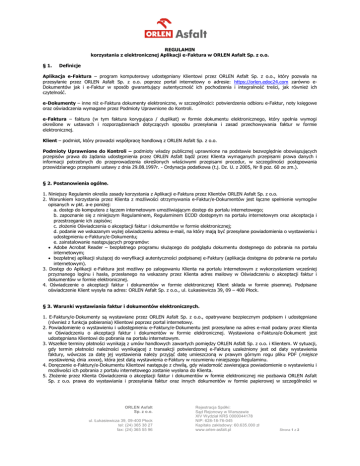 REGULAMIN korzystania z elektronicznej Aplikacji e-Faktura w ORLEN Asfalt Sp. z o.o. § 1. Definicje Aplikacja e-Faktura – program komputerowy udostępniany Klientowi przez ORLEN Asfalt Sp. z o.o., który pozwala na przesyłanie przez ORLEN Asfalt Sp. z o.o. poprzez portal internetowy o adresie: https://orlen.edoc24.com zarówno eDokumentów jak i e-Faktur w sposób gwarantujący autentyczność ich pochodzenia i integralność treści, jak również ich czytelność. e-Dokumenty – inne niż e-Faktura dokumenty elektroniczne, w szczególności: potwierdzenia odbioru e-Faktur, noty księgowe oraz oświadczenia wymagane przez Podmioty Uprawnione do Kontroli. e-Faktura – faktura (w tym faktura korygująca / duplikat) w formie dokumentu elektronicznego, który spełnia wymogi określone w ustawach i rozporządzeniach dotyczących sposobu przesyłania i zasad przechowywania faktur w formie elektronicznej. Klient – podmiot, który prowadzi współpracę handlową z ORLEN Asfalt Sp. z o.o. Podmioty Uprawnione do Kontroli – podmioty władzy publicznej uprawnione na podstawie bezwzględnie obowiązujących przepisów prawa do żądania udostępnienia przez ORLEN Asfalt bądź przez Klienta wymaganych przepisami prawa danych i informacji potrzebnych do przeprowadzenia określonych właściwymi przepisami procedur, w szczególności postępowania przewidzianego przepisami ustawy z dnia 29.08.1997r. - Ordynacja podatkowa (t.j. Dz. U. z 2005, Nr 8 poz. 60 ze zm.). § 2. Postanowienia ogólne. 1. Niniejszy Regulamin określa zasady korzystania z Aplikacji e-Faktura przez Klientów ORLEN Asfalt Sp. z o.o. 2. Warunkiem korzystania przez Klienta z możliwości otrzymywania e-Faktur/e-Dokumentów jest łączne spełnienie wymogów opisanych w pkt. a-e poniżej: a. dostęp do komputera z łączem internetowym umożliwiającym dostęp do portalu internetowego; b. zapoznanie się z niniejszym Regulaminem, Regulaminem ECOD dostępnym na portalu internetowym oraz akceptacja i przestrzeganie ich zapisów; c. złożenie Oświadczenia o akceptacji faktur i dokumentów w formie elektronicznej; d. podanie we wskazanym wyżej oświadczeniu adresu e-mail, na który mają być przesyłane powiadomienia o wystawieniu i udostępnieniu e-Faktury/e-Dokumentu; e. zainstalowanie następujących programów: Adobe Acrobat Reader – bezpłatnego programu służącego do podglądu dokumentu dostępnego do pobrania na portalu internetowym; bezpłatnej aplikacji służącej do weryfikacji autentyczności podpisanej e-Faktury (aplikacja dostępna do pobrania na portalu internetowym). 3. Dostęp do Aplikacji e-Faktura jest możliwy po zalogowaniu Klienta na portalu internetowym z wykorzystaniem wcześniej przyznanego loginu i hasła, przesłanego na wskazany przez Klienta adres mailowy w Oświadczeniu o akceptacji faktur i dokumentów w formie elektronicznej. 4. Oświadczenie o akceptacji faktur i dokumentów w formie elektronicznej Klient składa w formie pisemnej. Podpisane oświadczenie Klient wysyła na adres: ORLEN Asfalt Sp. z o.o., ul. Łukasiewicza 39, 09 – 400 Płock. § 3. Warunki wystawiania faktur i dokumentów elektronicznych. 1. E-Faktury/e-Dokumenty są wystawiane przez ORLEN Asfalt Sp. z o.o., opatrywane bezpiecznym podpisem i udostępniane (również z funkcja pobierania) Klientowi poprzez portal internetowy. 2. Powiadomienie o wystawieniu i udostępnieniu e-Faktury/e-Dokumentu jest przesyłane na adres e-mail podany przez Klienta w Oświadczeniu o akceptacji faktur i dokumentów w formie elektronicznej. Wystawiona e-Faktura/e-Dokument jest udostępniana Klientowi do pobrania na portalu internetowym. 3. Wszelkie terminy płatności wynikają z umów handlowych zawartych pomiędzy ORLEN Asfalt Sp. z o.o. i Klientem. W sytuacji, gdy termin płatności należności wynikającej z transakcji potwierdzonej e-Fakturą uzależniony jest od daty wystawienia faktury, wówczas za datę jej wystawienia należy przyjąć datę umieszczoną w prawym górnym rogu pliku PDF (miejsce wystawienia, dnia xxxxx), która jest datą wystawienia e-Faktury w rozumieniu niniejszego Regulaminu. 4. Doręczenie e-Faktury/e-Dokumentu Klientowi następuje z chwilą, gdy wiadomość zawierająca powiadomienie o wystawieniu i możliwości ich pobrania z portalu internetowego zostanie wysłana do Klienta. 5. Złożenie przez Klienta Oświadczenia o akceptacji faktur i dokumentów w formie elektronicznej nie pozbawia ORLEN Asfalt Sp. z o.o. prawa do wystawiania i przesyłania faktur oraz innych dokumentów w formie papierowej w szczególności w ORLEN Asfalt Sp. z o.o. ul. Łukasiewicza 39, 09-400 Płock tel: (24) 365 38 27 fax: (24) 365 55 96 Rejestracja Spółki: Sąd Rejonowy w Warszawie XIV Wydział KRS 0000044178 NIP: 628-18-76-045 Kapitała zakładowy: 60.635.000 zł www.orlen-asfalt.pl Strona 1 z 2 sytuacji, gdy nie jest możliwe wystawienie i zamieszczenie e-Faktury/e-Dokumentu na portalu internetowym z powodów technicznych. 6. ORLEN Asfalt Sp. z o.o. rozpoczyna wystawianie e-Faktur/e-Dokumentów nie wcześniej niż w następnym dniu po złożeniu przez Klienta Oświadczenia o akceptacji faktur i dokumentów w formie elektronicznej. § 4. Zmiana adresu e-mail i rezygnacja. 1. Zmiana adresu e-mail, na który są przesyłane powiadomienia o wystawieniu i udostępnieniu e-Faktury/.e-Dokumentu może być dokonana w sposób wskazany w § 2 ust. 4 niniejszego Regulaminu. 2. W przypadku niepowiadomienia ORLEN Asfalt Sp. z o.o. o zmianie adresu e-mail, e-Fakturę/e-Dokument uważa się za skutecznie doręczony na dotychczasowy adres podany przez Klienta w Oświadczeniu o akceptacji faktur i dokumentów w formie elektronicznej. 3. Klient może zrezygnować z możliwości otrzymywania e-Faktur/e-Dokumentów poprzez złożenie oświadczenia o wycofaniu akceptacji faktury i dokumentów w formie elektronicznej w sposób wskazany w § 2 ust. 4 niniejszego Regulaminu. 4. ORLEN Asfalt Sp. z o.o. zaprzestaje wystawiania e-Faktur/e-Dokumentów 