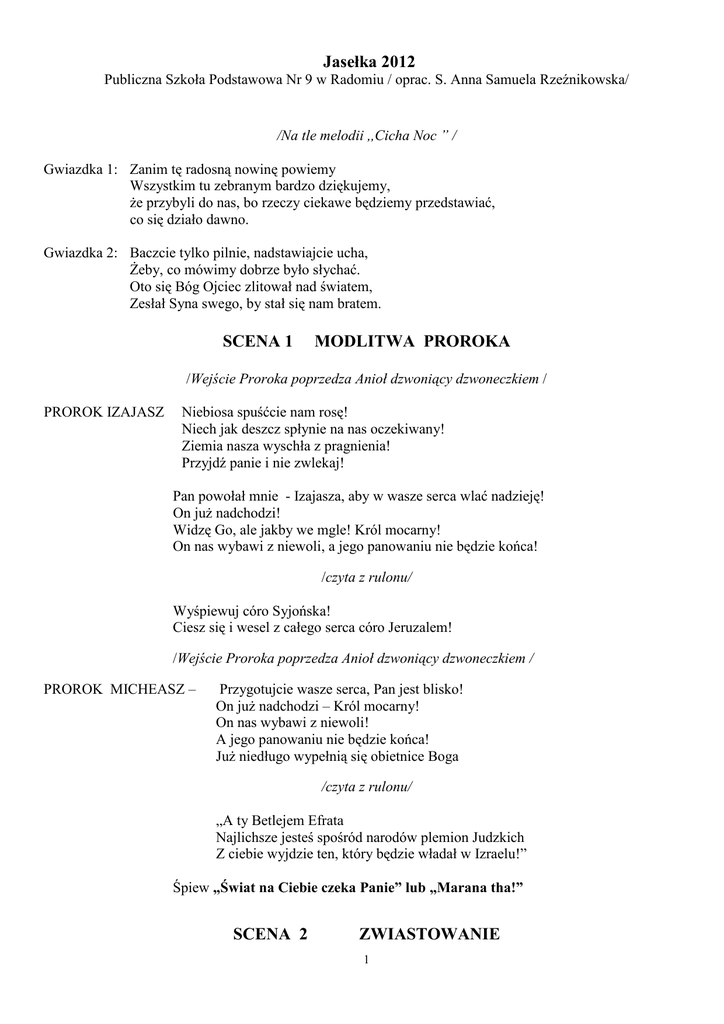 Jasełka 2012 Publiczna Szkoła Podstawowa Nr 9 w Radomiu / oprac. S. Anna Samuela Rzeźnikowska/ /Na tle melodii ,,Cicha Noc ” / Gwiazdka 1: Zanim tę radosną nowinę powiemy Wszystkim tu zebranym bardzo dziękujemy, Ŝe przybyli do nas, bo rzeczy ciekawe będziemy przedstawiać, co się działo dawno. Gwiazdka 2: Baczcie tylko pilnie, nadstawiajcie ucha, śeby, co mówimy dobrze było słychać. Oto się Bóg Ojciec zlitował nad światem, Zesłał Syna swego, by stał się nam bratem. SCENA 1 MODLITWA PROROKA /Wejście Proroka poprzedza Anioł dzwoniący dzwoneczkiem / PROROK IZAJASZ Niebiosa spuśćcie nam rosę! Niech jak deszcz spłynie na nas oczekiwany! Ziemia nasza wyschła z pragnienia! Przyjdź panie i nie zwlekaj! Pan powołał mnie - Izajasza, aby w wasze serca wlać nadzieję! On juŜ nadchodzi! Widzę Go, ale jakby we mgle! Król mocarny! On nas wybawi z niewoli, a jego panowaniu nie będzie końca! /czyta z rulonu/ Wyśpiewuj córo Syjońska! Ciesz się i wesel z całego serca córo Jeruzalem! /Wejście Proroka poprzedza Anioł dzwoniący dzwoneczkiem / PROROK MICHEASZ – Przygotujcie wasze serca, Pan jest blisko! On juŜ nadchodzi – Król mocarny! On nas wybawi z niewoli! A jego panowaniu nie będzie końca! JuŜ niedługo wypełnią się obietnice Boga /czyta z rulonu/ „A ty Betlejem Efrata Najlichsze jesteś spośród narodów plemion Judzkich Z ciebie wyjdzie ten, który będzie władał w Izraelu!” Śpiew „Świat na Ciebie czeka Panie” lub „Marana tha!” SCENA 2 ZWIASTOWANIE 1 /Maryja wychodzi radosna , trzymając w ręku kwiat – modli się / MARYJA- BoŜe, jesteś wielki i święte jest Imię Twoje! Wejrzyj na uniŜenie swojej SłuŜebnicy, która chce Cię wielbić całym swoim Ŝyciem. ANIOŁ GABRIEL - Bądź pozdrowiona pełna łaski Pan z Tobą! Błogosławiona jesteś między niewiastami, Maryjo! Znalazłaś łaskę u Boga! Oto poczniesz i porodzisz Syna, któremu nadasz imię Jezus! Będzie On wielki i będzie nazwany Synem NajwyŜszego! MARYJA – JakŜe się to stanie? ANIOŁ GABRIEL - Duch Święty zstąpi na Ciebie i moc NajwyŜszego osłoni Cię. MARYJA /klęka / Oto Ja SłuŜebnica Pańska, Niech mi się stanie według twego Słowa SCENA 3 OGŁOSZENIE SPISU LUDNOŚCI /Nazaret – Maryja siedzi i haftuje. Józef pracuje w warsztacie/ Gwiazdka 1: Dumny Cezar chce wiedzieć ilu podwładnych ma w swoim państwie. Rozsyła więc gońców na wszystkie jego krańce, by rozkaz cesarski zanieśli. Gwiazdka 2: Oto Ŝołnierz w miasteczku Nazaret ogłasza ludowi, otwierają się drzwi i okna, wychylają się głowy, kaŜdy słucha. Słucha teŜ Maryja i Józef. /Szybkie, zdecydowane dźwięki marsza wchodzi trębacz i przemaszerowuje scenę na widowni tam i z powrotem. Zatrzymuje się w środku i trąbi na 4 strony świata, następnie mówi/ śołnierz: W imieniu cesarza! W całym państwie rzymskim zostanie przeprowadzony spis ludności. Wszyscy mieszkańcy muszą udać się do miejsca swego urodzenia. Tam zostaną wpisani na listy. Kto się uchyli zostanie ukarany. Niech Ŝyje Cesarz August. Podpisano Kwiryniusz, wielkorządca Syrii. /Znów trąbienie – odchodzi/ MARYJA - Józefie, czy słyszałeś? JÓZEF - Tak Mario, to straszne. Musimy udać się do Betlejem, do miasta naszych Ojców. MARYJA - Nie dam rady. JÓZEF- Na pewno dla Ciebie zrobią wyjątek – zapytam /Józef idzie do Ŝołnierza/ Hej Ŝołnierzu, słyszałem rozkaz. Moja Ŝona i ja powinniśmy udać się do Betlejem. Ale to bardzo daleko. 2 śołnierzJÓZEF- No i co? KaŜdy musi pójść do swojego rodzinnego miasta. Ale moja Ŝona spodziewa się dziecka. Nie moŜe teraz iść tak daleko. śOŁNIERZ - KaŜdy moŜe mieć jakąś wymówkę. Rozkaz to rozkaz! Jak się nazywacie? JÓZEF - Ja jestem Józef. Moja Ŝona nazywa się Maryja. śOŁNIERZ - Dlaczego musicie iść właśnie do Betlejem? JÓZEF- Pochodzimy z domu Dawida. śOŁNIERZ - Wy pochodzicie z domu Królewskiego Dawida? Niewiele z tego po was widać? JÓZEF- Wygląd zewnętrzny się nie liczy. Bóg patrzy na serce. śOŁNIERZ - To mnie nie obchodzi. Gotujcie się do drogi. Rozkaz jest rozkazem. /Józef i Maryja odchodzą w takt melodii/ SCENA 4 GWIAZDKA 1- WĘDRÓWKA DO BETLEJEM Idzie więc Najświętsza panienka ze świętym Józefem do Betlejem, bo stamtąd pochodzą. Ida piechotą, a tam przed nimi wspaniałe powozy ludzi bogatych, co patrzą na biednych z pogardą. Często musieli przystawać – wreszcie dotarli do Betlejem. /Maryja z Józefem wchodzą na scenę/ MARYJA – Nie martw się Józefie, Pan jest z nami. Z Nim czuję się bezpieczna i silna. JÓZEF /z westchnieniem/ - Tak! Chciałbym, abyś wreszcie mogła odpocząć. Poszukam jakiegoś noclegu. MARYJA - Och, to nie będzie łatwe. W Betlejem są tłumy przyjezdnych. /Maryja siada. Józef odchodzi, puka do drzwi/ JÓZEF- W imię Pana Zastępów, uchylcie swoich podwoi. W progu waszego domu matka – dziewica stoi! Proszę o dach nad głową GOSPODARZ - Ach człowieku, idźŜe z Bogiem! /Józef wraca do Maryi , siada / JÓZEF - śeby choć tak łyŜkę strawy. śeby choć tak garstkę słomy. /słychać muzykę weselną / 3 MARYJA – Słyszysz? Grają. Jeszcze nie śpią! Spróbuj Józefie jeszcze raz. Powiedz im, ze jesteś cieślą, Ŝe odwdzięczysz się jak trzeba, za ten kąt i kromkę chleba, Ŝe zapłacisz swoją pracą. /Józef idzie , stuka do drzwi / JÓZEF – Hej! Otwórzcie Gospodarze! PANI - kto tam przyszedł? PAN- Jakiś człowiek, jakiś obcy u drzwi stoi! PANI - Gości u nas bardzo wiele, Nie ma miejsca dla podróŜnych, W naszym domu dziś wesele. /Józef wraca smutny do Maryi / MARYJA- / ze smutkiem / Nie wpuścili nas bogacze, /po chwili/ Wszędzie zimno, wszędzie ciemno. Tylko wiatr nad nami płacze, Tylko wiatr i nikt juŜ więcej. /po chwili / śeby chociaŜ ogrzać ręce, Tak niewiele nam potrzeba. JÓZEF- Maryjo, tak mi Cię Ŝal. Zrobiłem wszystko, co w mojej mocy, ale bez złota, bez pieniędzy, nikt nie chce dać noclegu