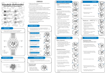 UWAGA a WYŚWIETLANIE CZASU 1.Nigdy nie próbuj zdejmować obudowy lub otwierać tylnej pokrywy zegarka. Instrukcja użytkownika 2.Nie używaj przycisków pod wodą. YP08379 (wielofunkcyjny sportowy zegarek LCD) Stoper Podwójny pomiar czasu Alarm 5.Chroń zegarek przed zbyt wysoką temperaturą. Kalendarz na 100 lat Dzwonek 6.Wycieraj zegarek za pomocą suchej miękkiej szmatki. Chroń zegarek przed kontaktem z substancjami chemicznymi, które mogą spowodować uszkodzenie plastikowych elementów zegarka. Wodoszczelność do 100 m Zasilany baterią (CR2025) 7.Chroń zegarek przed działaniem pola elektromagnetycznego. • W trybie wyświetlania czasu naciśnij i przytrzymaj D, aby wyświetlić dokładną aktualną datę. Funkcje przycisków oznaczonych literami (używanymi w dalszej części instrukcji) są opisane w legendzie 1.W trybie wyświetlania czasu naciśnij i przytrzymaj A, aż sekundy zaczną migać (oznacza to wejście w tryb ustawień); 4.Naciśnij D, aby zwiększyć wyświetlaną liczbę, naciśnij i przytrzymaj D, aby szybko zwiększyć wyświetlaną liczbę; b Alarm • Sygnalizacja pełnych godzin; • Alarm włącza się codziennie o ustawionej godzinie. c stoper • Pomiar z dokładnością do 1/100 sekundy; A – reset B – tryb C – podświetlenie D – start/stop • Zakres pomiaru: 00’00”00 – 23:59”59. d Wyświetlanie dwóch czasów • Dodatkowy czas wyświetlany dla innej strefy czasowej. WYŚWIETLACZ Poniżej pokazane są wyświetlane informacje: Dzień tygodnia Data Godzina Minuty Sekundy PODŚWIETLENIE Podświetlenie wykorzystuje działanie diody elektroluminescencyjnej (LED) i pozwala na odczyt godziny w ciemności. Używanie opcji podświetlenia • Naciśnij C, aby włączyć podświetlenie trwające około 3 sekund niezależnie od aktualnego trybu zegarka. 1.W trybie stopera naciśnij D, aby włączyć pomiar czasu; 2.Naciśnij A, aby wyświetlić międzyczas bez przerywania pomiaru czasu; 5.Powtórz krok 3 i 4, ustawianie godziny następuje w kolejności: sekundy – godziny – minuty – rok – miesiąc – dzień; 3.Naciśnij A, aby usunąć zapisany międzyczas i kontynuować pomiar czasu; 6.Po ustawieniu godziny i daty naciśnij A, aby wyjść z trybu ustawień (dzień tygodnia jest wyświetlany automatycznie zgodnie z ustawioną datą). • Tryb wyświetlania godziny 12/24; • Kalendarz na 100 lat (2009 – 2099). Międzyczas 3.Naciśnij B, aby przejść dalej; Wyświetlanie czasu • Godziny, minuty, sekundy, dzień tygodnia, data; 3.Naciśnij A, aby wyzerować stoper. 2.Naciśnij D, aby wyzerować sekundy; Naciśnij B, aby zmienić tryb w następującej kolejności: Tryb wyświetlania czasu – Tryb alarmu – Tryb stopera – Tryb podwójnego pomiaru czasu. a 2.Naciśnij ponownie D, aby zatrzymać stoper; Ustawianie godziny WYBÓR TRYBU PRZYCISKI 1.W trybie stopera naciśnij D, aby włączyć pomiar czasu; Kalendarz 4.Staraj się obchodzić delikatnie z zegarkiem, nie upuszczaj go i nie poddawaj działaniu nadmiernej siły. STOPER Czas okrążenia • W trybie wyświetlania czasu naciśnij A, aby przełączyć między trybami 12H i 24H. 3.Jeśli we wnętrzu zegarka pojawi się wilgoć, skontaktuj się ze sprzedawcą w celu naprawy. W przeciwnym wypadku wilgoć może uszkodzić metalowe elementy wewnątrz zegarka. Podświetlenie elektroluminescencyjne c Tryb wyświetlania godziny 12/24 4.Powtórz krok 2 i 3 – w ten sposób możliwy jest pomiar wielu międzyczasów; 5.Naciśnij D, aby zatrzymać stoper. b ALARM Alarm i dzwonek • W trybie Alarmu naciśnij D, aby włączyć lub wyłączyć alarm i dzwonek w następującej kolejności: Alarm i dzwonek wyłączony – Alarm włączony – Dzwonek włączony – Alarm i dzwonek włączony. d TRYB PODWÓJNEGO POMIARU CZASU Ustawianie trybu podwójnego pomiaru czasu 1.W trybie podwójnego pomiaru czasu naciśnij A, aż zacznie migać godzina (oznacza to przejście w tryb ustawień); Ustawienia alarmu 1.W trybie alarmu naciśnij i przytrzymaj A, aż zacznie migać godzina, pojawi się symbol alarmu (miganie oznacza przejście w tryb ustawień); 2.Naciśnij D, aby zwiększyć godzinę, naciśnij i przytrzymaj D, aby szybko zwiększyć godzinę; 2.Naciśnij D, aby zwiększyć godzinę, naciśnij i przytrzymaj D, aby szybko zwiększyć godzinę; 3.Naciśnij B, aby wybrać minuty; 3.Naciśnij B, aby wybrać minuty; 4.Naciśnij D, aby zwiększyć minuty, naciśnij i przytrzymaj D, aby szybko zwiększyć minuty; 5.Po ustawieniu alarmu naciśnij A, aby wyjść z trybu ustawień. 4.Naciśnij D, aby zmienić minuty (jedno naciśnięcie zmienia wartość o 30 minut); • Alarm dźwiękowy włącza się o ustawionej godzinie każdego dnia i trwa 60 sekund. Aby wyłączyć alarm, naciśnij dowolny przycisk. 5.Po dokonaniu ustawień naciśnij A, aby wyjść z trybu ustawień.