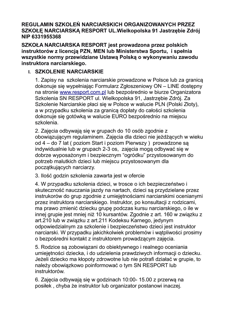 REGULAMIN SZKOLEŃ NARCIARSKICH ORGANIZOWANYCH PRZEZ SZKOŁĘ NARCIARSKĄ RESPORT UL.Wielkopolska 91 Jastrzębie Zdrój NIP 6331955368 SZKOŁA NARCIARSKA RESPORT jest prowadzona przez polskich instruktorów z licencją PZN, MEN lub Ministerstwa Sportu, i spełnia wszystkie normy przewidziane Ustawą Polską o wykonywaniu zawodu instruktora narciarskiego. I. SZKOLENIE NARCIARSKIE 1. Zapisy na szkolenia narciarskie prowadzone w Polsce lub za granicą dokonuje się wypełniając Formularz Zgłoszeniowy ON – LINE dostępny na stronie www.resport.com.pl lub bezpośrednio w biurze Organizatora Szkolenia SN RESPORT ul. Wielkopolska 91, Jastrzębie Zdrój. Za Szkolenie Narciarskie płaci się w Polsce w walucie PLN (Polski Złoty), a w przypadku szkolenia za granicą dopłaty do całości szkolenia dokonuje się gotówką w walucie EURO bezpośrednio na miejscu szkolenia. 2. Zajęcia odbywają się w grupach do 10 osób zgodnie z obowiązującym regulaminem. Zajęcia dla dzieci nie jeżdżących w wieku od 4 – do 7 lat ( poziom Start i poziom Pierwszy ) prowadzone są indywidualnie lub w grupach 2-3 os, zajęcia mogą odbywać się w dobrze wyposażonym i bezpiecznym “ogródku” przystosowanym do potrzeb malutkich dzieci lub miejscu przystosowanym dla początkujących narciarzy. 3. Ilość godzin szkolenia zawarta jest w ofercie 4. W przypadku szkolenia dzieci, w trosce o ich bezpieczeństwo i skuteczność nauczania jazdy na nartach, dzieci są przydzielane przez instrukorów do grup zgodnie z umiejętnościami narciarskimi ocenianymi przez instruktora narciarskiego. Instruktor, po konsultacji z rodzicami, ma prawo zmienić dziecku grupę podczas kursu narciarskiego, o ile w innej grupie jest mniej niż 10 kursantów. Zgodnie z art. 160 w związku z art.210 lub w związku z art.211 Kodeksu Karnego, jedynym odpowiedzialnym za szkolenie i bezpieczeństwo dzieci jest instruktor narciarski. W przypadku jakichkolwiek problemów i wątpliwości prosimy o bezpośredni kontakt z instruktorem prowadzącym zajęcia. 5. Rodzice są zobowiązani do obiektywnego i realnego oceniania umiejętności dziecka, i do udzielenia prawdziwych informacji o dziecku. Jeżeli dziecko ma kłopoty zdrowotne lub nie potrafi działać w grupie, to należy obowiązkowo poinformować o tym SN RESPORT lub instruktorów. 6. Zajęcia odbywają się w godzinach 10:00- 15.00 z przerwą na posiłek , chyba że instruktor lub organizator postanowi inaczej. 7. Rodzice lub opiekunowie są zobowiązani do osobistego przyprowadzenia dziecka na miejsce zbiórki wskazane przez instruktora prowadzącego zjęcia. 8. Wszystkie dzieci muszą posiadać kaski, narty i kijki, odpowiedni kombinezon, rękawiczki, skipassy. 9. Rodzice są zobowiązani do przyprowadzenia i odebrania dziecka z kursu osobiście o umówionej godzinie.W przypadku rezygnacji z zajęć rodzice są zobowiązani do powiadomienie instruktora prowadzącego kurs przed zajęciami. 10. Każde dziecko na kursie narciarskim powinno posiadać przy sobie numer telefonu komórkowego rodziców, rodzice są zobowiązani do pozostawienia instruktorowi narciarskiemu swojego nr telefonu. 11.W razie wypadku lub choroby , podstawą do zwrotu za niewykorzystane godziny szkolenia jest zaświadczenie lekarskie. Aby otrzymać zwrot należy przekazać zaświadczenie osobiście do siedziby SN RESPORT lub pocztą elektroniczną na adres Szkoły [email protected] II. ZASADY OGÓLNE 1) Niniejszy regulamin określa ogólne warunki udziału w szkoleniach narciarskich organizowanych przez SN RESPORT reprezentowanej przez Michała Res z siedzibą w Jastrzębiu Zdroju przy ulicy Wielkopolskiej 91. Regulamin stanowi integralną część umowy o zorganizowanie szkolenia narciarskiego zawieranej pomiędzy SZKOŁĄ NARCIARSKA RESPORT Michał Res a KLIENTEM 2) SN RESPORT, przed rozpoczęciem szkolenia narciarskiego przekaże na swojej stronie internetowej www.resport.com.pl • dane kontaktowe pilota lub opiekuna wyjazdu szkoleniowego takie jak nazwisko i nr telefonu • datę, miejsce i godzinę odjazdu autokaru • informacje dotyczące połączeń komunikacyjnych. III. ZAWARCIE UMOWY 1. Zawarcie Umowy następuje poprzez uiszczenie opłaty rezerwacyjnej i jest równoznaczne z akceptacją niniejszego Regulaminu oraz świadczeń zawartych w ofercie. Przed uiszczeniem opłaty rezerwacyjnej Klient zobowiązany jest zapoznać się z programem imprezy, regulaminem, informacjami o warunkach ubezpieczenia, ogólnymi informacjami o przepisach paszportowych. 2) Zgłoszenie zbiorowe dokonuje osoba należycie do tego upoważniona. Osoba dokonująca rezerwacji w imieniu i na rzecz osób trzecich powinna okazać pełnomocnictwo podpisane przez te osoby albo złożyć pisemne oświadczenie. Zgłoszenie zbiorowe może nastąpić po zapoznaniu się reprezentowanych osób z informacjami, o których mowa w pkt. 1 powyżej, a osoba reprezentująca grupę składa w tym zakresie właściwe oświadczenia obejmujące także ich zgodę na przetwarzanie danych osobowych uczestników grupowego szkolenia narciarskiego. IV. ODPOWIEDZIALNOŚĆ SN RESPORT 1) SN RESPORT nie ponosi odpowiedzialności za niewykonanie lub nienależyte wykonanie świadczeń przez przewoźników lotniczych, drogowych, kolejowych i morskich, chyba że Strony uzgodnią w Umowie inaczej. 2) W przypadku wcześniejszego powrotu Klienta na jego życzenie, powrót ten odbywa się na koszt i odpowiedzialność Klienta. 3) SN RESPORT nie odpowiada za niedogodności zaistniałe w czasie trwania szkolenia wynikłe z przyczyn od niego niezależnych np. decyzje Państwowe, działanie siły wyższej, warunków atmosferycznych, trudności przy przekraczaniu granic, opóźnień niezależnych środków transportu, lub przyczyn leżących po stronie klienta (spóźnienia, niestawienia się na miejsca zbiórek itp. ) 4) SN RESPORT nie ponosi odpowiedzialności za straty poniesione przez klienta w związku ze zmianą podanej godziny i miejsca odjazdu autokaru, jeśli klien