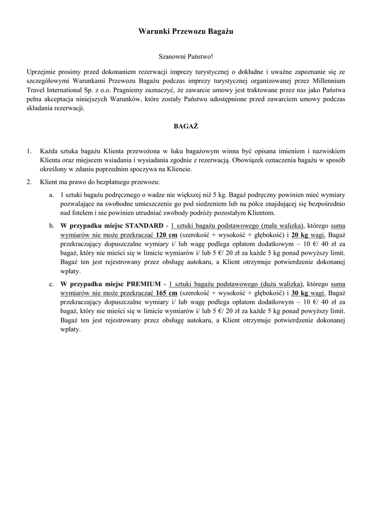 Warunki Przewozu Bagażu Szanowni Państwo! Uprzejmie prosimy przed dokonaniem rezerwacji imprezy turystycznej o dokładne i uważne zapoznanie się ze szczegółowymi Warunkami Przewozu Bagażu podczas imprezy turystycznej organizowanej przez Millennium Travel International Sp. z o.o. Pragniemy zaznaczyć, że zawarcie umowy jest traktowane przez nas jako Państwa pełna akceptacja niniejszych Warunków, które zostały Państwu udostępnione przed zawarciem umowy podczas składania rezerwacji. BAGAŻ 1. Każda sztuka bagażu Klienta przewożona w luku bagażowym winna być opisana imieniem i nazwiskiem Klienta oraz miejscem wsiadania i wysiadania zgodnie z rezerwacją. Obowiązek oznaczenia bagażu w sposób określony w zdaniu poprzednim spoczywa na Kliencie. 2. Klient ma prawo do bezpłatnego przewozu: a. 1 sztuki bagażu podręcznego o wadze nie większej niż 5 kg. Bagaż podręczny powinien mieć wymiary pozwalające na swobodne umieszczenie go pod siedzeniem lub na półce znajdującej się bezpośrednio nad fotelem i nie powinien utrudniać swobody podróży pozostałym Klientom. b. W przypadku miejsc STANDARD - 1 sztuki bagażu podstawowego (mała walizka), którego suma wymiarów nie może przekraczać 120 cm (szerokość + wysokość + głębokość) i 20 kg wagi. Bagaż przekraczający dopuszczalne wymiary i/ lub wagę podlega opłatom dodatkowym – 10 €/ 40 zł za bagaż, który nie mieści się w limicie wymiarów i/ lub 5 €/ 20 zł za każde 5 kg ponad powyższy limit. Bagaż ten jest rejestrowany przez obsługę autokaru, a Klient otrzymuje potwierdzenie dokonanej wpłaty. c. W przypadku miejsc PREMIUM - 1 sztuki bagażu podstawowego (duża walizka), którego suma wymiarów nie może przekraczać 165 cm (szerokość + wysokość + głębokość) i 30 kg wagi. Bagaż przekraczający dopuszczalne wymiary i/ lub wagę podlega opłatom dodatkowym – 10 €/ 40 zł za bagaż, który nie mieści się w limicie wymiarów i/ lub 5 €/ 20 zł za każde 5 kg ponad powyższy limit. Bagaż ten jest rejestrowany przez obsługę autokaru, a Klient otrzymuje potwierdzenie dokonanej wpłaty.