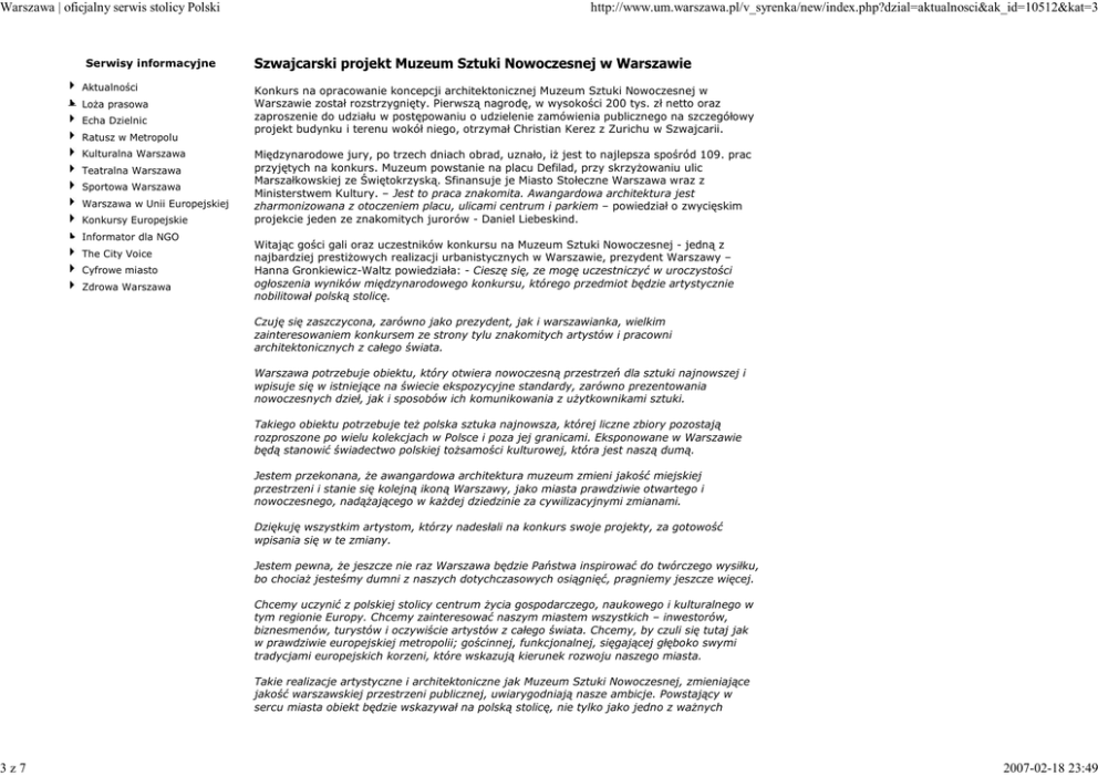 Warszawa | oficjalny serwis stolicy Polski 3z7 Serwisy informacyjne Aktualności Loża prasowa Echa Dzielnic Ratusz w Metropolu Kulturalna Warszawa Teatralna Warszawa Sportowa Warszawa Warszawa w Unii Europejskiej Konkursy Europejskie Informator dla NGO The City Voice Cyfrowe miasto Zdrowa Warszawa http://www.um.warszawa.pl/v_syrenka/new/index.php?dzial=aktualnosci&ak_id=10512&kat=3 Szwajcarski projekt Muzeum Sztuki Nowoczesnej w Warszawie Konkurs na opracowanie koncepcji architektonicznej Muzeum Sztuki Nowoczesnej w Warszawie został rozstrzygnięty. Pierwszą nagrodę, w wysokości 200 tys. zł netto oraz zaproszenie do udziału w postępowaniu o udzielenie zamówienia publicznego na szczegółowy projekt budynku i terenu wokół niego, otrzymał Christian Kerez z Zurichu w Szwajcarii. Międzynarodowe jury, po trzech dniach obrad, uznało, iż jest to najlepsza spośród 109. prac przyjętych na konkurs. Muzeum powstanie na placu Defilad, przy skrzyżowaniu ulic Marszałkowskiej ze Świętokrzyską. Sfinansuje je Miasto Stołeczne Warszawa wraz z Ministerstwem Kultury. – Jest to praca znakomita. Awangardowa architektura jest zharmonizowana z otoczeniem placu, ulicami centrum i parkiem – powiedział o zwycięskim projekcie jeden ze znakomitych jurorów - Daniel Liebeskind. Witając gości gali oraz uczestników konkursu na Muzeum Sztuki Nowoczesnej - jedną z najbardziej prestiżowych realizacji urbanistycznych w Warszawie, prezydent Warszawy – Hanna Gronkiewicz-Waltz powiedziała: - Cieszę się, ze mogę uczestniczyć w uroczystości ogłoszenia wyników międzynarodowego konkursu, którego przedmiot będzie artystycznie nobilitował polską stolicę. Czuję się zaszczycona, zarówno jako prezydent, jak i warszawianka, wielkim zainteresowaniem konkursem ze strony tylu znakomitych artystów i pracowni architektonicznych z całego świata. Warszawa potrzebuje obiektu, który otwiera nowoczesną przestrzeń dla sztuki najnowszej i wpisuje się w istniejące na świecie ekspozycyjne standardy, zarówno prezentowania nowoczesnych dzieł, jak i sposobów ich komunikowania z użytkownikami sztuki. Takiego obiektu potrzebuje też polska sztuka najnowsza, której liczne zbiory pozostają rozproszone po wielu kolekcjach w Polsce i poza jej granicami. Eksponowane w Warszawie będą stanowić świadectwo polskiej tożsamości kulturowej, która jest naszą dumą. Jestem przekonana, że awangardowa architektura muzeum zmieni jakość miejskiej przestrzeni i stanie się kolejną ikoną Warszawy, jako miasta prawdziwie otwartego i nowoczesnego, nadążającego w każdej dziedzinie za cywilizacyjnymi zmianami. Dziękuję wszystkim artystom, którzy nadesłali na konkurs swoje projekty, za gotowość wpisania się w te zmiany. Jestem pewna, że jeszcze nie raz Warszawa będzie Państwa inspirować do twórczego wysiłku, bo chociaż jesteśmy dumni z naszych dotychczasowych osiągnięć, pragniemy jeszcze więcej. Chcemy uczynić z polskiej stolicy centrum życia gospodarczego, naukowego i kulturalnego w tym regionie Europy. Chcemy zainteresować naszym miastem wszystkich – inwestorów, biznesmenów, turystów i oczywiście artystów z całego świata. Chcemy, by czuli się tutaj jak w prawdziwie europejskiej metropolii; gościnnej, funkcjonalnej, sięgającej głęboko swymi tradycjami europejskich korzeni, które wskazują kierunek rozwoju naszego miasta. Takie realizacje artystyczne i architektoniczne jak Muzeum Sztuki Nowoczesnej, zmieniające jakość warszawskiej przestrzeni publicznej, uwiarygodniają nasze ambicje. Powstający w sercu miasta obiekt będzie wskazywał na polską stolicę, nie tylko jako jedno z ważnych 2007-02-18 23:49 Warszawa | oficjalny serwis stolicy Polski 4z7 http://www.um.warszawa.pl/v_syrenka/new/index.php?dzial=aktualnosci&ak_id=10512&kat=3 miejsc międzynarodowego dyskursu artystycznego, ale również jako miasto mające silny wkład w europejski proces integracyjny”. A oto lista autorów dwunastu prac, które otrzymały nagrody oraz wyróżnienia: 1. Christian Kerez z Zurichu w Szwajcarii (92 punkty), 200 tys. zł netto. 2. Szaroszyk & Rycerski Architekci Sp z o.o., Warszawa (85 punktów), 150 tys. zł netto. 3. Atelier WW Architektem SIA, Zurich, Szwajcaria (79 punktów), 100 tys. zł netto. Wyróżnienie specjalne: Arkitehtioimisto ALA Oy – Helsinki, Finlandia oraz GRUPA 5 Warszawa, (58 punktów), 80 tys. zł. Wróżnienie honorowe, bez gratyfikacji finasowej, jury przyznało firmie Planning & Consulting Anna Socha – Kraków oraz Pro.Tec.O.Soc.Coop. a.r.l. Renato Rizzi – Wenecja, Włochy. Dziesięc równorzędnych wyróżnień, po 65 tys. zł netto, przyznano następującym pracowniom: 1. Steffen Lemmerzahl – Zurich, Szwajcaria (45 punktów), 2. K. Ingarden, J. Ewy – Architekci – Kraków oraz Kengo Kuma And Associates – Tokio, Japonia (47 punktów), 3. Jun Aoki (jun Aoki & Associates) – Tokio, Japonia, Marcel Peter, Zatoko Hirata, Artur Jasiński i Wspólnicy - Kraków (50 punktów), 4. Doemges Architektem Ag – Regensburg, Niemcy (48 punktów), 5. Arkitehtioimisto ALA Oy – Helsinki, Finlandia oraz GRUPA 5 - Warszawa, (46 punktów) 6. Augustyn Sebastian Rivera oraz Jorge Questada Ordeig – Walencja, Hiszpania, (49 punktów), 7. Alain Vargas (Tectoniques) – Lyon, Francja, (53 punkty), 8. Stefan Westrych, Krzysztof Dyga – Warszawa oraz Manfredi Nicoletti, Luca Nicoletti, Fabrizio Pagliano Tajani, Laura Bertoni – Rzym, Włochy (51 punktów), 9. Camillo Rebelo Arquitecto Unipersonal Lta. – Porto, Portugalia (49 punktów), 10. Adam Tyliszczak, Bartłomiej Martens – Warszawa. Wszystkie będzie można obejrzeć na wystawie w pawilonie SARP, przy ulicy Foksal 2 oraz na stronie:http://www.museumcompetition.pl Wystawa pokonkursowa potrwa do 15 marca 2007 r. Nad wyborem najlepszego z nadesłanych projektów obradowało trzynastoosobowe jury, w składzie: Paweł Althamer, Christine Binswanger, Michał Borowski, Jacek Lenart, Daniel Lib