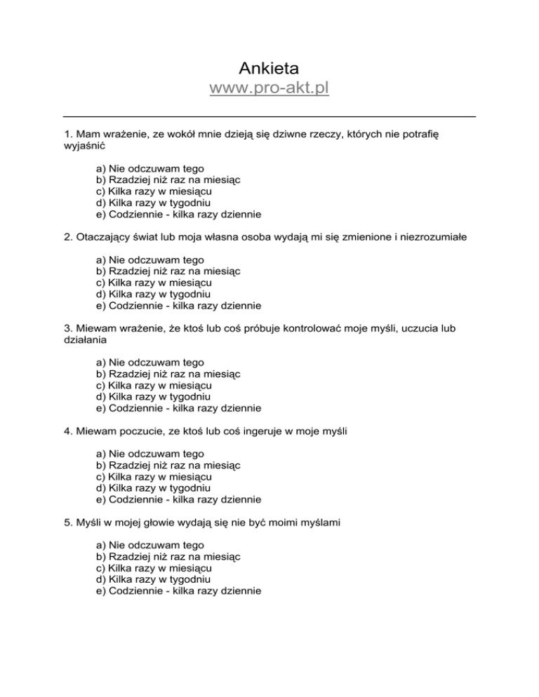 Ankieta www.pro-akt.pl 1. Mam wrażenie, ze wokół mnie dzieją się dziwne rzeczy, których nie potrafię wyjaśnić a) Nie odczuwam tego b) Rzadziej niż raz na miesiąc c) Kilka razy w miesiącu d) Kilka razy w tygodniu e) Codziennie - kilka razy dziennie 2. Otaczający świat lub moja własna osoba wydają mi się zmienione i niezrozumiałe a) Nie odczuwam tego b) Rzadziej niż raz na miesiąc c) Kilka razy w miesiącu d) Kilka razy w tygodniu e) Codziennie - kilka razy dziennie 3. Miewam wrażenie, że ktoś lub coś próbuje kontrolować moje myśli, uczucia lub działania a) Nie odczuwam tego b) Rzadziej niż raz na miesiąc c) Kilka razy w miesiącu d) Kilka razy w tygodniu e) Codziennie - kilka razy dziennie 4. Miewam poczucie, ze ktoś lub coś ingeruje w moje myśli a) Nie odczuwam tego b) Rzadziej niż raz na miesiąc c) Kilka razy w miesiącu d) Kilka razy w tygodniu e) Codziennie - kilka razy dziennie 5. Myśli w mojej głowie wydają się nie być moimi myślami a) Nie odczuwam tego b) Rzadziej niż raz na miesiąc c) Kilka razy w miesiącu d) Kilka razy w tygodniu e) Codziennie - kilka razy dziennie 6. Podejrzewam, że inni znają moje myśli a) Nie odczuwam tego b) Rzadziej niż raz na miesiąc c) Kilka razy w miesiącu d) Kilka razy w tygodniu e) Codziennie - kilka razy dziennie 7. Miewam wrażenie, ze ludzie (nawet obcy) bacznie mi się przyglądają, rozmawiają o mnie lub śmieją się ze mnie a) Nie odczuwam tego b) Rzadziej niż raz na miesiąc c) Kilka razy w miesiącu d) Kilka razy w tygodniu e) Codziennie - kilka razy dziennie 8. Miewam wrażenie jakby programy w telewizji lub radio bądź artykuły w prasie były skierowane specjalnie do mnie a) Nie odczuwam tego b) Rzadziej niż raz na miesiąc c) Kilka razy w miesiącu d) Kilka razy w tygodniu e) Codziennie - kilka razy dziennie 9. Wydaje mi się, ze obcy ludzie bądź osoby z radia lub telewizji próbują coś mi przekazać a) Nie odczuwam tego b) Rzadziej niż raz na miesiąc c) Kilka razy w miesiącu d) Kilka razy w tygodniu e) Codziennie - kilka razy dziennie 10. Do moich uszu dochodzą dźwięki, których nie potrafię zlokalizować (kroki, szumy, trzaski, dźwięk telefonu) a) Nie odczuwam tego b) Rzadziej niż raz na miesiąc c) Kilka razy w miesiącu d) Kilka razy w tygodniu e) Codziennie - kilka razy dziennie 11. Zdarza się, że choć nikogo nie ma w pobliżu, słyszę, jak ktoś do mnie mówi a) Nie odczuwam tego b) Rzadziej niż raz na miesiąc c) Kilka razy w miesiącu d) Kilka razy w tygodniu e) Codziennie - kilka razy dziennie 12. Zdarza się, ze pokazuje mi się przed oczami coś, czego inni nie widzą a) Nie odczuwam tego b) Rzadziej niż raz na miesiąc c) Kilka razy w miesiącu d) Kilka razy w tygodniu e) Codziennie - kilka razy dziennie 13. Odczuwam chaos w moich myślach i mam trudności w znalezieniu odpowiednich słów dla powiedzenia tego, co myślę a) Nie odczuwam tego b) Rzadziej niż raz na miesiąc c) Kilka razy w miesiącu d) Kilka razy w tygodniu e) Codziennie - kilka razy dziennie 14. Podejrzewam, że są ludzie wrogo do mnie nastawieni a) Nie odczuwam tego b) Rzadziej niż raz na miesiąc c) Kilka razy w miesiącu d) Kilka razy w tygodniu e) Codziennie - kilka razy dziennie Jeśli dokonujesz oceny po raz kolejny, udziel odpowiedzi również na poniższe pytania! 15. Zdecydowanie intensywniej odczuwam zapachy lub słyszę dźwięki a) Nie b) Tak 16. Straciłem apetyt a) Nie b) Tak 17. Nie przyjmuję leków zgodnie z zaleceniami lekarza a) Nie b) Tak 18. Jestem się ciągle smutny i przygnębiony, nic mnie nie cieszy a) Nie b) Tak 19. Mam uczucie chaosu wewnętrznego i obawę, że zaraz zwariuję a) Nie b) Tak 20. Przestałem spotykać się ze znajomymi a) Nie b) Tak 21. Zdecydowanie częściej się denerwuję i jestem rozdrażniony a) Nie b) Tak 22. Przestałem spotykać się ze znajomymi lub wychodzić z domu a) Nie b) Tak 23. Mam kłopoty z zaśnięciem lub budzę się w nocy wielokrotnie i nie mogę już zasnąć a) Nie b) Tak 24. Odczuwam niepokój wewnętrzny lub uczucie napięcia a) Nie b) Tak Odpowiedzi należy przesłać SMSem na numer 66 100 45 01 Przykładowy SMS z odpowiedziami powinien wyglądać jak poniżej: 1a2b3c4d5e6a7b8c9d10e11a12b13c14d15a16b17a18b19a20b21a22b23a24b