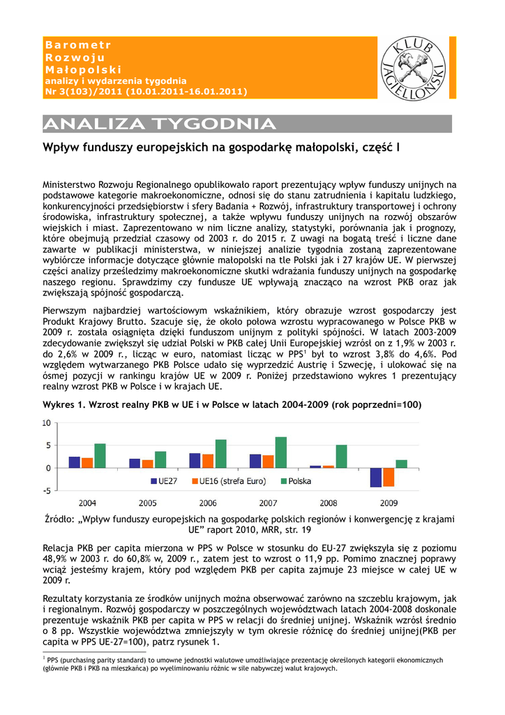 Barometr Rozwoju Małopolski analizy i wydarzenia tygodnia Nr 3(103)/2011 (10.01.2011-16.01.2011) ANALIZA TYGODNIA IS Wpływ funduszy europejskich na gospodarkę małopolski, część I Ministerstwo Rozwoju Regionalnego opublikowało raport prezentujący wpływ funduszy unijnych na podstawowe kategorie makroekonomiczne, odnosi się do stanu zatrudnienia i kapitału ludzkiego, konkurencyjności przedsiębiorstw i sfery Badania + Rozwój, infrastruktury transportowej i ochrony środowiska, infrastruktury społecznej, a także wpływu funduszy unijnych na rozwój obszarów wiejskich i miast. Zaprezentowano w nim liczne analizy, statystyki, porównania jak i prognozy, które obejmują przedział czasowy od 2003 r. do 2015 r. Z uwagi na bogatą treść i liczne dane zawarte w publikacji ministerstwa, w niniejszej analizie tygodnia zostaną zaprezentowane wybiórcze informacje dotyczące głównie małopolski na tle Polski jak i 27 krajów UE. W pierwszej części analizy prześledzimy makroekonomiczne skutki wdrażania funduszy unijnych na gospodarkę naszego regionu. Sprawdzimy czy fundusze UE wpływają znacząco na wzrost PKB oraz jak zwiększają spójność gospodarczą. Pierwszym najbardziej wartościowym wskaźnikiem, który obrazuje wzrost gospodarczy jest Produkt Krajowy Brutto. Szacuje się, że około połowa wzrostu wypracowanego w Polsce PKB w 2009 r. została osiągnięta dzięki funduszom unijnym z polityki spójności. W latach 2003-2009 zdecydowanie zwiększył się udział Polski w PKB całej Unii Europejskiej wzrósł on z 1,9% w 2003 r. do 2,6% w 2009 r., licząc w euro, natomiast licząc w PPS 1 był to wzrost 3,8% do 4,6%. Pod względem wytwarzanego PKB Polsce udało się wyprzedzić Austrię i Szwecję, i ulokować się na ósmej pozycji w rankingu krajów UE w 2009 r. Poniżej przedstawiono wykres 1 prezentujący realny wzrost PKB w Polsce i w krajach UE. Wykres 1. Wzrost realny PKB w UE i w Polsce w latach 2004-2009 (rok poprzedni=100) Źródło: „Wpływ funduszy europejskich na gospodarkę polskich regionów i konwergencję z krajami UE” raport 2010, MRR, str. 19 Relacja PKB per capita mierzona w PPS w Polsce w stosunku do EU-27 zwiększyła się z poziomu 48,9% w 2003 r. do 60,8% w, 2009 r., zatem jest to wzrost o 11,9 pp. Pomimo znacznej poprawy wciąż jesteśmy krajem, który pod względem PKB per capita zajmuje 23 miejsce w całej UE w 2009 r. Rezultaty korzystania ze środków unijnych można obserwować zarówno na szczeblu krajowym, jak i regionalnym. Rozwój gospodarczy w poszczególnych województwach latach 2004-2008 doskonale prezentuje wskaźnik PKB per capita w PPS w relacji do średniej unijnej. Wskaźnik wzrósł średnio o 8 pp. Wszystkie województwa zmniejszyły w tym okresie różnicę do średniej unijnej(PKB per capita w PPS UE-27=100), patrz rysunek 1. 1 PPS (purchasing parity standard) to umowne jednostki walutowe umożliwiające prezentację określonych kategorii ekonomicznych (głównie PKB i PKB na mieszkańca) po wyeliminowaniu różnic w sile nabywczej walut krajowych. Barometr Rozwoju Małopolski analizy i wydarzenia tygodnia Nr 3(103)/2011 (10.01.2011-16.01.2011) Rysunek 1. PKB per capita w PPS UE-27=100, w przekroju województw Źródło: „Wpływ funduszy europejskich na gospodarkę polskich regionów i konwergencję z krajami UE” raport 2010, MRR, str. 39 Liderami były woj. mazowieckie (wzrost o 13,9 pp. do 90% średniej UE), dolnośląskie (wzrost o11,3 pp. do 61% średniej UE). Woj. małopolskie znalazło się w nieco poniżej średniej na 7 miejscu z wzrostem o 7,2 pp. do 49% średniej unijnej. Niewielką zmianę zaobserwowano w woj. warmińsko-mazurskim wzrost tylko 3,7 pp. do 42% średniej UE. W 2009 r. PKB per capita jedynie w woj. mazowieckim (w scenariuszu uwzględniającym fundusze unijne) znajdował się na poziomie zbliżonym do wartości średniej dla 27-EU. Głównymi beneficjentami środków z UE do tej pory były bogatsze województwa. Pozostałe województwa, w szczególności te ze wschodniej części kraju, znajdowały się na ponad dwukrotnie niższym poziomie rozwoju. W rezultacie zwiększył się dystans pomiędzy regionami bogatszymi, a biedniejszymi. W dłuższym okresie według prognoz interwencja finansowana ze źródeł wspólnotowych przełoży się najsilniej na rozwój Polski Wschodniej, dla której, w ujęciu per capita, przeznaczono w horyzoncie do 2015 r. najwięcej środków. W efekcie takiej dystrybucji dostępnych funduszy, PKB per capita w tej grupie województw osiągnie w 2015 r. poziom o ponad 4 pp. wyższy niż w scenariuszu bez funduszy polityki spójności (rysunek 2). Barometr Rozwoju Małopolski analizy i wydarzenia tygodnia Nr 3(103)/2011 (10.01.2011-16.01.2011) Rysunek 2. Wpływ funduszy na PKB per capita w PPS UE=100 (pp.) Źródło: „Wpływ funduszy europejskich na gospodarkę polskich regionów i konwergencję z krajami UE” raport 2010, MRR, str. 45 Polska w latach 2004-2015 według szacunków będzie mogła uzyskać z funduszy unijnych łącznie 80,1 mld euro. Finansowane środkami z UE nakłady infrastrukturalne oraz bezpośrednie wsparcie przedsiębiorstw znacząco przyczyniają się do ożywienia aktywności inwestycyjnej w Polsce prowadząc do podniesienia tempa wzrostu nakładów brutto na środki trwałe oraz zwiększenia stopy inwestycji. Wsparcie ze źródeł wspólnotowych przełoży się corocznie na dodatkowe 4-5 pp. wzrostu tempa nakładów brutto na środki trwałe w latach 2010-2014 oraz zwiększenie poziomu inwestycji w 2014 r. o ponad 30% w porównaniu ze scenariuszem bez funduszy, a więc stopę inwestycji większą o ponad 4 pp. W ramach Narodowego Planu Rozwoju w latach 2004-2006 udzielano poszczególnym regionom finansowe wsparcie. Licząc w kwotach per capita dane są niekorzystne dla najbiedniejszych województw. W pięciu najbogatszych województwach Polski otrzymano średnio 1563 zł per capita, natomiast województwa Polski Wschodniej średnio 105