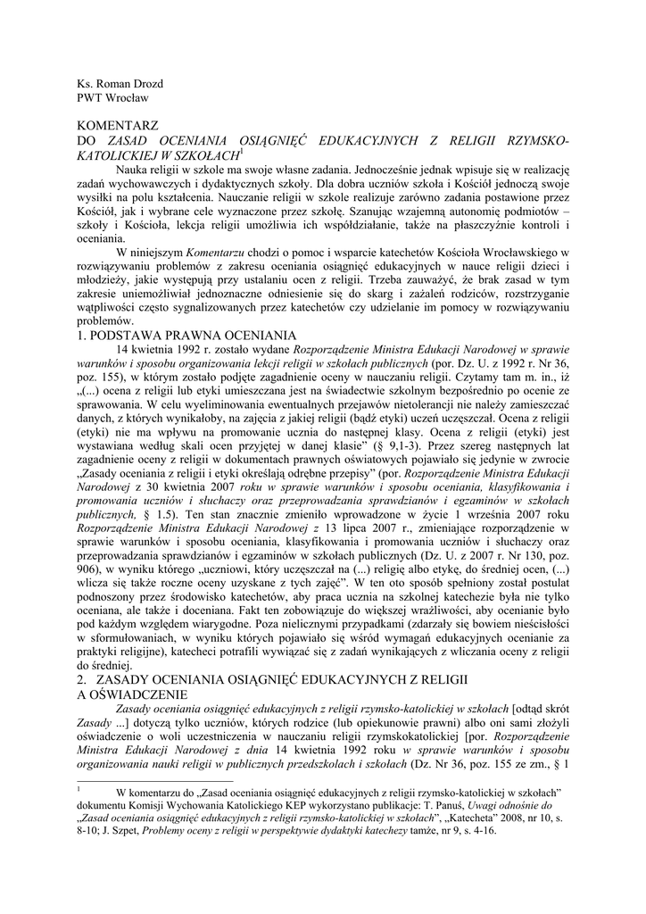 Ks. Roman Drozd PWT Wrocław KOMENTARZ DO ZASAD OCENIANIA OSIĄGNIĘĆ EDUKACYJNYCH Z RELIGII RZYMSKOKATOLICKIEJ W SZKOŁACH1 Nauka religii w szkole ma swoje własne zadania. Jednocześnie jednak wpisuje się w realizację zadań wychowawczych i dydaktycznych szkoły. Dla dobra uczniów szkoła i Kościół jednoczą swoje wysiłki na polu kształcenia. Nauczanie religii w szkole realizuje zarówno zadania postawione przez Kościół, jak i wybrane cele wyznaczone przez szkołę. Szanując wzajemną autonomię podmiotów – szkoły i Kościoła, lekcja religii umożliwia ich współdziałanie, także na płaszczyźnie kontroli i oceniania. W niniejszym Komentarzu chodzi o pomoc i wsparcie katechetów Kościoła Wrocławskiego w rozwiązywaniu problemów z zakresu oceniania osiągnięć edukacyjnych w nauce religii dzieci i młodzieży, jakie występują przy ustalaniu ocen z religii. Trzeba zauważyć, że brak zasad w tym zakresie uniemożliwiał jednoznaczne odniesienie się do skarg i zażaleń rodziców, rozstrzyganie wątpliwości często sygnalizowanych przez katechetów czy udzielanie im pomocy w rozwiązywaniu problemów. 1. PODSTAWA PRAWNA OCENIANIA 14 kwietnia 1992 r. zostało wydane Rozporządzenie Ministra Edukacji Narodowej w sprawie warunków i sposobu organizowania lekcji religii w szkołach publicznych (por. Dz. U. z 1992 r. Nr 36, poz. 155), w którym zostało podjęte zagadnienie oceny w nauczaniu religii. Czytamy tam m. in., iż „(...) ocena z religii lub etyki umieszczana jest na świadectwie szkolnym bezpośrednio po ocenie ze sprawowania. W celu wyeliminowania ewentualnych przejawów nietolerancji nie należy zamieszczać danych, z których wynikałoby, na zajęcia z jakiej religii (bądź etyki) uczeń uczęszczał. Ocena z religii (etyki) nie ma wpływu na promowanie ucznia do następnej klasy. Ocena z religii (etyki) jest wystawiana według skali ocen przyjętej w danej klasie” (§ 9,1-3). Przez szereg następnych lat zagadnienie oceny z religii w dokumentach prawnych oświatowych pojawiało się jedynie w zwrocie „Zasady oceniania z religii i etyki określają odrębne przepisy” (por. Rozporządzenie Ministra Edukacji Narodowej z 30 kwietnia 2007 roku w sprawie warunków i sposobu oceniania, klasyfikowania i promowania uczniów i słuchaczy oraz przeprowadzania sprawdzianów i egzaminów w szkołach publicznych, § 1.5). Ten stan znacznie zmieniło wprowadzone w życie 1 września 2007 roku Rozporządzenie Ministra Edukacji Narodowej z 13 lipca 2007 r., zmieniające rozporządzenie w sprawie warunków i sposobu oceniania, klasyfikowania i promowania uczniów i słuchaczy oraz przeprowadzania sprawdzianów i egzaminów w szkołach publicznych (Dz. U. z 2007 r. Nr 130, poz. 906), w wyniku którego „uczniowi, który uczęszczał na (...) religię albo etykę, do średniej ocen, (...) wlicza się także roczne oceny uzyskane z tych zajęć”. W ten oto sposób spełniony został postulat podnoszony przez środowisko katechetów, aby praca ucznia na szkolnej katechezie była nie tylko oceniana, ale także i doceniana. Fakt ten zobowiązuje do większej wrażliwości, aby ocenianie było pod każdym względem wiarygodne. Poza nielicznymi przypadkami (zdarzały się bowiem nieścisłości w sformułowaniach, w wyniku których pojawiało się wśród wymagań edukacyjnych ocenianie za praktyki religijne), katecheci potrafili wywiązać się z zadań wynikających z wliczania oceny z religii do średniej. 2. ZASADY OCENIANIA OSIĄGNIĘĆ EDUKACYJNYCH Z RELIGII A OŚWIADCZENIE Zasady oceniania osiągnięć edukacyjnych z religii rzymsko-katolickiej w szkołach [odtąd skrót Zasady ...] dotyczą tylko uczniów, których rodzice (lub opiekunowie prawni) albo oni sami złożyli oświadczenie o woli uczestniczenia w nauczaniu religii rzymskokatolickiej [por. Rozporządzenie Ministra Edukacji Narodowej z dnia 14 kwietnia 1992 roku w sprawie warunków i sposobu organizowania nauki religii w publicznych przedszkolach i szkołach (Dz. Nr 36, poz. 155 ze zm., § 1 1 W komentarzu do „Zasad oceniania osiągnięć edukacyjnych z religii rzymsko-katolickiej w szkołach” dokumentu Komisji Wychowania Katolickiego KEP wykorzystano publikacje: T. Panuś, Uwagi odnośnie do „Zasad oceniania osiągnięć edukacyjnych z religii rzymsko-katolickiej w szkołach”, „Katecheta” 2008, nr 10, s. 8-10; J. Szpet, Problemy oceny z religii w perspektywie dydaktyki katechezy tamże, nr 9, s. 4-16. ust. 2)]. Mimo że w Rozporządzeniu jest nowa o „najprostszej formie oświadczenia” (a więc także ustnej), wydaje się, że ze względów dokumentacyjnych, oświadczenie to należy złożyć w formie pisemnej. Dyrektor szkoły musi wiedzieć, którzy uczniowie − zgodnie z życzeniem rodziców − będą z całą pewnością w zajęciach z religii uczestniczyć, tak, aby mógł wywiązać się z ciążącego na nim obowiązku zapewnienia opieki uczniom, którzy w tych zajęciach nie uczestniczą. Zmiana powyższego oświadczenia może dokonać się poprzez odebranie złożonego oświadczenia lub poprzez jego pisemne unieważnienie (por. Zasady..., § 7.1). Trzeba też pamiętać o tym, iż owo oświadczenie jest jedynym warunkiem postawionym przez Rozporządzenie z dnia 14 kwietnia 1992 roku osobom, które chcą uczęszczać na naukę w szkole. Wszystkie inne sytuacje, takie jak niesklasyfikowanie z powodu nieobecności, negatywna ocena czy nieuczęszczanie na religię w niższej programowo klasie, nie są prawną przeszkodą dla osoby, której rodzice (opiekunowie prawni) chcą tego lub która sama tego chce. Rezygnacja z uczestnictwa w nauce religii może być złożona przez rodziców [prawnych opiekunów] lub – w przypadku ucznia pełnoletniego − niego samego, w każdym czasie.. W rozumieniu Zasad skutek tej rezygnacji jest natychmiastowy, nie zaś z końcem danego roku szkolnego. W przypadku zwolnienia ucznia z zajęć z religii na podstawie zmiany oświadczenia ucznio