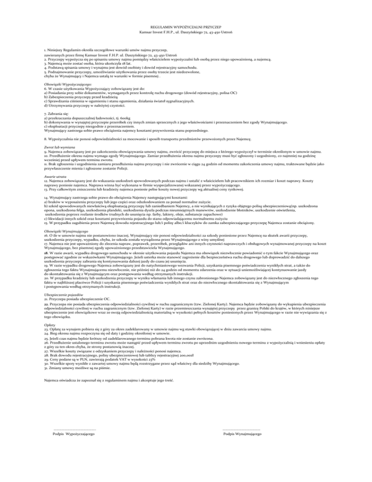 REGULAMIN WYPOŻYCZALNI PRZYCZEP Kamsar Invest F.H.P., ul. Daszyńskiego 72, 43-450 Ustroń 1. Niniejszy Regulamin określa szczegółowe warunki umów najmu przyczep, zawieranych przez firmę Kamsar Invest F.H.P. ul. Daszyńskiego 72, 43-450 Ustroń 2. Przyczepy wypożycza się po spisaniu umowy najmu pomiędzy właścicielem wypożyczalni lub osobą przez niego upoważnioną, a najemcą. 3. Najemcą może zostać osoba, która ukończyła 18 lat. 4. Podstawą spisania umowy i wynajmu jest dowód osobisty i dowód rejestracyjny samochodu. 5. Podnajmowanie przyczepy, umożliwianie użytkowania przez osoby trzecie jest niedozwolone, chyba że Wynajmujący i Najemca ustalą te warunki w formie pisemnej . Obowiązki Wypożyczającego: 6. W czasie użytkowania Wypożyczający zobowiązany jest do: a) Posiadania przy sobie dokumentów, wymaganych przez kontrolę ruchu drogowego (dowód rejestracyjny, polisa OC) b) Zabezpieczenia przyczepy przed kradzieżą c) Sprawdzania ciśnienia w ogumieniu i stanu ogumienia, działania świateł sygnalizacyjnych. d) Utrzymywania przyczepy w należytej czystości. 7. Zabrania się: a) przekraczania dopuszczalnej ładowności, tj. 600kg b) dokonywania w wynajętej przyczepie przeróbek czy innych zmian sprzecznych z jego właściwościami i przeznaczeniem bez zgody Wynajmującego. c) eksploatacji przyczepy niezgodnie z przeznaczeniem. Wynajmujący zastrzega sobie prawo obciążenia najemcy kosztami przywrócenia stanu poprzedniego. 8. Wypożyczalnia nie ponosi odpowiedzialności za mocowanie i sposób transportu przedmiotów przewożonych przez Najemcę. Zwrot lub wymiana 9. Najemca zobowiązany jest po zakończeniu obowiązywania umowy najmu, zwrócić przyczepę do miejsca z którego wypożyczył w terminie określonym w umowie najmu. 10. Przedłużenie okresu najmu wymaga zgody Wynajmującego. Zamiar przedłużenia okresu najmu przyczepy musi być zgłoszony i uzgodniony, co najmniej na godzinę wcześniej przed upływem terminu zwrotu. 11. Brak zgłoszenia i uzgodnienia zamiaru przedłużenia najmu przyczepy i nie zwrócenie w ciągu 24 godzin od momentu zakończenia umowy najmu, traktowane będzie jako przywłaszczenie mienia i zgłoszone zostanie Policji. Awarie utrata 12. Najemca zobowiązany jest do wskazania uszkodzeń spowodowanych podczas najmu i ustalić z właścicielem lub pracownikiem ich rozmiar i koszt naprawy. Koszty naprawy poniesie najemca. Naprawa winna być wykonana w firmie wyspecjalizowanej wskazanej przez wypożyczającego. 13. Przy całkowitym zniszczeniu lub kradzieży najemca poniesie pełne koszty nowej przyczepy wg aktualnej ceny rynkowej. 14. Wynajmujący zastrzega sobie prawo do obciążenia Najemcy następującymi kosztami: a) braków w wyposażeniu przyczepy lub jego części oraz odszkodowaniem za ponad normalne zużycie. b) szkód spowodowanych niewłaściwą eksploatacją przyczepy lub zaniedbaniem Najemcy, a nie wynikających z ryzyka objętego polisą ubezpieczeniową(np. uszkodzona opona, uszkodzona felga, uszkodzenia plandeki, uszkodzenia dyszla podczas nieumiejętnych manewrów, uszkodzenie błotników, uszkodzenie oświetlenia, uszkodzenia poprzez rozlanie środków trudnych do usunięcia np. farby, lakiery, oleje, substancje zapachowe) c) likwidacji innych szkód oraz kosztami przywrócenia pojazdu do stanu odpowiadającemu normalnemu zużyciu 15. W przypadku zagubienia przez Najemcę dowodu rejestracyjnego lub/i polisy albo/i kluczyków do zamka zabezpieczającego przyczepę Najemca zostanie obciążony. Obowiązki Wynajmującego 16. O ile w umowie najmu nie postanowiono inaczej, Wynajmujący nie ponosi odpowiedzialności za szkody poniesione przez Najemcę na skutek awarii przyczepy, uszkodzenia przyczepy, wypadku, chyba, że szkoda została wyrządzona przez Wynajmującego z winy umyślnej 17. Najemca nie jest upoważniony do zlecenia napraw, poprawek, przeróbek, przeglądów ani innych czynności naprawczych i obsługowych wynajmowanej przyczepy na koszt Wynajmującego, bez pisemnej zgody upoważnionego przedstawiciela Wynajmującego. 18. W razie awarii, wypadku drogowego samochodu w okresie użytkowania pojazdu Najemca ma obowiązek niezwłocznie powiadomić o tym fakcie Wynajmującego oraz postępować zgodnie ze wskazówkami Wynajmującego. Jeżeli usterka może stanowić zagrożenie dla bezpieczeństwa ruchu drogowego lub doprowadzić do dalszego uszkodzenia przyczepy zabrania się kontynuowania dalszej jazdy do czasu jej usunięcia. 19. W razie wypadku drogowego Najemca zobowiązany jest do natychmiastowego wezwania Policji, uzyskania pisemnego poświadczenia wynikłych strat, a także do zgłoszenia tego faktu Wynajmującemu niezwłocznie, nie później niż do 24 godzin od momentu zdarzenia oraz w sytuacji uniemożliwiającej kontynuowanie jazdy do skontaktowania się z Wynajmującym oraz postępowania według otrzymanych instrukcji. 20. W przypadku kradzieży lub uszkodzenia przyczepy w wyniku włamania lub innego czynu zabronionego Najemca zobowiązany jest do niezwłocznego zgłoszenia tego faktu w najbliższej placówce Policji i uzyskania pisemnego poświadczenia wynikłych strat oraz do niezwłocznego skontaktowania się z Wynajmującym i postępowania według otrzymanych instrukcji. Ubezpieczenie pojazdów 21. Przyczepa posiada ubezpieczenie OC. 22. Przyczepa nie posiada ubezpieczenia odpowiedzialności cywilnej w ruchu zagranicznym (tzw. Zielonej Karty). Najemca będzie zobowiązany do wykupienia ubezpieczenia odpowiedzialności cywilnej w ruchu zagranicznym (tzw. Zielonej Karty) w razie przemieszczania wynajętej przyczepy przez granicę Polski do krajów, w których niniejsze ubezpieczenie jest obowiązkowe wraz ze swoją odpowiedzialnością materialną w wysokości pełnych kosztów poniesionych przez Wynajmującego w razie nie wywiązania się z tego obowiązku. Opłaty 23. Opłatę za wynajem pobiera się z góry za okres zadeklarowany w umowie najmu wg stawki obowiązującej w dniu zawar