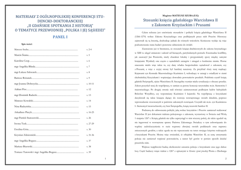 MATERIAŁY Z OGÓLNOPOLSKIEJ KONFERENCJI STUDENCKO-DOKTORANCKIEJ „II GDAŃSKIE SPOTKANIA Z HISTORIĄ” O TEMATYCE PRZEWODNIEJ „POLSKA I JEJ SĄSIEDZI” PANEL I Magister MATEUSZ SZUBA (UG) Stosunki księcia gdańskiego Warcisława II z Zakonem Krzyżackim i Prusami Celem referatu jest omówienie stosunków i polityki księcia gdańskiego Warcisława II (1266-1270) wobec Zakonu Krzyżackiego oraz podbijanych przez nich Prusów. Historycy zajmowali się tą kwestią, dochodząc jednak do różnych wniosków. Konieczne wydaje się więc Spis treści: podsumowanie stanu badań i ponowne odniesienie do źródeł. Zauważono już w literaturze, że stosunek książąt dzielnicowych do zakonu krzyżackiego Mateusz Szuba............................................................................................. s. 2-4 Marcin Śrama.............................................................................................. s. 5 Karolina Czop............................................................................................ s. 6 mgr Angelika Blinda................................................................................... s. 7 mgr Łukasz Szkwarek................................................................................. s. 8 Kujawami syn Konrada Mazowieckiego Kazimierz I, wchodzący w zatargi z osiadłymi w ziemi Bartosz Różanek......................................................................................... s. 9 chełmińskiej Krzyżakami i wspierający dowodnie powstańców pruskich. Podobnie czynił książę mgr Joanna Dobrzycka.............................................................................. s. 10-11 Adrian Flor................................................................................................. s. 12 mgr Dominik Radecki................................................................................ s. 13 Mateusz Kowalski....................................................................................... s. 14 wprowadzenie stosowanych w państwie zakonnych rozwiązań. Uczynili tak m.in. syn Kazimierza Nina Radzyńska.......................................................................................... s. 15 I- Siemomysł inowrocławski, czy brat Świętopełka, książę tczewski Sambor II. Arkadiusz Piecyk......................................................................................... s. 16-25 mgr Patrick Starczewski.............................................................................. s. 26 Iwona Tusk................................................................................................. s. 27-29 Ewelina Góra.............................................................................................. s. 30 zniszczonych grodów, a także zgoda na nie wpuszczanie na teren swojego księstwa walczących Krystian Zdziennicki.................................................................................. s. 31-36 z krzyżakami Prusów. Można więc stwierdzić, iż oficjalnie Warcisław II, za cenę utrzymania mgr Angelika Bogusz................................................................................. s. 37 Mariusz Bizewski........................................................................................ s. 38 Większe wątpliwości budzą okoliczności zawarcia pokoju z krzyżakami oraz jego dalsze Tomasz Turowski i mgr Angelika Bogusz................................................ s. 39 losy. Część badaczy wiąże traktat z 1267 z opisanymi w Kronice ziemi pruskiej Piotra z Dusburga w XIII w. ulegał zmianom i zależał od bieżących, partykularnych potrzeb. Ewentualne konflikty, jak zauważył Jan Powierski, miały charakter lokalny i przypominały spory między samymi książętami. Wynikały one często z sąsiedzkich zatargów i zmagań o konkretne ziemie. Pewne znaczenie miało więc także to, czy dany władca bezpośrednio sąsiadował z zakonem, czy z Prusami, a więc z czyjej strony był bardziej narażony. Za przykład służy tutaj rządzący gdański Świętopełk, ojciec Warcisława II. Szczególny wymiar miała rywalizacja o obszary pruskie. Zakon pozyskał tutaj do współpracy, w zamian za pewne koncesje terytorialne m.in. Siemowita I mazowieckiego. Po drugiej stronie stali również zainteresowani podbojem ludów bałtyjskich Bolesław Wstydliwy, czy wspomniany Kazimierz I kujawski. Na współpracę z krzyżakami decydowali się także książęta dążący do rozwoju wewnętrznego swoich dziedzin, poprzez Podstawą do odtworzenia polityki, jaką wobec krzyżaków i Prusów zamierzał realizować Warcisław II jest dokument traktatu pokojowego z zakonem, wystawiony w Świeciu nad Wisłą 1 sierpnia 1267 r. Książę gdański nie tylko zaprzysiągł w nim wieczny pokój, ale także zgodził się nie ingerować w wewnętrzne sprawy Państwa Zakonnego. Świadczy o tym zobowiązanie do wypłaty zadośćuczynienia w razie wyprawy zbrojnej swoich poddanych oraz naprawy pokoju nie zamierzał wspierać powstańców, a nawet był gotów w pewien sposób działać przeciwko nim. 1 2 walkami, jakie w przymierzu z Prusami toczył z zakonem starszy syn Świętopełka, książę świecki Również samo przybycie do Elbląga mogło wynikać z chęci uzyskania wsparcia od Lubeczan, Mściwoj II. Również on 3 stycznia 1268 roku zawarł w Chełmnie pokój z krzyżakami. których Warcisław wspierał w czasie swych rządów. Wobec braku dowodów na zawarcie przez Przypuszczano więc, że w działaniach Mściwoja wziął udział także Warcisław II, o czym niego sojuszu z wymienionymi podmiotami, bezpieczniej przenosić jego ewentualne zawiązanie świadczyłaby wg Jana Powierskiego działalność na gdańskim dworze emigrantów pruskich, dopiero na okres wygnania. w osobach Wajsyla i Glabuny. Warto jednak za Kazimierzem Jasińskim zwrócić uwagę na fakt, że Omówienia wymaga także stosunek Warcisława II do przekazania krzyżakom przez jego w dokumencie Warcisława II 