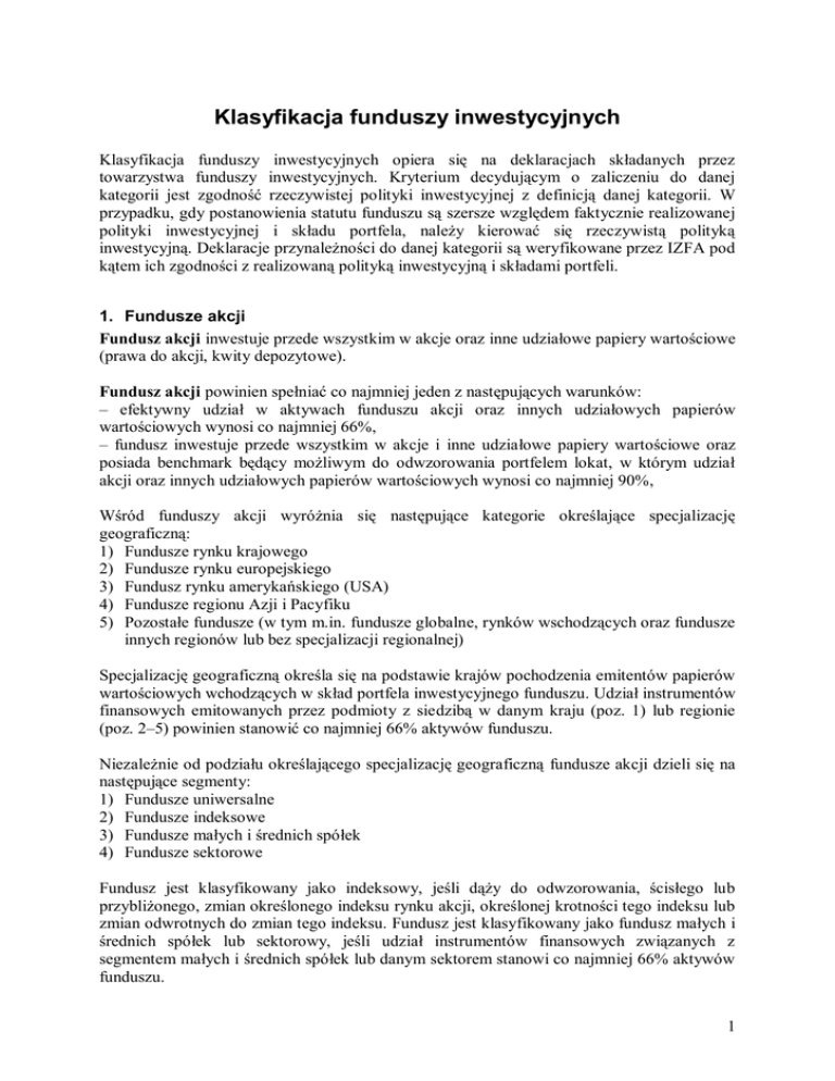 Klasyfikacja funduszy inwestycyjnych Klasyfikacja funduszy inwestycyjnych opiera się na deklaracjach składanych przez towarzystwa funduszy inwestycyjnych. Kryterium decydującym o zaliczeniu do danej kategorii jest zgodność rzeczywistej polityki inwestycyjnej z definicją danej kategorii. W przypadku, gdy postanowienia statutu funduszu są szersze względem faktycznie realizowanej polityki inwestycyjnej i składu portfela, należy kierować się rzeczywistą polityką inwestycyjną. Deklaracje przynależności do danej kategorii są weryfikowane przez IZFA pod kątem ich zgodności z realizowaną polityką inwestycyjną i składami portfeli. 1. Fundusze akcji Fundusz akcji inwestuje przede wszystkim w akcje oraz inne udziałowe papiery wartościowe (prawa do akcji, kwity depozytowe). Fundusz akcji powinien spełniać co najmniej jeden z następujących warunków: – efektywny udział w aktywach funduszu akcji oraz innych udziałowych papierów wartościowych wynosi co najmniej 66%, – fundusz inwestuje przede wszystkim w akcje i inne udziałowe papiery wartościowe oraz posiada benchmark będący możliwym do odwzorowania portfelem lokat, w którym udział akcji oraz innych udziałowych papierów wartościowych wynosi co najmniej 90%, Wśród funduszy akcji wyróżnia się następujące kategorie określające specjalizację geograficzną: 1) Fundusze rynku krajowego 2) Fundusze rynku europejskiego 3) Fundusz rynku amerykańskiego (USA) 4) Fundusze regionu Azji i Pacyfiku 5) Pozostałe fundusze (w tym m.in. fundusze globalne, rynków wschodzących oraz fundusze innych regionów lub bez specjalizacji regionalnej) Specjalizację geograficzną określa się na podstawie krajów pochodzenia emitentów papierów wartościowych wchodzących w skład portfela inwestycyjnego funduszu. Udział instrumentów finansowych emitowanych przez podmioty z siedzibą w danym kraju (poz. 1) lub regionie (poz. 2–5) powinien stanowić co najmniej 66% aktywów funduszu. Niezależnie od podziału określającego specjalizację geograficzną fundusze akcji dzieli się na następujące segmenty: 1) Fundusze uniwersalne 2) Fundusze indeksowe 3) Fundusze małych i średnich spółek 4) Fundusze sektorowe Fundusz jest klasyfikowany jako indeksowy, jeśli dąży do odwzorowania, ścisłego lub przybliżonego, zmian określonego indeksu rynku akcji, określonej krotności tego indeksu lub zmian odwrotnych do zmian tego indeksu. Fundusz jest klasyfikowany jako fundusz małych i średnich spółek lub sektorowy, jeśli udział instrumentów finansowych związanych z segmentem małych i średnich spółek lub danym sektorem stanowi co najmniej 66% aktywów funduszu. 1 Fundusze mieszane Fundusze mieszane inwestują w różne klasy aktywów, np. w udziałowe papiery wartościowe (w tym akcje), papiery o stałym dochodzie (obligacje, instrumenty rynku pieniężnego). Wśród funduszy mieszanych wyróżnia się następujące kategorie funduszy: 1) Fundusze z ochroną kapitału, dla których podstawową zasadą polityki inwestycyjnej jest dążenie do zabezpieczenia przed spadkiem wartości jednostki uczestnictwa lub certyfikatu inwestycyjnego poniżej określonego poziomu poprzez alokowanie portfela inwestycyjnego w udziałowe papiery wartościowe, instrumenty pochodne oraz papiery wartościowe o stałym dochodzie (przy czym poziom zabezpieczenia może być stały lub ulegać zmianom, zgodnie z zasadami określonymi w statucie, prospekcie informacyjnym lub prospekcie emisyjnym funduszu). 2) Fundusze stabilnego wzrostu, dla których efektywny udział akcji oraz innych udziałowych papierów wartościowych w aktywach nie powinien przekraczać 40%. 3) Fundusze zrównoważone, które powinny spełniać jeden z dwóch następujących warunków: – efektywny udział akcji oraz innych udziałowych papierów wartościowych w aktywach funduszu nie powinien być mniejszy od 40% i większy od 60%, albo – efektywny udział akcji oraz innych udziałowych papierów wartościowych w aktywach nie powinien być mniejszy od 30% i większy od 70% oraz fundusz powinien posiadać benchmark będący możliwym do odwzorowania portfelem lokat, w którym wartościowy udział akcji oraz innych udziałowych papierów wartościowych mieści się w przedziale 40%–60%. 4) Fundusze aktywnej alokacji i selektywne, dla których udział akcji oraz innych udziałowych papierów wartościowych w portfelu lokat kształtuje się szerokim przedziale, nieuwzględnionym w pozostałych kategoriach funduszy mieszanych. 5) Fundusze mieszane – inne. Kategoria ta obejmuje pozostałe fundusze mieszane, których nie można przypisać do innych kategorii. Zastosowanie instrumentów pochodnych oraz dokonywanie lokat w tytuły uczestnictwa instytucji wspólnego inwestowania nie może powodować wykroczenia minimalnej bądź maksymalnej ekspozycji funduszu na rynek akcji poza progi przewidziane dla danej kategorii. Wśród funduszy mieszanych wyróżnia się ponadto następujące kategorie określające specjalizację geograficzną: 1) Fundusze rynku krajowego 2) Fundusze rynku europejskiego 3) Fundusz rynku amerykańskiego (USA) 4) Fundusze regionu Azji i Pacyfiku 5) Pozostałe fundusze (w tym m.in. fundusze globalne, rynków wschodzących oraz fundusze innych regionów lub bez specjalizacji regionalnej) Specjalizację geograficzną określa się na podstawie krajów pochodzenia emitentów papierów wartościowych wchodzących w skład portfela inwestycyjnego funduszu. Udział instrumentów finansowych emitowanych przez podmioty z siedzibą w danym kraju (poz. 1) lub regionie (poz. 2–5) powinien stanowić co najmniej 66% aktywów funduszu. 2 2. Fundusze dłużne Fundusze dłużne inwestują przede wszystkim w papiery wartościowe o stałym dochodzie. Fundusz nie może inwestować w udziałowe papiery wartościowe z wyjątkiem nabycia akcji w wyniku konwersji długu. Wśród funduszy dłużnych wyróżnia się następujące kategorie określające dominujący