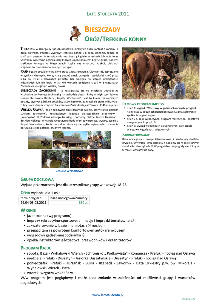 LATO STUDENTA 2011 BIESZCZADY OBÓZ/TREKKING KONNY TREKKING w szczególny sposób umożliwia niezwykle bliski kontakt z koniem i z dziką przyrodą. Podczas wyprawy jeździmy konno 5‐8 godz. dziennie, robiąc co jakiś czas postoje. W trakcie rajdu możliwe są kąpiele w rzekach lub w Jeziorze Solińskim, wieczorne ogniska, przy których umilać nam czas będzie gitara. Podczas trekkingu konnego w Bieszczadach, czeka nas mnóstwo atrakcji, pięknych krajobrazów oraz niezapomnianych przygód. RAJD będzie podzielony na dwie grupy zaawansowania. Dlatego też, zapraszamy wszystkich chętnych, którzy chcą poczuć smak przygody i podziwiać choć przez kilka dni świat z końskiego grzbietu, bez względu na stopień umiejętności jeździeckich lub ich brak. Wiatr we włosach będziemy łapać w Bieszczadach Zachodnich w regionie Wielkiej Rawki. BIESZCZADY ZACHODNIE ‐ to rozciągający się od Przełęczy Użockiej na wschodzie po Przełęcz Łupkowską na zachodzie obszar, który w większości leży na terenie Rezerwatu Biosfery „Karpaty Wschodnie”. Jest to kraina malowniczych pejzaży, czystych górskich potoków, lasów i połonin, zamieszkała przez wilki, rysie i żubry. Najwyższym szczytem Bieszczadów Zachodnich jest Tarnica (1346 m n.p.m.) RAM AMOWY PROGRAM IMPREZY dzień 1: wyjazd z Warszawy w godzinach rannych, przyjazd na miejsce w godzinach popołudniowych, zakwaterowanie, spotkanie organizacyjne dzień 2‐5: rajd, wypoczynek, program rekreacyjno ‐ sportowo ‐ turystyczny, imprezki ☺ dzień 5: wyjazd w godzinach południowych, przyjazd do Warszawy w godzinach wieczornych WIELKA RAWKA ‐ rejon całkowicie opustoszały po wojnie, który stał się polskim „Dzikim Zachodem”, rozsławionym legendą bieszczadzkich osadników i „kowbojów” ☺ Podczas naszego trekkingu poznamy piękne tereny Bieszczad i Beskidu Niskiego. W trakcie wypoczynku będą Wam towarzyszyć, wywodzące się z Karpat Wschodnich, konie huculskie, które są niezwykle wytrzymałe i sprawnie poruszają się po górskim, trudnym terenie. ZAKWATEROWANIE Baza noclegowa ‐ pokoje kilkuosobowe + sanitariaty (toaleta, prysznic, umywalka) oraz namioty + kąpiemy się w miejscowych rzeczkach i strumykach ☺ W przypadku złej pogody nie śpimy w terenie i wracamy do bazy. GALERIA WYJAZDOWA GRUPA DOCELOWA Wyjazd przeznaczony jest dla uczestników grupy wiekowej: 18‐28 CENA wyjazdu dla 1 os.: termin wyjazdu baza noclegowa/namioty 29.04‐03.05.2011 650 ZŁ W CENIE jazda konna (wg programu) imprezy rekreacyjno‐sportowe, animacje i imprezki tematyczne ☺ zakwaterowanie w bazie i namiotach (4 noclegi) przejazd tam i z powrotem komfortowym autokarem/busem wyjazdowy gadżet‐niespodzianka ☺ opieka instruktorów jeździectwa, przewodników i organizatorów PROGRAM RAJDU sobota: Baza ‐ Wyhalowski Wierch ‐ Schronisko „ Podkowiata” ‐ Komańcza ‐ Prełuki ‐ nocleg nad Osławą niedziela: Prełuki ‐ Duszatyń ‐ Jeziorka Duszatyńskie ‐ Duszatyń ‐ Prełuki ‐ nocleg nad Osławą poniedziałek: Prełuki ‐ Turzańsk ‐ Suliła ‐ Rzepedź ‐ Jawornik ‐ Baza Orkiestry p.w. Św. Mikołaja ‐ Wyhalowski Wierch ‐ Baza wtorek: wzgórza wokół Bazy W/w program jest poglądowy i może ulec zmianie w zależności od możliwości grupy i warunków pogodowych. www.latostudenta.pl strona: 1/3 LATO STUDENTA 2011 DODATKOWO PŁATNE obowiązkowe ubezpieczenie NNW w wysokości 25 zł (płatne wraz z wpłatą końcową) toczek (niezbędny podczas jazdy konnej, należy się w niego zaopatrzyć przed wyjazdem, można go kupić w każdym większym sklepie sportowym za ok. 50 zł) OPCJE pakiet rozszerzający ubezpieczenie o opcję uprawiania jeździectwa w wysokości 25 zł (zalecane dla osób, które zamierzają jeździć konno; płatne wraz z wpłatą końcową) pakiet rozszerzający ubezpieczenie standardowe o odpowiedzialność za schorzenia przewlekłe (nadciśnienie, cukrzyca, itd.) ‐ opłata dodatkowa w wysokości 60 zł (płatne wraz z wpłatą końcową) WYŻYWIENIE ‐ istnieje możliwość stołowania się w schroniskach (podczas odpoczynków) oraz w lokalnych gospodach (ceny lokalne tj. studenckie ☺), możliwe jest także uzupełnianie zapasów w pobliskich sklepach. Najczęściej praktykowane jest wspólnie przyrządzanie posiłków ☺ UBEZPIECZENIE ‐ szczegółowe warunki ubezpieczenia patrz str. 3 „Informacje dodatkowe” ZNIŻKI wg programu zniżkowego (szczegóły na: www.latostudenta.pl) w przypadku dojazdu własnego w obie strony 100 zł taniej ZAPISY www.latostudenta.pl PŁATNOŚCI ZALICZKA wynosi 400 ZŁ OD OSOBY. Wpłatę zaliczki należy dokonać dopiero po potwierdzonej przez Klub rezerwacji miejsca. Jeśli w ciągu 3 dni od daty otrzymania potwierdzenia rezerwacji miejsca zaliczka nie zostanie wpłacona, rezerwacja zostanie anulowana. WPŁATA KOŃCOWA termin wyjazdu termin wpłaty końcowej tytuł wpłaty 29.04‐03.05.2011 24.03.2011 BIE.0429.IMIĘ.NAZWISKO Jeżeli rezerwacja została dokonana po terminie wpłaty końcowej obowiązuje wpłata kwoty całkowitej w terminie: 3 dni od daty otrzymania potwierdzenia rezerwacji miejsca (rezerwacje do 11 dni przed wyjazdem); 1 dnia od daty otrzymania potwierdzenia rezerwacji miejsca (rezerwacje od 10 dni przed wyjazdem). Płatności dokonujemy na podane poniżej konto bankowe. Dokonanie wpłaty Klub potwierdza emailem po zaksięgowaniu pieniędzy na koncie. Wpłata pieniędzy oznacza akceptację „Regulaminu Uczestnictwa”. NAMIARY BANKOWE Klub Uczelniany AZS Politechnika Warszawska Adres: ul. Waryńskiego 12a, 00‐631 Warszawa Nr rachunku: 73 1030 1016 0000 0000 8114 2017 ZAPRASZAMY DO AKTYWNEGO WYPOCZYNKU I SUPER ZABAWY! www.latostudenta.pl strona: 2/3 LATO STUDENTA 2011 INFORMACJE DODATKOWE DOKUMENT TOŻSAMOŚCI ‐ prosimy o zabranie ze sobą dokumentu potwierdzającego Waszą tożsamość (dowód osobisty/legitymacja studencka/prawo jazdy). UBEZPIECZENIE Polisa Polskie Towarzystwo Ubezpieczeń S.A. (NNW 