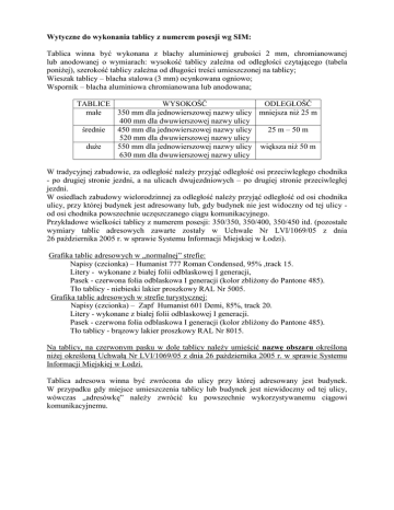 Wytyczne do wykonania tablicy z numerem posesji wg SIM: Tablica winna być wykonana z blachy aluminiowej grubości 2 mm, chromianowanej lub anodowanej o wymiarach: wysokość tablicy zaleŜna od odległości czytającego (tabela poniŜej), szerokość tablicy zaleŜna od długości treści umieszczonej na tablicy; Wieszak tablicy – blacha stalowa (3 mm) ocynkowana ogniowo; Wspornik – blacha aluminiowa chromianowana lub anodowana; TABLICE WYSOKOŚĆ ODLEGŁOŚĆ małe 350 mm dla jednowierszowej nazwy ulicy mniejsza niŜ 25 m 400 mm dla dwuwierszowej nazwy ulicy średnie 450 mm dla jednowierszowej nazwy ulicy 25 m – 50 m 520 mm dla dwuwierszowej nazwy ulicy duŜe 550 mm dla jednowierszowej nazwy ulicy większa niŜ 50 m 630 mm dla dwuwierszowej nazwy ulicy W tradycyjnej zabudowie, za odległość naleŜy przyjąć odległość osi przeciwległego chodnika - po drugiej stronie jezdni, a na ulicach dwujezdniowych – po drugiej stronie przeciwległej jezdni. W osiedlach zabudowy wielorodzinnej za odległość naleŜy przyjąć odległość od osi chodnika ulicy, przy której budynek jest adresowany lub, gdy budynek nie jest widoczny od tej ulicy od osi chodnika powszechnie uczęszczanego ciągu komunikacyjnego. Przykładowe wielkości tablicy z numerem posesji: 350/350, 350/400, 350/450 itd. (pozostałe wymiary tablic adresowych zawarte zostały w Uchwale Nr LVI/1069/05 z dnia 26 października 2005 r. w sprawie Systemu Informacji Miejskiej w Łodzi). Grafika tablic adresowych w „normalnej” strefie: Napisy (czcionka) – Humanist 777 Roman Condensed, 95% ,track 15. Litery - wykonane z białej folii odblaskowej I generacji, Pasek - czerwona folia odblaskowa I generacji (kolor zbliŜony do Pantone 485). Tło tablicy - niebieski lakier proszkowy RAL Nr 5005. Grafika tablic adresowych w strefie turystycznej: Napisy (czcionka) – Zapf Humanist 601 Demi, 85%, track 20. Litery - wykonane z białej folii odblaskowej I generacji. Pasek - czerwona folia odblaskowa I generacji (kolor zbliŜony do Pantone 485). Tło tablicy - brązowy lakier proszkowy RAL Nr 8015. Na tablicy, na czerwonym pasku w dole tablicy naleŜy umieścić nazwę obszaru określoną niŜej określoną Uchwałą Nr LVI/1069/05 z dnia 26 października 2005 r. w sprawie Systemu Informacji Miejskiej w Łodzi. Tablica adresowa winna być zwrócona do ulicy przy której adresowany jest budynek. W przypadku gdy miejsce umieszczenia tablicy lub budynek jest niewidoczny od tej ulicy, wówczas „adresówkę” naleŜy zwrócić ku powszechnie wykorzystywanemu ciągowi komunikacyjnemu.