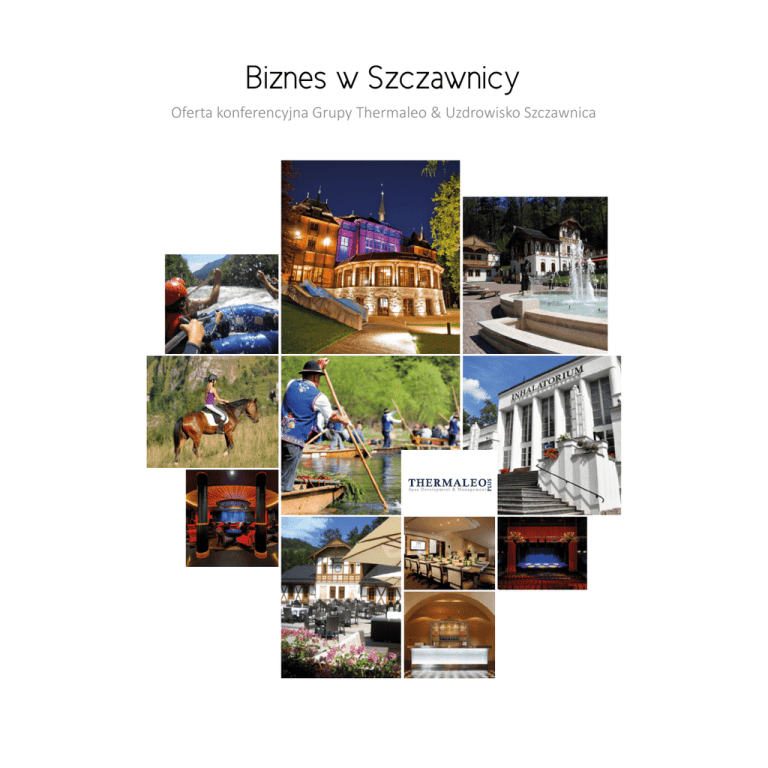 Biznes w Szczawnicy Oferta konferencyjna Grupy Thermaleo & Uzdrowisko Szczawnica Kiedy w 2004 roku spadkobiercy Adama hr. Stadnickiego odzyskali dawny majątek i prawa do Uzdrowiska Szczawnica powstała rodzinna spółka Thermaleo. Od tego momentu Andrzej Mańkowski, wnuk hrabiego, wraz z rodziną zdecydował się zaangażować środki finansowe oraz ogromny nakład pracy w odbudowę uzdrowiska. Szczawnica to urocze miasto z bogatą historią oddalone zaledwie 110 km od Krakowa. Kurort stanowi idealne miejsce nie tylko na wypoczynek, ale także na organizację kongresów, konferencji czy spotkań biznesowych i firmowych imprez integracyjnych w pięknej górskiej scenerii Pienin. To co rodzina Mańkowskich zastała w Szczawnicy nie było w idealnym stanie, ale krok po kroku zaczęto wszystko skrupulatnie odnawiać na podstawie archiwalnych zdjęć i dostosowywać do standardów europejskich. Spółka Thermaleo, obecnie prowadzona przez trójkę rodzeństwa – Helenę, Christophéa i Nicolasa Mańkowskich, kontynuuje w ten sposób wizję, która przyświecała ich pradziadkowi – stworzyć ze Szczawnicy kurort z pełną gamą zabiegów oraz bogatą ofertą gastronomiczną, kulturalną i noclegową. Od 8 lat, dzięki ich staraniom i zaangażowaniu, powstaje uzdrowisko w pełnym tego słowa znaczeniu – restauracje, kawiarnie, hotele i wille, centra kultury czy rekreacji. Bogata oferta noclegowa i gastronomiczna, jak również regionalny czar i paleta atrakcji turystycznych czyni Szczawnicę wymarzoną propozycją na umiejscowienie Państwa wydarzenia. Dodatkowym atutem jest możliwość wzbogacenia go o liczne atrakcje oferowane uczestnikom po dniach spędzonych na prelekcjach i wykładach czy podczas organizowanych dni dodatkowych w ramach pobytu. Uzdrowisko oferuje szlaki piesze, rowerowe i konne po pienińskich szczytach, spływ przełomem Dunajca, ścieżki spacerowe po pobliskich rezerwatach przyrody, wyciąg krzesełkowy na Palenicę, na szczycie której znajduje się rynna grawitacyjna, a zimą trasy narciarskie i snowboardowe czy kuligi z pochodniami. W 2008 roku nastąpiła inauguracja pierwszych projektów spółki Thermaleo - otwarcie kawiarni Café Helenka, Pijalni Wód Mineralnych i Galerii Pijalni Wód na Placu Dietla. Od tego momentu każdy kolejny rok przynosił nowe projekty i realizacje – w 2009 roku nastąpiło otwarcie pierwszego w regionie pięciogwiazdkowego hotelu, Modrzewie Park Hotel *****, a w 2010 roku doszło Muzeum Uzdrowiska. Rok 2011 to zakończenie jednej z największych inwestycji spółki – całkowita odbudowa zgodnie z pierwowzorem perły kulturalnej Szczawnicy- Dworku Gościnnego z jego piękną salą teatralną i balową oraz restauracją „Jazz Bar”. Kolejny rok, 2012, to rewitalizacja dwóch miejskich parków wspólnie z Urzędem Miasta oraz przy udziale funduszy Unijnych, renowacja Hotelu Nawigator i Willi Marta, a także inwestycje w Stadninę Koni RAJD. Jako Grupa pragniemy Państwu zaproponować organizację wydarzenia w jednym z naszych obiektów. W zależności od liczby uczestników i rodzaju wydarzenia oferujemy do wyboru: Przez wszystkie te lata spółka intensywnie się rozwijała w różnych kierunkach, a to dopiero początek. Dzisiaj działa w sektorach hotelarskim, gastronomicznym, kulturalnym i turystycznym zmieniając Szczawnicę w uzdrowisko o europejskim standardzie. Jest ona doskonałym miejscem zarówno dla osób pragnących połączyć pracę z wypoczynkiem jak również na organizację dużych kongresów czy konferencji. Dodatkowo, jako Grupa posiadamy wiele możliwości na organizację atrakcji dodatkowych dla uczestników konferencji czy spotkania firmowego, tak aby cały pobyt stał się wyjątkowym biznesowym wydarzeniem. Proponujemy m.in. takie atrakcje jak: kuligi/przejażdżki wozem w Stadninie Rajd czy wieczór z grillem przy akompaniamencie kapeli góralskiej, niedzielny brunch, organizację koncertu czy występu artystycznego, oraz wiele innych. - duży obiekt — stylowy Dworek Gościnny idealny na kongresy, konferencje, prezentacje produktów, w tym także dużego gabarytu (np. samochody); - średni obiekt — Hotel Nawigator*** jako propozycja na mniejsze konferencje, spotkania biznesowe oraz motywacyjne czy szkolenia; - mniejszy obiekt — pięciogwiazdkowy Modrzewie Park Hotel***** na ekskluzywne konferencje dla zarządu czy spotkania z kluczowymi klientami. Oferujemy także zakwaterowanie dla uczestników w naszych hotelach oraz willach, jak również bogate zaplecze gastronomiczne na organizację kolacji biznesowych, bankietów czy wieczornych spotkań. Jesteście znudzeni standardowymi konferencjami i pragniecie zorganizować coś wyjątkowego dla swoich klientów, partnerów biznesowych czy pracowników? Szczawnica jest idealnym miejscem, by zwykłą konferencję zamienić w ciekawe spotkanie. Serdecznie zapraszamy do zapoznania się z całością oferty. Thermaleo Plus Sp. z o. o., Plac Dietla 7, 34-460 Szczawnica | tel.: +48 (18) 540 04 00 e-mail: [email protected] | www.thermaleo.pl Dworek Gościnny Dworek Gościnny, uosobienie czasów największej prosperity Szczawnicy, ponownie zachwyca swoim rozmachem, nowoczesnością i niepowtarzalnym stylem. Położony w sercu pienińskiego kurortu, otoczony zielenią Parku Górnego, łączy w sobie czar i urok minionej epoki ze współczesną funkcjonalnością. Kompleksowa informatyzacja budynku pozwala na koordynację najbardziej złożonych eventów. W przypadku konferencji czy kongresu proponujemy organizację wszystkich prelekcji na sali głównej Dworku, która w układzie teatralnym mieści 362-osobowe audytorium. Ponadto dla firm, które podczas kongresu chciałyby wystąpić z prezentacją swojego produktu udostępniamy kilka miejsc wystawienniczych we foyer co pozwoli uczestnikom na zapoznanie się z ofertą. W przestronnym hall’u można ustawić stoły z cateringiem, a korzystający z przerwy goście odpoczną na sofach i fotelach biblioteki. Po z