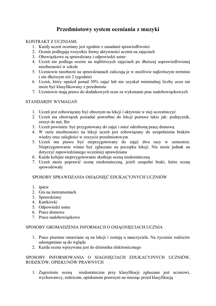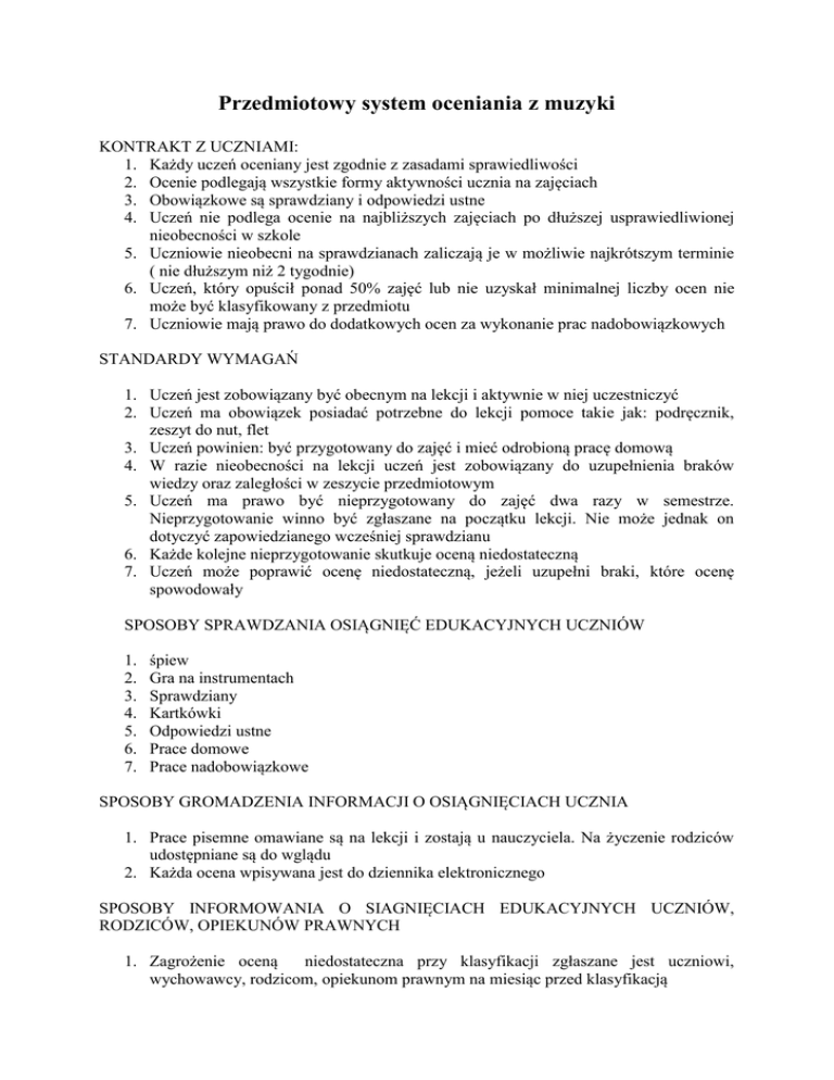 Przedmiotowy system oceniania z muzyki KONTRAKT Z UCZNIAMI: 1. Każdy uczeń oceniany jest zgodnie z zasadami sprawiedliwości 2. Ocenie podlegają wszystkie formy aktywności ucznia na zajęciach 3. Obowiązkowe są sprawdziany i odpowiedzi ustne 4. Uczeń nie podlega ocenie na najbliższych zajęciach po dłuższej usprawiedliwionej nieobecności w szkole 5. Uczniowie nieobecni na sprawdzianach zaliczają je w możliwie najkrótszym terminie ( nie dłuższym niż 2 tygodnie) 6. Uczeń, który opuścił ponad 50% zajęć lub nie uzyskał minimalnej liczby ocen nie może być klasyfikowany z przedmiotu 7. Uczniowie mają prawo do dodatkowych ocen za wykonanie prac nadobowiązkowych STANDARDY WYMAGAŃ 1. Uczeń jest zobowiązany być obecnym na lekcji i aktywnie w niej uczestniczyć 2. Uczeń ma obowiązek posiadać potrzebne do lekcji pomoce takie jak: podręcznik, zeszyt do nut, flet 3. Uczeń powinien: być przygotowany do zajęć i mieć odrobioną pracę domową 4. W razie nieobecności na lekcji uczeń jest zobowiązany do uzupełnienia braków wiedzy oraz zaległości w zeszycie przedmiotowym 5. Uczeń ma prawo być nieprzygotowany do zajęć dwa razy w semestrze. Nieprzygotowanie winno być zgłaszane na początku lekcji. Nie może jednak on dotyczyć zapowiedzianego wcześniej sprawdzianu 6. Każde kolejne nieprzygotowanie skutkuje oceną niedostateczną 7. Uczeń może poprawić ocenę niedostateczną, jeżeli uzupełni braki, które ocenę spowodowały SPOSOBY SPRAWDZANIA OSIĄGNIĘĆ EDUKACYJNYCH UCZNIÓW 1. 2. 3. 4. 5. 6. 7. śpiew Gra na instrumentach Sprawdziany Kartkówki Odpowiedzi ustne Prace domowe Prace nadobowiązkowe SPOSOBY GROMADZENIA INFORMACJI O OSIĄGNIĘCIACH UCZNIA 1. Prace pisemne omawiane są na lekcji i zostają u nauczyciela. Na życzenie rodziców udostępniane są do wglądu 2. Każda ocena wpisywana jest do dziennika elektronicznego SPOSOBY INFORMOWANIA O SIAGNIĘCIACH EDUKACYJNYCH UCZNIÓW, RODZICÓW, OPIEKUNÓW PRAWNYCH 1. Zagrożenie oceną niedostateczna przy klasyfikacji zgłaszane jest uczniowi, wychowawcy, rodzicom, opiekunom prawnym na miesiąc przed klasyfikacją 2. Oceny pozytywne również podawane są na miesiąc przed klasyfikacją. Uczeń może poprawić niedostateczną ocenę semestralną lub roczną przedstawiając uzupełniony zeszyt przedmiotowy oraz zaliczając wyznaczoną przez nauczyciela partię materiału jak również wykonując określone pieśni lub piosenki. Wyniki osiągnięć edukacyjnych ucznia udostępnianie są tylko osobom upoważnionym do ich poznania. WARTOŚCIOWANIE OCEN ZE ŚPIEWU 1. OCENA CELUJĄCA- uczeń zaśpiewał utwór z prawidłową intonacją, rytmicznie oraz bez pomyłek w tekście 2. OCENA BARDZO DOBRA- utwór wykonany rytmicznie, bez pomyłek w tekście 3. OCENA DOBRA- uczeń wykonał utwór bez pomyłek w tekście, zachowując ogólny charakter melodii 4. OCENA DOSTATECZNA- utwór wykonany z błędami w intonacji, rytmie i tekście 5. OCENA DOPUSZCZAJACA- uczeń zaśpiewał utwór z wieloma pomyłkami przy dużej pomocy nauczyciela 6. OCENA NIEDOSTATECZNA- uczeń odmówił wykonania utworu Nauczyciel oceniając ucznia bierze pod uwagę przedewszystkim jego zaangażowanie, wkład pracy i aktywność. Ocena postawy, wysiłku i aktywności ucznia na lekcjach dokonywana jest z życzliwością i wyrozumiałością. Muzyka jest przedmiotem artystycznym, gdzie o umiejętnościach decydują w dużym stopniu uzdolnienia. Nie powinny one jednak stanowić same w sobie podstawy do oceniania. Dlatego przy ocenie należy zwrócić uwagę na jego wkład pracy oraz indywidualne postępy. PRZY OCENIE NAUCZYCIEL UWZGLĘDNIA: 1. Opanowanie wiedzy w zakresie wybranych tematów 2. Umiejętności muzyczne (śpiew, gra na instrumentach) 3. Rozwój inwencji twórczej OCENA UCZNIA DOKONYWANA JEST POPRZEZ REALIZACJĘ CELÓW: Wychowawczych 1. Aktywność na lekcjach 2. Przygotowanie do zajęć 3. Postawa wobec stawianych zadań 4. Umiejętność formułowania problemów, wyciągania wniosków oraz poszukiwania własnych rozwiązań 5. Wysiłek wkładany w wykonanie zadań Kształcących 1. Ocenianie osiągnięć osiągnięć zakresie instrumentalnych oraz percepcji muzyki rozwoju umiejętności Poznawczych 1. Zakres opanowanej wiedzy muzycznej OCENA Z MUZYKI UWZGLĘDNIA TAKŻE UDZIAŁ UCZNIA W: 1. Muzycznych zajęciach pozalekcyjnych (warsztaty wokalne) wokalnych, 2. Programach artystycznych szkolnych uroczystości 3. Konkursach muzycznych Ocena semestralna wystawiana jest z uwzględnieniem wewnątrzszkolnego i przedmiotowego systemu oceniania. Obrazuje ona postawę ucznia wobec przedmiotu, jego zaangażowanie, wkład pracy oraz poziom wiedzy uzyskanej w danym okresie. Na ocenę roczną wpływ mają wszystkie wyżej wymienione czynniki. Odzwierciedla ona poziom osiągnięć edukacujmnych ucznia zdobytych w ciągu całego roku szkolnego. KRYTERIA OCENIANIA: Ocena celująca: Uczeń spełnia wszystkie wymagania na ocenę bardzo dobrą, a ponadto: 1. Samodzielnie rozwija własne uzdolnienia i zainteresowania muzyczne 2. Bierze udział w szkolnych uroczystościach, akademiach, imprezach artystycznych, w szkolnych zajęciach pozalekcyjnych: Warsztaty wokalne, chór szkolny 3. Posiada rozszerzone wiadomości z zakresu o muzyce 4. Biegle posługuje się zdobytymi wiadomościami praktycznych teoretycznych zadaniach muzycznych Ocena bardzo dobra: Uczeń opanował pełny zakres wiedzy i umiejętności określony programem nauczania muzyki, a także: 1. Sprawnie posługuje się zdobytymi wiadomościami zadaniach muzycznych 2. Wykazuje dużą aktywność na lekcji 3. Starannie realizuje powierzone mu zadania 4. Pewnie realizuje pomysły muzyczne rozwijając własne uzdolnienia Ocena dobra: Uczeń opanował zakres wiedzy w stopniu dobrym oraz: 1. Poprawnie wykorzystuje zdobyte wiadomości w ćwiczeniach Samodzielnie rozwiązuje typowe zadania praktyczno- teoretyczne 2. Zwykle pracuje systematycznie i efektywnie 3. Bierze czynny udział w zajęc