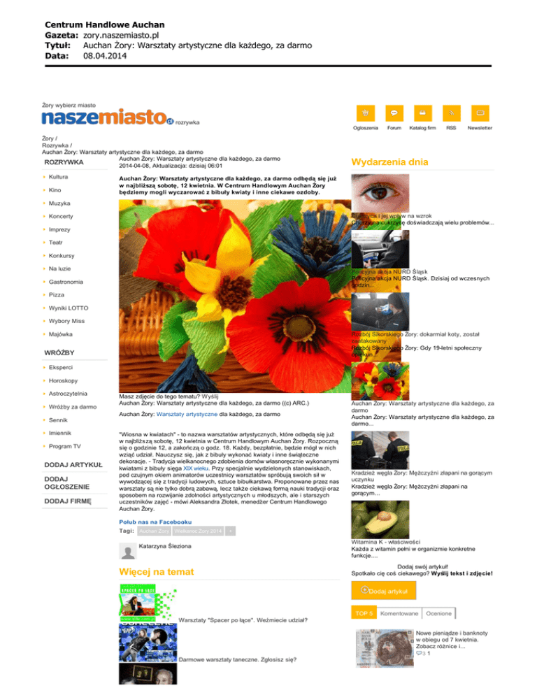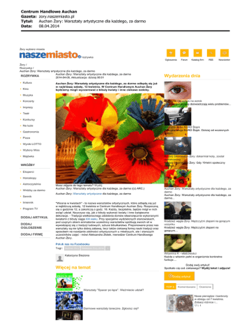 Centrum Handlowe Auchan Gazeta: zory.naszemiasto.pl Tytu³: Auchan ¯ory: Warsztaty artystyczne dla ka¿dego, za darmo Data: 08.04.2014 Żory wybierz miasto rozrywka Ogloszenia Żory / Rozrywka / Auchan Żory: Warsztaty artystyczne dla każdego, za darmo Auchan Żory: Warsztaty artystyczne dla każdego, za darmo ROZRYWKA 2014-04-08, Aktualizacja: dzisiaj 06:01 Kultura Kino Forum Katalog firm RSS Newsletter Wydarzenia dnia Auchan Żory: Warsztaty artystyczne dla każdego, za darmo odbędą się już w najbliższą sobotę, 12 kwietnia. W Centrum Handlowym Auchan Żory będziemy mogli wyczarować z bibuły kwiaty i inne ciekawe ozdoby. Muzyka Cukrzyca i jej wpływ na wzrok Chorzy na cukrzycę doświadczają wielu problemów... Koncerty Imprezy Teatr Konkursy Na luzie Policyjna akcja NURD Śląsk Policyjna akcja NURD Śląsk. Dzisiaj od wczesnych godzin... Gastronomia Pizza Wyniki LOTTO Wybory Miss Majówka Rozbój Sikorskiego Żory: dokarmiał koty, został zaatakowany Rozbój Sikorskiego Żory: Gdy 19-letni społeczny opiekun... WRÓŻBY Eksperci Horoskopy Astroczytelnia Wróżby za darmo Masz zdjęcie do tego tematu? Wyślij Auchan Żory: Warsztaty artystyczne dla każdego, za darmo ((c) ARC.) Auchan Żory: Warsztaty artystyczne dla każdego, za darmo Sennik Imiennik Program TV DODAJ ARTYKUŁ DODAJ OGŁOSZENIE DODAJ FIRMĘ "Wiosna w kwiatach" - to nazwa warsztatów artystycznych, które odbędą się już w najbliższą sobotę, 12 kwietnia w Centrum Handlowym Auchan Żory. Rozpoczną się o godzinie 12, a zakończą o godz. 18. Każdy, bezpłatnie, będzie mógł w nich wziąć udział. Nauczysz się, jak z bibuły wykonać kwiaty i inne świąteczne dekoracje. - Tradycja wielkanocnego zdobienia domów własnoręcznie wykonanymi kwiatami z bibuły sięga XIX wieku. Przy specjalnie wydzielonych stanowiskach, pod czujnym okiem animatorów uczestnicy warsztatów spróbują swoich sił w wywodzącej się z tradycji ludowych, sztuce bibułkarstwa. Proponowane przez nas warsztaty są nie tylko dobrą zabawą, lecz także ciekawą formą nauki tradycji oraz sposobem na rozwijanie zdolności artystycznych u młodszych, ale i starszych uczestników zajęć - mówi Aleksandra Złotek, menedżer Centrum Handlowego Auchan Żory. Auchan Żory: Warsztaty artystyczne dla każdego, za darmo Auchan Żory: Warsztaty artystyczne dla każdego, za darmo... Kradzież węgla Żory: Mężczyźni złapani na gorącym uczynku Kradzież węgla Żory: Mężczyźni złapani na gorącym... Polub nas na Facebooku Tagi: Auchan Żory Wielkanoc Żory 2014 + Katarzyna Śleziona Więcej na temat Witamina K - właściwości Każda z witamin pełni w organizmie konkretne funkcje.... Dodaj swój artykuł! Spotkało cię coś ciekawego? Wyślij tekst i zdjęcie! Dodaj artykuł TOP 5 Komentowane Ocenione Warsztaty "Spacer po łące". Weźmiecie udział? Nowe pieniądze i banknoty w obiegu od 7 kwietnia. Zobacz różnice i... 31 Darmowe warsztaty taneczne. Zgłosisz się? Centrum Handlowe Auchan Gazeta: zory.naszemiasto.pl Tytu³: Auchan ¯ory: Warsztaty artystyczne dla ka¿dego, za darmo Data: 08.04.2014 Depresja, lęk, choroba Alzheimera... Remont w Cieszynie: Wściekła kobieta [HIT INTERNETU] 22 Żory: Dzielnia Kleszczówka od końca XIX wieku do 1945 roku 3 Cząstka olimpiady na żorskim Rynku! Komentarze (0) Zaloguj się / Zarejestruj się! Ambasada Żory: Impreza pod nazwą Disco Never Dies 4 Filmy Żory: "Film dedykuję wszystkim kretynom"... 35 Dodając komentarz akceptujesz regulamin. c podziel się na facebooku d e f g Podobne ogłoszenia Dodaj komentarz Kwiaty z bibuły na zamówienie Brak komentarzy. Możesz być pierwszy! Kwiaty z bibuły na zamówienie Witam, oferuje piekne kwiaty z bibuły. Pojedyncze oraz... Mieszkańcy informują Ten motocyklista cudem przeżył. Zobacz to! lokal handlowy zal02-04-2014 Z cyklu: Jak to jest zrobione - długie szyny mat. prasowe31-03-2014 Co się może stać gdy 2. firmy budują chodnik? sauer27-03-2014 Ty i Twoja okolica: fotografuj, informuj, recenzuj, pisz! + Podziel się tym, co wiesz! lokal handlowy Żory centrum.Do wynajęcia lokal handlowy 80 m , całe I... lokal handlowy lokal handlowy Żory centrum , lokal handlowy 80 m w pawilonie... Warsztaty Zdrowego Odżywiania Warsztaty Zdrowego Odżywiania *Czas trwania: 12 tygodni *Wsparcie dietetyka i trenera... Podobne materiały Warsztaty ludowe w łowickim skansenie Warsztaty ludowe w łowickim skansenie, znajdującym się na... Koziegłowy: warsztaty rękodzieła - kwiaty i palmy wielkanocne Miejsko-Gminny Ośrodek Promocji Kultury w Koziegłowach... Targi ogrodnicze w Gdyni. Kiermasz, piknik i Centrum Handlowe Auchan Gazeta: zory.naszemiasto.pl Tytu³: Auchan ¯ory: Warsztaty artystyczne dla ka¿dego, za darmo Data: 08.04.2014 warsztaty w parku w Kolibkach [ZDJĘCIA] Kwiaty, krzewy, drzewka. Kwitnące, owocujące, o... Żory: "Spacer po łące" - warsztaty relaksacyjnomotywacyjne Żory: "Spacer po łące" - warsztaty... Sonda Jaki jest największy grzech PKP? j Pociągi jeżdżą w żółwim tempie k l m n j Spóźnienia są na porządku dziennym k l m n j Pociągi są stare i w fatalnym stanie k l m n technicznym j Dworce są brudne i zaniedbane k l m n j W pociągach brakuje maszynistów, a w k l m n administracji panuje biurokracja j Brakuje działających kas k l m n Głosuj Podobne imprezy Skompletuj swój piórnik podczas warsztatów artystycznych 31 Sierpnia 2013 godz. 11:00Centrum Handlowe Auchan, Bohaterów Monte Cassino 421, 43-300, Bielsko-Biała Wymarzone koszulki powstaną w Krasnem 23 Listopada 2013 godz. 12:00 Stwórz oryginalne ozdoby choinkowe 14 Grudnia 2013 godz. 11:00Centrum Handlowe Auchan, Rybnicka 207, 44-100, Gliwice Stwórz oryginalne ozdoby na bożonarodzeniową choinkę 7 Grudnia 2013 godz. 12:00Centrum Handlowe Auchan Płock, Wyszogrodzka 140, 09-400, Płock Serwisy branżowe: Ogłoszenia Mieszkania Żory Domy Żory Motoryzacja Samochody Żory Praca Praca Żory Ogłoszenia drobne Serwisy partners