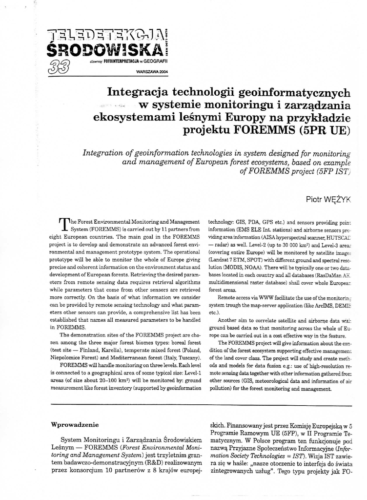 FOTOINTERPRETACJAwGEOGRAFll WARSZAWA2004 Integracja technologii geoinformatycznych w systemic monitoringu i zarz^dzania ekosystemami lesnymi Europy na przykladzie projektu FOREMMS (5PR UE) Integration of geoinformation technologies in system designed for monitoring and management of European forest ecosystems, based on example of FOREMMS project (5FP 1ST, Piotr W^ZYK T he Forest Environmental Monitoring and Management System (FOREMMS) is carried out by 11 partners from eight European countries. The main goal in the FOREMMS project is to develop and demonstrate an advanced forest environmental and management prototype system. The operational prototype will be able to monitor the whole of Europe giving precise and coherent information on the environment status and development of European forests. Retrieving the desired parameters from remote sensing data requires retrieval algorithms while parameters that come from other sensors are retrieved more correctly. On the basis of what information we consider can be provided by remote sensing technology and what parameters other sensors can provide, a comprehensive list has been established that names ail measured parameters to be handled in FOREMMS. The demonstration sites of the FOREMMS project are chosen among the three major forest biomes types: boreal forest (test site — Finland, Karelia), temperate mixed forest (Poland, Niepolomice Forest) and Mediterranean forest (Italy, Tuscany). FOREMMS will handle monitoring on three levels. Each level is connected to a geographical area of some typical size: Level-1 areas (of size about 20-100 km2) will be monitored by: ground measurement like forest inventory (supported by geoinformation Wprowadz enie t System Monitoringu i Zarzadzania Srodowiskiem Lesnym — FOREMMS (Forest Environmental Monitoring and Management System) jest trzyletnim grantembadawczo-demonstracyjnym (R&D) realizowanym przez konsorcjum 10 partnerow z 8 krajow europej- technology: GIS, PDA, GPS etc.) and sensors providing poin: information (EMS ELE Int. stations) and airborne sensors prcviding area information (AISAhyperspectral scanner, HUTSCAL — radar) as well. Level-2 (up to 30 000 knr) and Level-3 area: (covering entire Europe) will be monitored by satellite images (Landsat 7 ETM, SPOT) with different ground and spectral resolution (MODIS, NOAA). There will be typically one or two databases located in each country and all databases (RasDaMan AK. multidimensional raster database) shall cover whole Europear. forest areas. Remote access via WWW facilitate the use of the monitorin^ system trough the map-server application (like ArcIMS, DEMI£ etc.). Another aim to correlate satellite and airborne data with ground based data so that monitoring across the whole of Europe can be carried out in a cost effective way in the feature. The FOREMMS project will give information about the condition of the forest ecosystem supporting effective managemen: of the land cover class. The project will study and create methods and models for data fusion e.g.: use of high-resolution remote sensing data together with other information gathered from other sources (GIS, meteorological data and information of air pollution) for the forest monitoring and management. skich. Finansowany jest przez Komisj? Europejska w 5 Programie Ramowym UE (5FP), w II Programie Tematycznym. W Polsce program ten funkcjonuje pod nazw^ Przyjazne Spoleczenstwo Informacyjne (Information Society Technologies = 1ST). Wizja 1ST zawiera si§ w hasle: ,,nasze otoczenie to interfejs do swiata zintegrowanych usiug". Tego typu projekty jak FO- 76 REMMS, w zalozeniu maj^ umozliwiac dostej) obywateli UE do uslug 1ST w kazdym miejscu i dowolnym czasie, i w najbardziej naturalnej dla nich formie. Wizja promuje rozwoj zewnetrznej inteligencji (ambient intelligence), na ktorq sklada si§ wszechobecnosc uslug i ich przyjaznosc dla uzytkownika (Internet, 2001). Poj^cie ,,spoleczenstwo informacyjne" wprowadzone zostaio w 1963 roku w Japonii (jahoka shakai) i spopularyzowane 5 lat pozniej przez teoretyka mediow Kenichi Koyame. Termin ten okresla spoleczenstwo, dla ktorego informacja ~ traktowanajako specyficzne dobro niematerialne - staje si§ wazniejsza od dobr materialnych (Goban-Klas, Morbitzer, 1998). Wedlug innej defmicji o ,,spoleczeristwie informacyjnym" mozna mowic w momencie, kiedy giownym i pierwszoplanowym procesem ekonomicznym jest obrobka informacji, a stosunki spoleczne (np. kultura-media) i sluzby spoleczne (np. edukacja, edukacja) zostaly do tego dostosowane. W tak uksztaltowanej zbiorowosci informacja nabiera cech towaru, powodujac ksztaltowanie si§ rynku podazy i popytu na uslugi zwiazane z jej wytwarzaniem, przechowywaniem, przetwarzaniem, generowaniem, udost^pnianiem i prezentacjq. (Goban-Klas, Sienkiewicz, 1999). Jezeli informacja ta ma charakter przestrzenny, tj. dotyczy obiektow zwiazanych lokalizacja z okreslonym miejscem na Ziemi, i jest pozyskiwana i przetwarzanaprzy zastosowaniu nowcczesnychtechnologii (GIS, GPS, teledetekcja, IT etc.), to defmicja ta zaczyna pokrywac si§ z poj^ciem geomatyki (Wezyk 2000, Internet 1999). Rowniez w Polsce podejmowane sa juz pierwsze uchwaly okreslaja.ce za sluszne, iz we wspolczesnym spoteczenstwie informacyjnym, kazdy obywatel powinien miec zagwarantowany dostep do geoinformacji traktowanej jako dobro wspolne, bez utrudnien i ponoszenia nieuzasadnionych kosztow (PTIP, 2001). Cel projektu FOREMMS Glownym celem projektu FOREMMS jest zademonstrowanie Komisji Europejskiej dzialajacego prototypu, technologicznie zaawansowanego systemu geoinformatycznego pracuj^cego na trzech zroznicowanych poziomach: lokalnym, regionalnym (poszczegolnekraje) oraz ogolnoeuropejskim, na potrzeby monitoringu i zarza^dzania zasobami lesnymi. Zaiozenia metodyczne i technologiczne Zaklada si§, iz system FOREMMS majacy charakter zaawansowanej technologii, ma bye dost^pny a zarazem przyjazny w obsludze dla kazdego obywatela Europy i spelniac jego oczekiwania zg