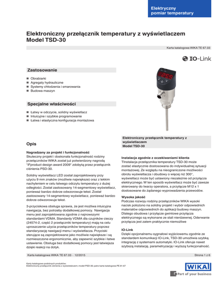 Elektryczny pomiar temperatury Elektroniczny przełącznik temperatury z wyświetlaczem Model TSD-30 Karta katalogowa WIKA TE 67.03 Zastosowanie ■■ Obrabiarki ■■ Agregaty hydrauliczne ■■ Systemy chłodzenia i smarowania ■■ Budowa maszyn Specjalne właściwości ■■ Łatwy w odczycie, solidny wyświetlacz ■■ Intuicyjne i szybkie programowanie ■■ Łatwa i elastyczna konfiguracja montażowa Opis Nagradzany za projekt i funkcjonalność Skuteczny projekt i doskonała funkcjonalność rodziny przełączników WIKA został już potwierdzony nagrodą "iFproduct design award 2009" zdobytą przez przełącznik ciśnienia PSD-30. Solidny wyświetlacz LED został zaprojektowany przy użyciu 9 mm znaków (możliwie największe) oraz z lekkim nachyleniem w celu łatwego odczytu temperatury z dużej odległości. Został zastosowany 14-segmentowy wyświetlacz, ponieważ bardzo dobrze odwzorowuje tekst. Został zastosowany 14-segmentowy wyświetlacz, ponieważ bardzo dobrze odwzorowuje tekst. 3-przyciskowa obsługa sprawia, że jest możliwa intuicyjna nawigacja, bez potrzeby dodatkowej pomocy. Nawigacja menu jest zaprojektowana zgodnie z najnowszymi standardami VDMA. Standardy VDMA dla czujników cieczy (24574-2, część 2 przełączniki temperatury) mają na celu uproszczenie użycia przełączników temperatury poprzez standaryzację nawigacji menu i wyświetlacza. Przyciski sterujące są zaprojektowane jako możliwie największe i są rozmieszczone ergonomicznie, aby zapewnić szybkie i łatwe ustawienie. Obsługa bez dodatkowej pomocy jest łatwiejsza dzięki reakcji na dotyk. Elektroniczny przełącznik temperatury z wyświetlaczem Model TSD-30 Instalacja zgodnie z oczekiwaniami klienta TInstalacja przełącznika temperatury TSD-30 może zostać elastycznie dostosowana do indywidualnej sytuacji montażowej. Ze względu na nieograniczone możliwości obrotu wyświetlacza i obudowy o więcej niż 300°, wyświetlacz może być ustawiony niezależnie od przyłącza elektrycznego. W ten sposób wyświetlacz może być zawsze skierowany do twarzy operatora, a przyłącze M12 x 1 dostosowane do żądanego wyprowadzenia przewodów. Wysoka jakość Podczas rozwoju rodziny przełączników WIKA wysoki nacisk położono na solidny projekt i wybór odpowiednich materiałów odpowiednich do aplikacji budowy maszyn. Dlatego obudowa i przyłącze gwintowe przyłącza elektrycznego są wykonane ze stali nierdzewnej. Oderwanie przyłącza jest zatem praktycznie niemożliwe IO-Link Dzięki opcjonalnemu sygnałowi wyjściowemu zgodnie ze standardem komunikacji IO-Link, TSD-30 umożliwia szybką integrację z systemami automatyki. IO-Link oferuje nawet szybszą instalację, parametryzację i wyższą funkcjonalność. Karta katalogowa WIKA TE 67.03 ∙ 12/2015 Karty katalogowe podobnych produktów: Elektroniczny przełącznik ciśnienia z wyświetalczem; model PSD-30; patrz karta katalogowa PE 81.67 Strona 1 z 6 Zakresy pomiarowe Wersje do wyboru Temperatura standard Opcja Regulacja dokładności ≤ 0.5 % zakresu °C -20 ... +80 Regulacja offset temperatury ±3 % zakresu -4 ... +248 Skalowanie Punkt 0 ... 25 % zakresu zero: Pełna 75 ... 100 % zakresu skala: -4 ... +176 -20 ... +120 1) 2) °F 1) Tylko dla przyłączy procesowych ze złączem uszczelniającym. 2) Należy przestrzegać warunków instalacji zawartych w “Warunkach pracy”.. Wyświetlacz 14-segmentowy LED, czerwony, 4-cyfrowy, rozmiar znaków 9 mm Wyświetlacz może być obracany elektronicznie o 180° Aktualizacja 200 ms Sygnał wyjściowy Wyjście przełączające Sygnał analogowy PNP SP1 SP2 - 4 ... 20 mA (3-przewodowy) Opcja 2 PNP - DC 0 ... 10 V (3-przewodowy) Opcja 3 PNP PNP - Opcja 4 PNP PNP 4 ... 20 mA (3-przewodowy) Opcja 5 PNP PNP DC 0 ... 10 V (3-przewodowy) Opcjonalnie dostępne także z wyjściem NPN zamiast PNP. IO-Link, rewizja 1.1 (opcja) IO-Link jest opcjonalnie dostępny dla wszystkich sygnałów wyjściowych. Z opcją IO-Link, wyjściem przełączającym SP1 jest zawsze PNP. Progi przełączające Punkt przełączania 1 i 2 są regulowane indywidualnie Funkcje przełączające Normalnie otwarte, normalnie zamknięte, funkcja okna i histerezy Dowolnie regulowane Napięcie przełączające Zasilanie - 1 V Prąd przełączający max. 250 mA ■■ z IO-Link: SP1 max. 100 mA SP2 max. 250 mA ■■ bez IO-Link: Strona 2 z 6 ≤ 0.5 kΩ > 10 kΩ Żywotność 100 milionów cykli przełączających Napięcie zasilające Wersje do wyboru Opcja 1 Obciążenie Sygnał analogowy 4 ... 20 mA: Sygnał analogowy DC 0 ... 10 V: Power supply U+ DC 15 ... 35 V Pobór prądu Wyjścia przełączające z ■■ Sygnał analogowy 4 ... 20 mA: 70 mA ■■ Sygnał analogowy DC 0 ... 10 V: 45 mA ■■ bez sygnału analogowego: 45 mA Opcja IO-Link powoduje odchylenia w poborze prądu Całkowity pobór prądu ■■ bez IO-Link: max. 600 mA włączając prąd przełączający ■■ z IO-Link: max. 450 mA włączając prąd przełączający Specyfikacje dokładności Sygnał analogowy ≤ ±0.5 % zakresu + błąd temperaturowy sensora Wyjście przełączające ≤ ±0.8 % zakresu + błąd temperaturowy sensora Wyświetlacz ≤ ±(0.8 % zakresu + błąd temperaturowy sensora) ±1 cyfra Sensor temperaturowy Dla °C: ±(0.15 K + 0.002 | t |) wg EN 60751 Dla °F: ± [1.8*(0.15 + 0.002 (t - 32) / 1.8)] | t | jest wartością temperatury w °C bez uwzględnienia znaku. Dokładność osiągana faktycznie jest znacząco zależna od sytuacji montażowej (głębokość zanurzenia, długość czujnika, warunki pracy). Zwłaszcza w przypadku dużych gradientów temperatury pomiędzy otoczeniem i medium. Karta katalogowa WIKA TE 67.03 ∙ 12/2015 Element pomiarowy Warunki pracy Model Pt1000, 2-przewodowy, DIN EN 60751 / klasa A Dopuszczalne zakresy temperatur Medium: patrz zakresy pomiarowe Otoczenia: -20 ... +80 °C (-4 ... 176 °F) 1) Przechowywania: -20 ... +80 °C (-4 ... 176 °F) Dłogość zanurzenia (F) Gwint równoległy 1) Dopusz