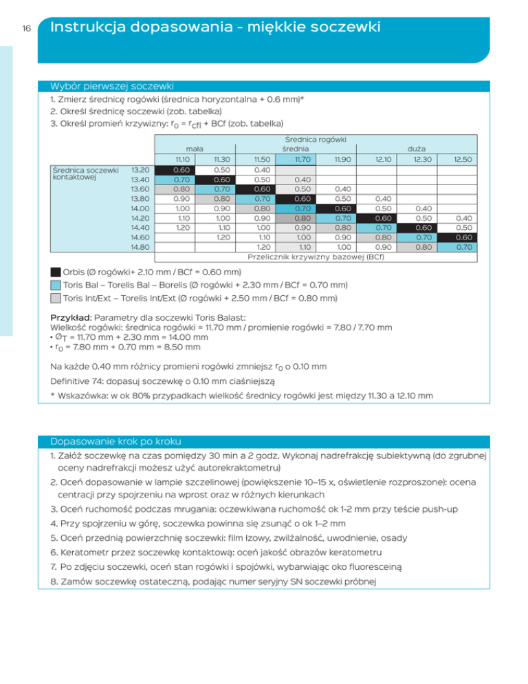 16 Instrukcja dopasowania - miękkie soczewki Wybór pierwszej soczewki 1.Zmierz średnicę rogówki (średnica horyzontalna + 0.6 mm)* 2. Określ średnicę soczewki (zob. tabelka) 3. Określ promień krzywizny: r0 = rcfl + BCf (zob. tabelka) Średnica rogówki mała 11.10 Średnica soczewki kontaktowej średnia 11.30 11.50 0.40 11.70 duża 11.90 12.10 12.30 12.50 13.20 0.60 0.50 13.40 0.70 0.60 0.50 13.60 0.80 0.70 0.60 0.50 13.80 0.90 0.80 0.70 0.60 0.50 14.00 1.00 0.90 0.80 0.70 0.60 0.50 14.20 1.10 1.00 0.90 0.80 0.70 0.60 0.50 14.40 1.20 1.10 1.00 0.90 0.80 0.70 0.60 0.50 1.20 1.10 1.00 0.90 0.80 0.70 0.60 1.20 1.10 1.00 0.90 0.80 0.70 14.60 14.80 0.40 0.40 0.40 0.40 0.40 Przelicznik krzywizny bazowej (BCf) Orbis (Ø rogówki+ 2.10 mm / BCf = 0.60 mm) Toris Bal – Torelis Bal – Borelis (Ø rogówki + 2.30 mm / BCf = 0.70 mm) Toris Int/Ext – Torelis Int/Ext (Ø rogówki + 2.50 mm / BCf = 0.80 mm) Przykład: Parametry dla soczewki Toris Balast: Wielkość rogówki: średnica rogówki = 11.70 mm / promienie rogówki = 7.80 / 7.70 mm • ØT = 11.70 mm + 2.30 mm = 14.00 mm • r0 = 7.80 mm + 0.70 mm = 8.50 mm Na każde 0.40 mm różnicy promieni rogówki zmniejsz r0 o 0.10 mm Definitive 74: dopasuj soczewkę o 0.10 mm ciaśniejszą *Wskazówka: w ok 80% przypadkach wielkość średnicy rogówki jest między 11.30 a 12.10 mm Dopasowanie krok po kroku 1.Załóż soczewkę na czas pomiędzy 30 min a 2 godz. Wykonaj nadrefrakcję subiektywną (do zgrubnej oceny nadrefrakcji możesz użyć autorekraktometru) 2.Oceń dopasowanie w lampie szczelinowej (powiększenie 10–15 x, oświetlenie rozproszone): ocena centracji przy spojrzeniu na wprost oraz w różnych kierunkach 3.Oceń ruchomość podczas mrugania: oczewkiwana ruchomość ok 1-2 mm przy teście push-up 4. Przy spojrzeniu w górę, soczewka powinna się zsunąć o ok 1–2 mm 5. Oceń przednią powierzchnię soczewki: film łzowy, zwilżalność, uwodnienie, osady 6. Keratometr przez soczewkę kontaktową: oceń jakość obrazów keratometru 7. Po zdjęciu soczewki, oceń stan rogówki i spojówki, wybarwiając oko fluoresceiną 8. Zamów soczewkę ostateczną, podając numer seryjny SN soczewki próbnej