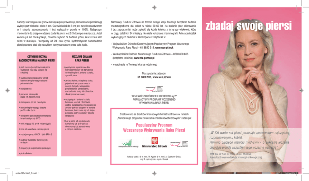 Kobiety, które regularnie (raz w miesiącu) przeprowadzają samobadanie piersi mogą wykryć guz wielkości około 1 cm. Guz wielkości do 2 cm jest zwykle nowotworem w I stopniu zaawansowania i jest wyleczalny prawie w 100%. Najlepszym momentem do przeprowadzenia badania piersi jest 2-3 dzień po miesiączce. Jeżeli kobieta już nie miesiączkuje, powinna wybrać na badanie jeden, zawsze ten sam dzień w miesiącu. Począwszy od 20. roku życia, systematyczne samobadanie piersi powinno stać się nawykiem kontynuowanym przez całe życie. CZYNNIKI RYZYKA ZACHOROWANIA NA RAKA PIERSI płeć żeńska (u mężczyzn rak piersi występuje 100 razy rzadziej niż u kobiet) występowanie raka piersi wśród krewnych w pierwszym stopniu pokrewieństwa bezdzietność pierwsza miesiączka przed 14. rokiem życia menopauza po 55. roku życia urodzenie pierwszego dziecka po 35. roku życia wieloletnie stosowanie hormonalnej terapii zastępczej (HTZ) wiek między 50. a 69. rokiem życia inne niż nowotwór choroby piersi MOŻLIWE OBJAWY RAKA PIERSI pojedyncze, ograniczone lub nieregularne guzy lub zgrubienia w obrębie piersi, zmiana kształtu, symetrii piersi zmiana koloru, ucieplenia skóry, pojawienie się poszerzonych naczyń żylnych, wciągnięcie, pofałdowanie, uwypuklenie, owrzodzenie skóry lub obraz tzw. skórki pomarańczowej wciągnięcie i zmiana kształtu brodawki, wyciek z brodawki, drobne owrzodzenia i nie gojące się zmiany pokryte strupem w obrębie brodawki, łuszczenie się lub linijne pęknięcia skóry w okolicy otoczki i brodawki ból w piersi lub jej okolicach, samoistny lub przy ucisku, obustronny lub jednostronny, o różnym nasileniu Narodowy Fundusz Zdrowia na terenie całego kraju finansuje bezpłatne badania mammograficzne dla kobiet w wieku 50-69 lat. Na badanie (bez skierowania i bez zaproszenia) może zgłosić się każda kobieta z tej grupy wiekowej, która w ciągu ostatnich 24 miesięcy nie miała wykonanej mammografii. Adresy jednostek wykonujących badania w Wielkopolsce znajdziesz w: - Wojewódzkim Ośrodku Koordynującym Populacyjny Program Wczesnego Wykrywania Raka Piersi – 61 8850 915, www.wco.pl/wok - Wielkopolskim Oddziale Narodowego Funduszu Zdrowia – 0800 800 805 (bezpłatna infolinia), www.nfz-poznan.pl - w gabinecie u Twojego lekarza rodzinnego Masz pytania zadzwoń: 61 8850 915, www.wco.pl/wok WOJEWÓDZKI OŚRODEK KOORDYNUJĄCY POPULACYJNY PROGRAM WCZESNEGO WYKRYWANIA RAKA PIERSI Zrealizowano ze środków finansowych Ministra Zdrowia w ramach „Narodowego programu zwalczania chorób nowotworowych” zadań pn: Populacyjny Program Wczesnego Wykrywania Raka Piersi mutacje w genach BRCA 1 i/lub BRCA 2 nadmiar tłuszczów zwierzęcych w diecie ekspozycja na promienie jonizujące picie alkoholu Autorzy ulotki: dr n. med. W. Kycler, dr n. med. A. Dyzmann-Sroka, mgr A. Jędrzejczak, mgr A. Kubiak ulotk-290x1602_3.indd 1 zbadaj swoje piersi „W XXI wieku rak piersi pozostaje nowotworem najczęściej rozpoznawanym u kobiet. Pomimo ciągłego rozwoju medycyny - o sukcesie leczenia decyduje przede wszystkim jego wczesne wykrycie”. prof. zw. dr hab. n. med. Paweł Murawa Konsultant wojewódzki ds. chirurgii onkologicznej 4/4/11 12:40:44 PM Zbadaj swoje piersi w pozycji stojącej i leżącej 6. Opuszkami palców uciskając pierś i jej okolice poszukuj zgrubień i guzków. Sprawdź, czy nie masz powiększonych węzłów chłonnych w okolicach pachowych. 1. Opuść ręce swobodnie. 5. Uciskając brodawkę, sprawdź, czy nie wydobywa się z niej wydzielina. 2. Unieś ręce do góry. przed lustrem Stań obserwując 3. Założ ręce za głowę. Nawet przy samodzielnym badaniu piersi nie lekceważ wizyt u lekarza. Wykrycie zmiany w piersi nie musi oznaczać obecności raka, ale zawsze wymaga konsultacji ze specjalistą. poszukuj zmian w kształcie, symetrii, zarysie piersi. 4. Oprzyj silnie ręce na biodrach, jednocześnie pochyl tułów do przodu. ulotk-290x1602_3.indd 2 Jeżeli niepokoi Ciebie twój stan zdrowia, masz pytania, pamiętaj: możesz w każdej chwili zgłosić się do lekarza onkologa – bez skierowania. 7. Powtórz badanie w pozycji leżącej. Powtórz czynności od 5 do 7 badając drugą pierś. 6-03/2011 swoje piersi, Badanie wykonujemy ruchami okrężnymi, półkolistymi i linijnymi, uciskając pierś płasko ułożonymi palcami. Powtórzenie tych samych ruchów w tym samym obszarze piersi podnosi stopień dokładności badania. Tę część badania proponujemy wykonać pod prysznicem lub przy użyciu kremu. Zbadać należy całą pierś. Pamiętajmy o zbadaniu piersi w kierunku pachy (górna część piersi położona na klatce piersiowej) i okolicy fałdu podpiersiowego. Badanie kończymy, badając dół pachowy w poszukiwaniu powiększonych węzłów chłonnych. 4/4/11 12:40:48 PM