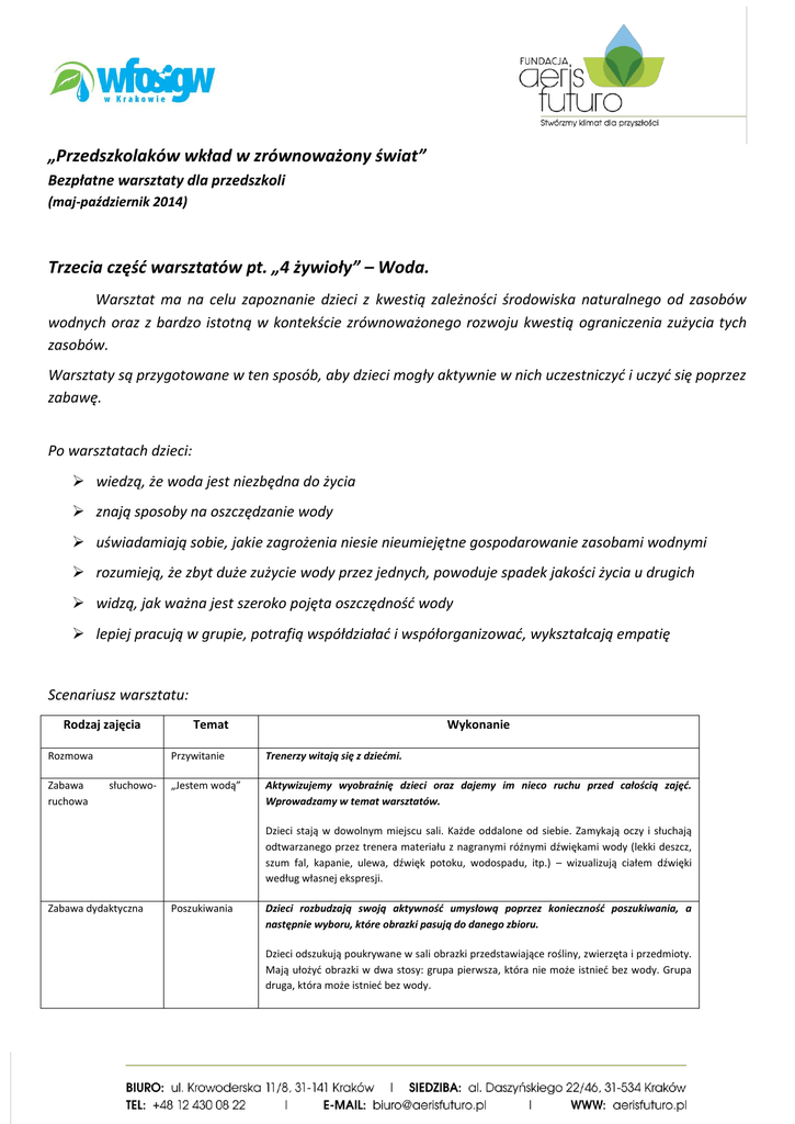 „Przedszkolaków wkład w zrównoważony świat” Bezpłatne warsztaty dla przedszkoli (maj-październik 2014) Trzecia część warsztatów pt. „4 żywioły” – Woda. Warsztat ma na celu zapoznanie dzieci z kwestią zależności środowiska naturalnego od zasobów wodnych oraz z bardzo istotną w kontekście zrównoważonego rozwoju kwestią ograniczenia zużycia tych zasobów. Warsztaty są przygotowane w ten sposób, aby dzieci mogły aktywnie w nich uczestniczyć i uczyć się poprzez zabawę. Po warsztatach dzieci: wiedzą, że woda jest niezbędna do życia znają sposoby na oszczędzanie wody uświadamiają sobie, jakie zagrożenia niesie nieumiejętne gospodarowanie zasobami wodnymi rozumieją, że zbyt duże zużycie wody przez jednych, powoduje spadek jakości życia u drugich widzą, jak ważna jest szeroko pojęta oszczędność wody lepiej pracują w grupie, potrafią współdziałać i współorganizować, wykształcają empatię Scenariusz warsztatu: Rodzaj zajęcia Rozmowa Zabawa ruchowa słuchowo- Temat Wykonanie Przywitanie Trenerzy witają się z dziećmi. „Jestem wodą” Aktywizujemy wyobraźnię dzieci oraz dajemy im nieco ruchu przed całością zajęć. Wprowadzamy w temat warsztatów. Dzieci stają w dowolnym miejscu sali. Każde oddalone od siebie. Zamykają oczy i słuchają odtwarzanego przez trenera materiału z nagranymi różnymi dźwiękami wody (lekki deszcz, szum fal, kapanie, ulewa, dźwięk potoku, wodospadu, itp.) – wizualizują ciałem dźwięki według własnej ekspresji. Zabawa dydaktyczna Poszukiwania Dzieci rozbudzają swoją aktywność umysłową poprzez konieczność poszukiwania, a następnie wyboru, które obrazki pasują do danego zbioru. Dzieci odszukują poukrywane w sali obrazki przedstawiające rośliny, zwierzęta i przedmioty. Mają ułożyć obrazki w dwa stosy: grupa pierwsza, która nie może istnieć bez wody. Grupa druga, która może istnieć bez wody. Rozmowa Ziemia – planeta wody Dzieci uświadamiają sobie, że nasza planeta i życie na niej są zależne od wody, a budowa organizmów żywych opiera się w głównej mierze na niej. Trener pyta, czym jest woda, w jakich stanach skupienia występuje oraz co się stanie, jeśli jej zabraknie. Dzieci oglądają mapę świata, gdzie większość zajmują oceany. Uświadamiają sobie, że wszystkie organizmy żywe są zależne od wody i w większości się z niej składają. Trener zadaje pytanie, jakie są największe zagrożenia dla wody i co się dzieje z wodą skażoną – czy może być przydatna dla życia? Dzieci dochodzą do wniosku, że woda ta może być przydatna, jednak niesie ze sobą niebezpieczeństwa. Zabawa dydaktyczna „Ile wody w nas?” Dzieci uświadamiają sobie, jak bardzo jesteśmy uzależnieni od wody. „Wybuduj swój dom” Zadanie pierwsze: trener wybiera chętną osobę, która staje na środku. Pyta o jej wagę. Obok stoi kilka baniaków 5-litrowych z wodą oraz kilka butelek. Dzieci próbują zgadnąć, ile wody jest w ochotniku ustawiając koło niego odpowiednie naczynia z wodą. Powtarzamy ćwiczenie – ochotnikiem jest trener. Zadajemy pytanie, czy taka woda może być brudna? Drugie zadanie: dzielimy dzieci na 3 grupy. Każda grupa ma do wybudowania dom, gdzie chciałaby żyć. Trzeba wybrać najlepszą do życia okolicę. Na znak dany przez trenera, dzieci poszukują ukrytych w sali obrazków przedstawiających jeziora, rzeki, wodospady, pustynie, lasy, góry, miasta, wsie. Każda grupa uzasadnia potem swój wybór – niektórzy mogą dojść do wniosku, że zabrakło dla nich wody. Rysowanie „Mój dom” idealny Chwila odpoczynku i relaksu dla dzieci. Potem krótkie omówienie rysunków. Dzieci rysują swój obraz idealnie położonego domu. Zabawa ruchowa „Raz, dwa, trzy – rybak patrzy!” Krótka zabawa ruchowa ma wprowadzić w dalszy etap zajęć i rozbudzić dzieci. Wszystkie dzieci udają, że są rybami w jeziorze. Wizualizują ciałem ruch płynącej ryby – nie wolno biegać. Trener jest rybakiem, stoi w drugim końcu sali. Dzieci mają za zadanie do niego podejść w chwili, gdy ten nie patrzy. Odmiana popularnej zabawy „1,2,3 – Baba Jaga patrzy” Rozmowa „Sposób wodę na Dzieci zastanawiają się, w jaki sposób można sprawić, aby wody nie brakowało. Pod kierunkiem trenera dzieci wymyślają oczyszczanie wody, odsalanie, zbieranie deszczówki. Na końcu koncentrujemy się na oszczędności wody – jej mniejszym zużyciu. Dzieci wymyślają, co można zrobić w domu, aby oszczędzać wodę. Zabawa dydaktyczna „Uratuj kolegę” Dzieci uświadamiają sobie, że na świecie jest mnóstwo ludzi, bez dostępu do wody. Dostrzegają, jak skuteczne jest oszczędzanie wody. Wykorzystujemy napełnione wodą baniaki i butelki. Podział dzieci na 2 grupy: Pustynia i Woda. Druga grupa jest w posiadaniu baniaków i butelek z wodą. Grupy stoją naprzeciwko siebie. Dziecko z grupy Wody wskazane przez trenera wymyśla sposób oszczędzania (staramy się, aby pomysły się nie powtarzały). Jeśli się to uda, zabiera baniak z wodą i przekazuje go jednej osobie z grupy Pustynia. Ta zmienia miejsce i dołącza do drugiej grupy. Staramy się „uratować” wszystkie dzieci z grupy Pustynia – niektóre pomysły mogą być promowane uratowaniem dwóch osób. Następnie zamiana grup. Ewaluacja Rozmowa podsumowująca Podczas rozmowy staramy się przypomnieć dzieciom, o czym mówiliśmy. Dzieci aktywnie uczestniczą i odpowiadają na zadane przez trenera pytania. Dzieci przypominają czego się nauczyły.