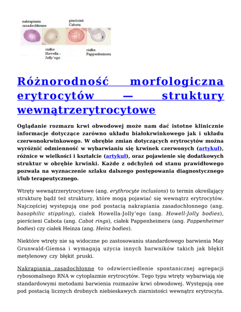 Różnorodność morfologiczna erytrocytów — struktury wewnątrzerytrocytowe Oglądanie rozmazu krwi obwodowej może nam dać istotne klinicznie informacje dotyczące zarówno układu białokrwinkowego jak i układu czerwonokrwinkowego. W obrębie zmian dotyczących erytrocytów można wyróżnić odmienność w wybarwianiu się krwinek czerwonych (artykuł), różnice w wielkości i kształcie (artykuł), oraz pojawienie się dodatkowych struktur w obrębie krwinki. Każde z odchyleń od stanu prawidłowego pozwala na wyznaczenie szlaku dalszego postępowania diagnostycznego i/lub terapeutycznego. Wtręty wewnątrzerytrocytowe (ang. erythrocyte inclusions) to termin określający strukturę bądź też struktury, które mogą pojawiać się wewnątrz erytrocytów. Najczęściej występują one pod postacią nakrapiania zasadochłonnego (ang. basophilic stippling), ciałek Howella-Jolly’ego (ang. Howell-Jolly bodies), pierścieni Cabota (ang. Cabot rings), ciałek Pappenheimera (ang. Pappenheimer bodies) czy ciałek Heinza (ang. Heinz bodies). Niektóre wtręty nie są widoczne po zastosowaniu standardowego barwienia May Grunwald-Giemsa i wymagają użycia innych barwników takich jak błękit metylenowy czy błękit pruski. Nakrapiania zasadochłonne to odzwierciedlenie spontanicznej agregacji rybosomalnego RNA w cytoplazmie erytrocytów. Tego typu wtręty wybarwiają się standardowymi metodami barwienia rozmazów krwi obwodowej. Występują one pod postacią licznych drobnych niebieskawych ziarnistości wewnątrz erytrocyta. Często obserwuje się nakrapianie zasadochłonne w polichromatycznych i normochromatycznych makrocytach. Pojawiają się one w niedokrwistości z zaburzoną produkcją hemoglobiny, niedokrwistości megaloblastycznej, przewlekłej niedokrwistości, niedokrwistości syderoblastycznej, talasemii, w ostrych infekcjach bakteryjnych, zatruciu lekami, alkoholizmie oraz w stanach zatrucia ołowiem. W tym ostatnim przypadku pojawienie się nakrapiania wynika z negatywnego wpływu zatrucia ołowiem na 5’nukleotydazę, odpowiedzialną za degradację RNA [1]. Niektóre badania wskazują także na związek chronicznego przyjmowania opium z pojawieniem się nakrapiania zasadochłonnego w erytrocytach. Prawdopodobnym jest, że zjawisko wiąże się z zanieczyszczeniem ołowiem [2]. Ciałka Howella – Jolly’ego to niewielkie, zwykle o średnicy 0,5 μm, różowoniebieskie pozostałości DNA, występujące w krwince czerwonej zazwyczaj pojedynczo. Tego typu wtręty wybarwiają się standardowymi metodami barwienia rozmazów krwi obwodowej. Spotykane są w niedokrwistościach hemolitycznych i megaloblastycznych, w chorobach śledziony oraz u osób po splenektomii Po usunięciu śledziony poszukuje się ciałek Howella-Jolly’ego we krwinkach czerwonych pacjentów, ponieważ ich brak w tym przypadku świadczy o istnieniu dodatkowej śledziony i ma istotny wpływ na dalsze decyzje terapeutyczne [1]. Część badań jednak dowodzi niedostatecznej skuteczności zastosowania obserwacji pojawiania się ciałek Howella-Jolly’ego w ocenie funkcji śledziony. Za najlepszą metodę uznaje się scyntygrafię, aczkolwiek nie jest ona odpowiednia do stosowania na dużą skalę [4]. Inni autorzy proponują wykorzystanie cytometrii przepływowej do oceny ilościowej ciałek Howella-Jolly’ego jako metody oceny funkcji śledziony w terapii u dzieci z anemią sierpowatą [5]. Pierścienie Cabota to wtręty erytrocytarne o kształcie pętli lub ósemki. Powstają one jako pozostałość wrzeciona podziałowego w przypadku nieprawidłowej erytropoezy. Pojawiają się w niedokrwistości megaloblastycznej oraz w zatruciu ołowiem [1]. Tego typu wtręty wybarwiają się w barwieniu MayGrunwald-Giemsa. Badania wykazały obecność w tej strukturze histonów bogatych w argininę oraz żelazo nie pochodzące z hemoglobiny, co wskazuje na fakt, iż ich powstawanie może częściowo wynikać z niepawidłowości metabolicznych w tym zakresie i tym samym tłumaczyć ich występowanie w anemii złośliwej [7]. Ciałka Heinza to struktury powstałe ze zdenaturowanej hemoglobiny i białek zrębu erytrocytu. Zaobserwować je można w mikroskopie świetlnym tylko w wypadku barwienia fioletem krystalicznym, fioletem metylu oraz po inkubacji z substancjami ulteniającymi (acetylofenylohydrazyna). Pojawienie się tych wtrętów erytrocytarnych zaobserwowano w talasemii, w niedokrwistości toksycznej, po splenektomii, w met hemoglobinemii, przy niedoborze dehydrogenazy glukozo-6fosforanowej erytrocytów (G-6-PD) oraz w przypadku pojawiania się niestabilnych hemoglobin [1]. Jako jedna z niestabilnych hemoglobin, hemoglobina Hammersmith’a stała się przedmiotem badań, które ujawniły związek pojawiania się ciałek Heinza w takich przypadkach [9]. Ciałka Heinza pojawiają się także w anemii sierpowatokomórkowej jako wynik redukcji hemoglobiny S. Jest to problematyczne zagadnienie, ponieważ w krwinkach sierpowatych reakcje oksydoredukcyjne mogą stać się czynnikiem sprawczym procesu hemolitycznego [8]. Ciałka Pappenheimera to ciemne, występujące zwykle mnogo, położone obwodowo ziarnistości. Są to agregaty ferrytyny, lizosomów, rybosomów i zdegenerowanych mitochondriów [1]. Ciałka te pojawiają się we krwi alkoholików. Odnotowano zniknięcie tych wtrętów podczas absencji alkoholowej [3]. Zaobserwowano także, że u pacjentów ze splenomegalią i chorobą Hb C obok ciałek Howella-Jolly’ego pojawiają się ciałka Pappenheimera [6]. Wtręty wewnątrzerytrocytowe to termin określający strukturę bądź też struktury, które mogą pojawiać się wewnątrz erytrocytów Źródło: opracowanie własne Pojawienie się w rozmazie krwi obwodowej wtrętów wewnątrz erytrocytów jest mniej lub bardziej specyficznym markerem diagnostycznym. Wiadomo jednak, że ich obecność świadczy o anomaliach zdrowotnych i w takim przypadku powinniśmy poszukiwać źródła obserwowanych zaburzeń