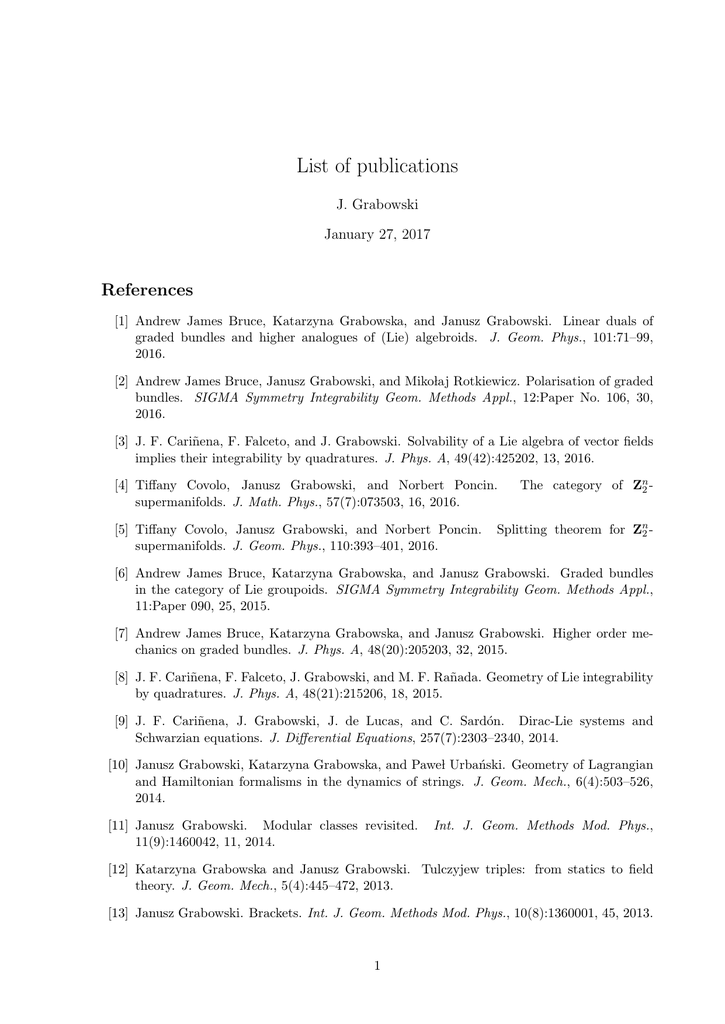 List of publications J. Grabowski January 27, 2017 References [1] Andrew James Bruce, Katarzyna Grabowska, and Janusz Grabowski. Linear duals of graded bundles and higher analogues of (Lie) algebroids. J. Geom. Phys., 101:71–99, 2016. [2] Andrew James Bruce, Janusz Grabowski, and Mikolaj Rotkiewicz. Polarisation of graded bundles. SIGMA Symmetry Integrability Geom. Methods Appl., 12:Paper No. 106, 30, 2016. [3] J. F. Cariñena, F. Falceto, and J. Grabowski. Solvability of a Lie algebra of vector fields implies their integrability by quadratures. J. Phys. A, 49(42):425202, 13, 2016. [4] Tiffany Covolo, Janusz Grabowski, and Norbert Poncin. supermanifolds. J. Math. Phys., 57(7):073503, 16, 2016. [5] Tiffany Covolo, Janusz Grabowski, and Norbert Poncin. supermanifolds. J. Geom. Phys., 110:393–401, 2016. The category of Zn2 - Splitting theorem for Zn2 - [6] Andrew James Bruce, Katarzyna Grabowska, and Janusz Grabowski. Graded bundles in the category of Lie groupoids. SIGMA Symmetry Integrability Geom. Methods Appl., 11:Paper 090, 25, 2015. [7] Andrew James Bruce, Katarzyna Grabowska, and Janusz Grabowski. Higher order mechanics on graded bundles. J. Phys. A, 48(20):205203, 32, 2015. [8] J. F. Cariñena, F. Falceto, J. Grabowski, and M. F. Rañada. Geometry of Lie integrability by quadratures. J. Phys. A, 48(21):215206, 18, 2015. [9] J. F. Cariñena, J. Grabowski, J. de Lucas, and C. Sardón. Dirac-Lie systems and Schwarzian equations. J. Differential Equations, 257(7):2303–2340, 2014. [10] Janusz Grabowski, Katarzyna Grabowska, and Pawel Urbański. Geometry of Lagrangian and Hamiltonian formalisms in the dynamics of strings. J. Geom. Mech., 6(4):503–526, 2014. [11] Janusz Grabowski. Modular classes revisited. 11(9):1460042, 11, 2014. Int. J. Geom. Methods Mod. Phys., [12] Katarzyna Grabowska and Janusz Grabowski. Tulczyjew triples: from statics to field theory. J. Geom. Mech., 5(4):445–472, 2013. [13] Janusz Grabowski. Brackets. Int. J. Geom. Methods Mod. Phys., 10(8):1360001, 45, 2013. 1 [14] Janusz Grabowski and Javier de Lucas. Mixed superposition rules and the Riccati hierarchy. J. Differential Equations, 254(1):179–198, 2013. [15] Janusz Grabowski. Graded contact manifolds and contact Courant algebroids. J. Geom. Phys., 68:27–58, 2013. [16] Janusz Grabowski, Alberto Ibort, Marek Kuś, and Giuseppe Marmo. Convex bodies of states and maps. J. Phys. A, 46(42):425301, 18, 2013. [17] Janusz Grabowski, David Khudaverdyan, and Norbert Poncin. The supergeometry of Loday algebroids. J. Geom. Mech., 5(2):185–213, 2013. [18] Janusz Grabowski, Alexei Kotov, and Norbert Poncin. Lie superalgebras of differential operators. J. Lie Theory, 23(1):35–54, 2013. [19] J. F. Cariñena, J. Grabowski, and J. de Lucas. Superposition rules for higher order systems and their applications. J. Phys. A, 45(18):185202, 26, 2012. [20] Janusz Grabowski, Marek Kuś, and Giuseppe Marmo. Segre maps and entanglement for multipartite systems of indistinguishable particles. J. Phys. A, 45(10):105301, 17, 2012. [21] Janusz Grabowski. Modular classes of skew algebroid relations. Transform. Groups, 17(4):989–1010, 2012. [22] Janusz Grabowski and Mikolaj Rotkiewicz. Graded bundles and homogeneity structures. J. Geom. Phys., 62(1):21–36, 2012. [23] Katarzyna Grabowska and Janusz Grabowski. Dirac algebroids in Lagrangian and Hamiltonian mechanics. J. Geom. Phys., 61(11):2233–2253, 2011. [24] Janusz Grabowski and Michal Jóźwikowski. Pontryagin maximum principle on almost Lie algebroids. SIAM J. Control Optim., 49(3):1306–1357, 2011. [25] Janusz Grabowski, Alexei Kotov, and Norbert Poncin. Geometric structures encoded in the Lie structure of an Atiyah algebroid. Transform. Groups, 16(1):137–160, 2011. [26] Janusz Grabowski, Marek Kuś, and Giuseppe Marmo. Entanglement for multipartite systems of indistinguishable particles. J. Phys. A, 44(17):175302, 21, 2011. [27] Remigiusz Augusiak, Janusz Grabowski, Marek Kuś, and Maciej Lewenstein. Searching for extremal ppt entangled states. Optics Communications, 283(5):805–813, 2010. [28] José F. Cariñena, Janusz Grabowski, and Javier de Lucas. Lie families: theory and applications. J. Phys. A, 43(30):305201, 18, 2010. [29] Janusz Grabowski, Alexei Kotov, and Norbert Poncin. The Lie superalgebra of a supermanifold. J. Lie Theory, 20(4):739–749, 2010. [30] Janusz Grabowski, Pawel Urbański, and Mikolaj Rotkiewicz. Double affine bundles. J. Geom. Phys., 60(4):581–598, 2010. [31] José F. Cariñena, Janusz Grabowski, and Javier de Lucas. Quasi-Lie schemes: theory and applications. J. Phys. A, 42(33):335206, 20, 2009. [32] J. Grabowski, M. de León, J. C. Marrero, and D. Martı́n de Diego. Nonholonomic constraints: a new viewpoint. J. Math. Phys., 50(1):013520, 17, 2009. 2 [33] Janusz Grabowski, Marek Kuś, and Giuseppe Marmo. Wigner’s theorem and the geometry of extreme positive maps. J. Phys. A, 42(34):345301, 20, 2009. [34] Janusz Grabowski and Mikolaj Rotkiewicz. Higher vector bundles and multi-graded symplectic manifolds. J. Geom. Phys., 59(9):1285–1305, 2009. [35] Katarzyna Grabowska, Janusz Grabowski, and Pawel Urbański. The Schrödinger operator as a generalized Laplacian. J. Phys. A, 41(14):145204, 20, 2008. [36] Katarzyna Grabowska and Janusz Grabowski. Variational calculus with constraints on general algebroids. J. Phys. A, 41(17):175204, 25, 2008. [37] José F. Cariñena, Janusz Grabowski, and Giuseppe Marmo. Superposition rules, Lie theorem, and partial differential equations. Rep. Math. Phys., 60(2):237–258, 2007. [38] Katarzyna Grabowska, Janusz Grabowski, and Pawel Urbański. AV-differential geometry: Euler-Lagrange equations. J. Geom. Phys., 57(10):1984–1998, 2007. [39] J. Grabowski, D. Iglesias, J. C. Marrero, E. Padrón, and P. Urbański. Jacobi structures on affine bundles. Acta Math. Sin. (Engl. Ser.), 23(5):769–788, 2007. [40] Janusz Grabowski, Marek Kuś, and Giuseppe Marmo. On the relation between states and maps in infini