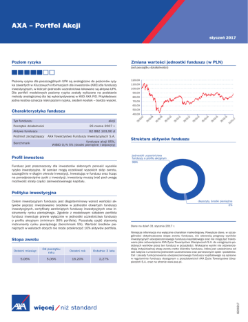 AXA – Portfel Akcji styczeń 2017 Poziom ryzyka Zmiana wartości jednostki funduszu (w PLN) (od początku działalności) Poziomy ryzyka dla poszczególnych UFK są analogiczne do poziomów ryzyka zawartych w Kluczowych informacjach dla inwestorów (KIID) dla funduszy inwestycyjnych, w których jednostki uczestnictwa lokowane są aktywa UFK. Dla portfeli modelowych poziomy ryzyka zostały wyliczone na podstawie metody analogicznej dla tej wykorzystywanej w KIID AXA FIO. Przykładowo: jedna kostka oznacza niski poziom ryzyka, siedem kostek – bardzo wysoki. 120,00 110,00 100,00 90,00 80,00 70,00 60,00 Charakterystyka funduszu 50,00 Początek działalności 26 marca 2007 r. Aktywa funduszu 62 882 103,90 zł Podmiot zarządzający AXA Towarzystwo Funduszy Inwestycyjnych S.A. fundusze akcji 95%, WIBID O/N 5% (środki pieniężne i depozyty) Benchmark /1 7 /1 5 /1 5 /1 4 31 /0 1 /0 3 26 /0 3 26 /0 3 /1 3 26 /0 3 26 /1 2 /0 3 /1 1 /0 3 26 26 /1 0 /0 9 /0 3 26 /0 3 26 /0 8 /0 3 26 akcji 26 Typ funduszu /0 3 /0 7 40,00 Struktura aktywów funduszu jednostki uczestnictwa funduszy o profilu akcyjnym 98% Profil inwestora Fundusz jest przeznaczony dla inwestorów skłonnych ponosić wysokie ryzyko inwestycyjne. W zamian mogą oczekiwać wysokich stóp zwrotu, szczególnie w długim okresie inwestycji. Inwestując w fundusz oraz licząc na ponadprzeciętne zyski z inwestycji, inwestorzy muszą brać pod uwagę możliwość straty części zainwestowanego kapitału. Polityka inwestycyjna Stopa zwrotu Ostatni miesiąc Od początku roku Ostatni rok Ostatnie 3 lata 5,06% 5,06% 16,20% 2,27% depozyty, środki pieniężne 2% Dane na dzień 31 stycznia 2017 r. Niniejsza informacja ma wyłącznie charakter marketingowy. Powyższe dane, w szczególności dotychczasowa stopa zwrotu funduszu, nie stanowią prognozy wyników inwestycyjnych ubezpieczeniowego funduszu kapitałowego oraz nie mogą być traktowane jako zobowiązanie AXA Życie Towarzystwa Ubezpieczeń S.A. do osiągnięcia podobnych wyników przez ten fundusz w przyszłości. Wskazane wyniki nie odzwierciedlają indywidualnej stopy zwrotu netto klientów funduszu, która jest uzależniona od dat nabycia i umorzenia jednostek uczestnictwa oraz poniesionych opłat i podatków. Cel i zasady funkcjonowania ubezpieczeniowego funduszu kapitałowego są opisane w regulaminie funduszu dostępnym u przedstawicieli AXA Życie Towarzystwa Ubezpieczeń S.A. oraz na stronie www.axa.pl. 8220217 Celem inwestycyjnym funduszu jest długoterminowy wzrost wartości aktywów poprzez inwestowanie środków w jednostki otwartych funduszy inwestycyjnych, certyfikaty zamkniętych funduszy inwestycyjnych oraz instrumenty rynku pieniężnego. Zgodnie z modelowym składem portfela fundusz inwestuje prawie wyłącznie w jednostki uczestnictwa funduszy o profilu akcyjnym (minimum 90% portfela). Pozostałą część stanowią instrumenty rynku pieniężnego (benchmark 5%). Wartość środków pieniężnych w walutach obcych nie może przekroczyć 10% aktywów portfela.