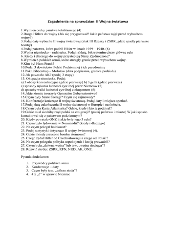 Zagadnienia na sprawdzian II Wojna światowa 1.Wymień cechy państwa totalitarnego (4) 2.Droga Hitlera do wojny (Jak się przygotował? Jakie państwa zajął przed wybuchem wojny?) 3.Podaj datę wybuchu II wojny światowej (atak III Rzeszy i ZSRR, gdzie spadły pierwsze bomby) 4.Podaj państwa, które podbił Hitler w latach 1939 – 1940. (6) 5.Wojna niemiecko – radziecka. Podaj: a)datę, b)kryptonim c)trzy główne cele 6. Kiedy i dlaczego do wojny przystępują Stany Zjednoczone? 8.Wymień 6 polskich armii, które strzegły granic przed wybuchem wojny. 9.Kim był Hans Frank? 10.Podaj 3 dowódców Polski Podziemnej i ich pseudonimy 11.Pakt Ribbentrop – Mołotow (data podpisania, granica podziału) 12.Jak powstało AK? (podaj 3 etapy) 13. Okupacja niemiecka. Podaj: a) 3 obozy koncentracyjne (gdzie pierwszy) b) 3 getta (gdzie pierwsze) c) sposoby nękania ludności cywilnej przez Niemców (5) d) sposoby walki ludności cywilnej z okupantem (5) 14.Jakie ziemie tworzyły Generalne Gubernatorstwo? 15.Czym były Szare Szeregi? Czym się zajmowały? 16. Konferencje kończące II wojnę światową. Podaj daty i miejsca spotkań. 17.Podaj datę zakończenia II wojny światowej w Europie i na świecie. 18.Czym była Karta Atlantycka? Gdzie, kiedy i kto ją podpisał? 19.Gdzie miał siedzibę rząd polski na emigracji? (podaj państwo i miasto) W jaki sposób kontaktował się z państwem podziemnym? 20. Kiedy powstało ONZ i jakie były jego 3 cele? 21. Czym było lądowanie w Normandii? (kiedy i dlaczego) 22. Na czym polegał holokaust? 23. Podaj statystyki dotyczące II wojny światowej (4). 24. Gdzie i kiedy zrzucono bomby atomowe? 25. Czego żądał Hitler od Czechosłowacji a czego od Polski? 26. Na czym polegała polityka uspokojenia i kto ją prowadził? 27. Czym była „dziwna wojna” lub tzw. „wojna siedząca”? 28. Rozwiń skróty: ZSRR, RFN, NRD, AK, ONZ. Pytania dodatkowe: 1. 2. 3. 4. Przywódcy polskich armii Konferencje – daty Czym były tzw. „wilcze stada”? 4 x „d” w sprawie Niemiec