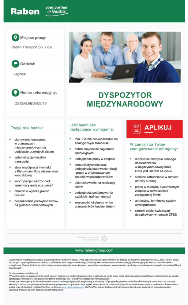 Miejsce pracy: Raben Transport Sp. z o.o. Oddział: Legnica Numer referencyjny: DS/GAD/BW/09/16 Twoją rolą będzie: DYSPOZYTOR MIĘDZYNARODOWY Jeśli spełniasz następujące wymagania: planowanie transportu w przewozach międzynarodowych na podstawie przyjętych zleceń min. 2 letnie doświadczenie na analogicznym stanowisku optymalizacja kosztów transportu umiejętność pracy w zespole dobra znajomość zagadnień spedycyjnych stała współpraca i kontakt z Kierowcami floty własnej oraz kontraktowej komunikatywność oraz umiejętność budowania relacji i pracy w zróżnicowanym zespole współpracowników koordynacja i nadzór nad terminową realizacją zleceń ukierunkowanie na realizację celów dbałość o wysoką jakość dostaw umiejętność podejmowania szybkich i trafnych decyzji poszukiwanie podwykonawców na giełdach transportowych znajomość lokalnego rynku przewoźników będzie atutem APLIKUJ W zamian za Twoje zaangażowanie oferujemy: możliwość zdobycia cennego doświadczenia w międzynarodowej firmie, która jest liderem na rynku stabilne zatrudnienie w ramach umowy o pracę pracę w młodym, dynamicznym zespole w nowocześnie zarządzanej firmie atrakcyjny, terminowy system wynagradzania szeroki pakiet świadczeń dodatkowych w ramach ZFŚS www.raben-group.com Grupa Raben respektuje procedury Equal Opportunity Employer (EOE). Przy wyborze i awansie pracowników nie stosuje się kryteriów dotyczących wieku, rasy, koloru skóry, płci (w tym ciąży i wychowania dziecka), pochodzenia etnicznego i narodowego, orientacji seksualnej i stanu zdrowia; uwzględniane są jedynie wiedza, doświadczenie i umiejętności. Zasady te dotyczą także nawiązania i rozwiązania stosunku pracy, warunków zatrudnienia, awansowania oraz dostępu do szkoleń w celu podnoszenia kwalifikacji zawodowych. Prosimy o dołączenie klauzuli: „Wyrażam zgodę na przetwarzanie moich danych osobowych, podanych przeze mnie w aplikacji na ofertę pracy przez spółki powiązane kapitałowo i organizacyjnie ze spółką ogłaszającą rekrutację w celu przeprowadzenia aktualnego jak i przyszłych postępowań rekrutacyjnych.” Niniejszym informujemy, iż administratorem danych osobowych jest spółka ogłaszająca rekrutację. W przypadku przetwarzania Pana/Pani danych osobowych na potrzeby aktualnych jak i przyszłych procesów rekrutacyjnych prowadzonych przez inne spółki, informujemy, że dana spółka będzie administratorem danych osobowych. Pełne nazwy spółek oraz ich siedziby znajdzie Pan/Pani na stronie www.raben-group.com. Ma Pani/Pan prawo dostępu do treści swoich danych oraz żądania ich poprawiania albo usunięcia. Podanie danych osobowych jest dobrowolne.