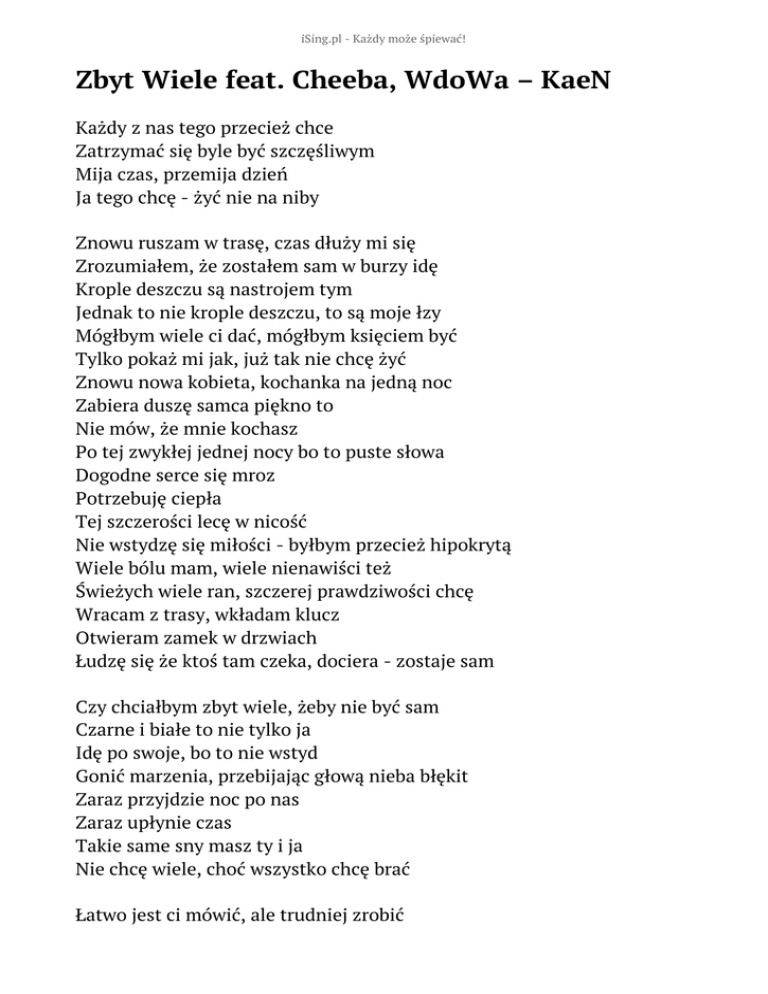 iSing.pl - Każdy może śpiewać! Zbyt Wiele feat. Cheeba, WdoWa – KaeN Każdy z nas tego przecież chce Zatrzymać się byle być szczęśliwym Mija czas, przemija dzień Ja tego chcę - żyć nie na niby Znowu ruszam w trasę, czas dłuży mi się Zrozumiałem, że zostałem sam w burzy idę Krople deszczu są nastrojem tym Jednak to nie krople deszczu, to są moje łzy Mógłbym wiele ci dać, mógłbym księciem być Tylko pokaż mi jak, już tak nie chcę żyć Znowu nowa kobieta, kochanka na jedną noc Zabiera duszę samca piękno to Nie mów, że mnie kochasz Po tej zwykłej jednej nocy bo to puste słowa Dogodne serce się mroz Potrzebuję ciepła Tej szczerości lecę w nicość Nie wstydzę się miłości - byłbym przecież hipokrytą Wiele bólu mam, wiele nienawiści też Świeżych wiele ran, szczerej prawdziwości chcę Wracam z trasy, wkładam klucz Otwieram zamek w drzwiach Łudzę się że ktoś tam czeka, dociera - zostaje sam Czy chciałbym zbyt wiele, żeby nie być sam Czarne i białe to nie tylko ja Idę po swoje, bo to nie wstyd Gonić marzenia, przebijając głową nieba błękit Zaraz przyjdzie noc po nas Zaraz upłynie czas Takie same sny masz ty i ja Nie chcę wiele, choć wszystko chcę brać Łatwo jest ci mówić, ale trudniej zrobić Jeszcze trudniej utrzymać za ogon dwie sroki Jak nie umiesz się obronić pokusy się nie czają A od żadnej nie usłyszysz słodkiego dobranoc Podejmujesz wybór, ponosisz konsekwencje Czemu znów to robisz, skoro tak bardzo nie chcesz? Do siebie miej pretensje, Boże to takie męskie Chcesz ciepła w domu jednocześnie ognia na mieście? Pusta przestrzeń przypomni ci o błędach Chciałeś ognia to z piekła ogień cię dosięga I nie rozgrzeje serca jak prawdziwe emocje Bo znowu wyszło źle, a znowu chciałeś dobrze Mogłabym ci wiele dać, to za czym tęsknisz Mogłabym za tobą stać, uczynić wielkim Gdybyś naprawdę chciał, powiedział to głośno A karma jest zołzą pokaże ci samotność Czy chciałbym zbyt wiele, żeby nie być sam Czarne i białe to nie tylko ja Idę po swoje, bo to nie wstyd Gonić marzenia, przebijając głową nieba błękit Zaraz przyjdzie noc po nas Zaraz upłynie czas Takie same sny masz ty i ja Nie chcę wiele, choć wszystko chcę brać To jest jak cień, wypełnia mnie Wątpliwości jad powoduje, że Czuję się dziś sam, coś omija mnie Widzę to wyraźnie choć często jak przez mgłę Mimo, że tu chcę więcej wiem jedno Że to czego szukam jest wciąż tu ze mną Jedni potrafią to zdobyć, inni biegną Ciągle przed siebie nocą ciemną, a ja tam wciąż Widzę gwiazdy, gdzie inni widzą puste niebo Widzę twoją twarz, gdzie nie powinno być niczego Mam coś w sobie, choć nie zawsze jest to coś dobrego Lecz mimo tego przede mną jeszcze jest coś ważnego Tak coś pięknego, tak nieuniknionego Czy to zbyt wiele jest że ciągle chcemy tego? Wiem, że w końcu to znajdę Szczęście czeka gdzieś na mnie Czy chciałbym zbyt wiele, żeby nie być sam Czarne i białe to nie tylko ja Idę po swoje, bo to nie wstyd Gonić marzenia, przebijając głową nieba błękit Zaraz przyjdzie noc po nas Zaraz upłynie czas Takie same sny masz ty i ja Nie chcę wiele, choć wszystko chcę brać Każdy z nas tego przecież chce Zatrzymać się by być szczęśliwym Mija czas przemija dzień Ja tego chcę - żyć nie na niby Każdy z nas tego przecież chce Zatrzymać się by być szczęśliwym Mija czas przemija dzień Ja tego chcę - żyć nie na niby Słowa: JAWORSKA MALGORZTA, STAREJKI DAWID HENRYK, WALUŚ GRZEGORZ JÓZEF Muzyka: LECIEJ JAKUB, ŚWIEŻAK ADRIAN Rok wydania: 2014 Płyta: Piątek 13-go